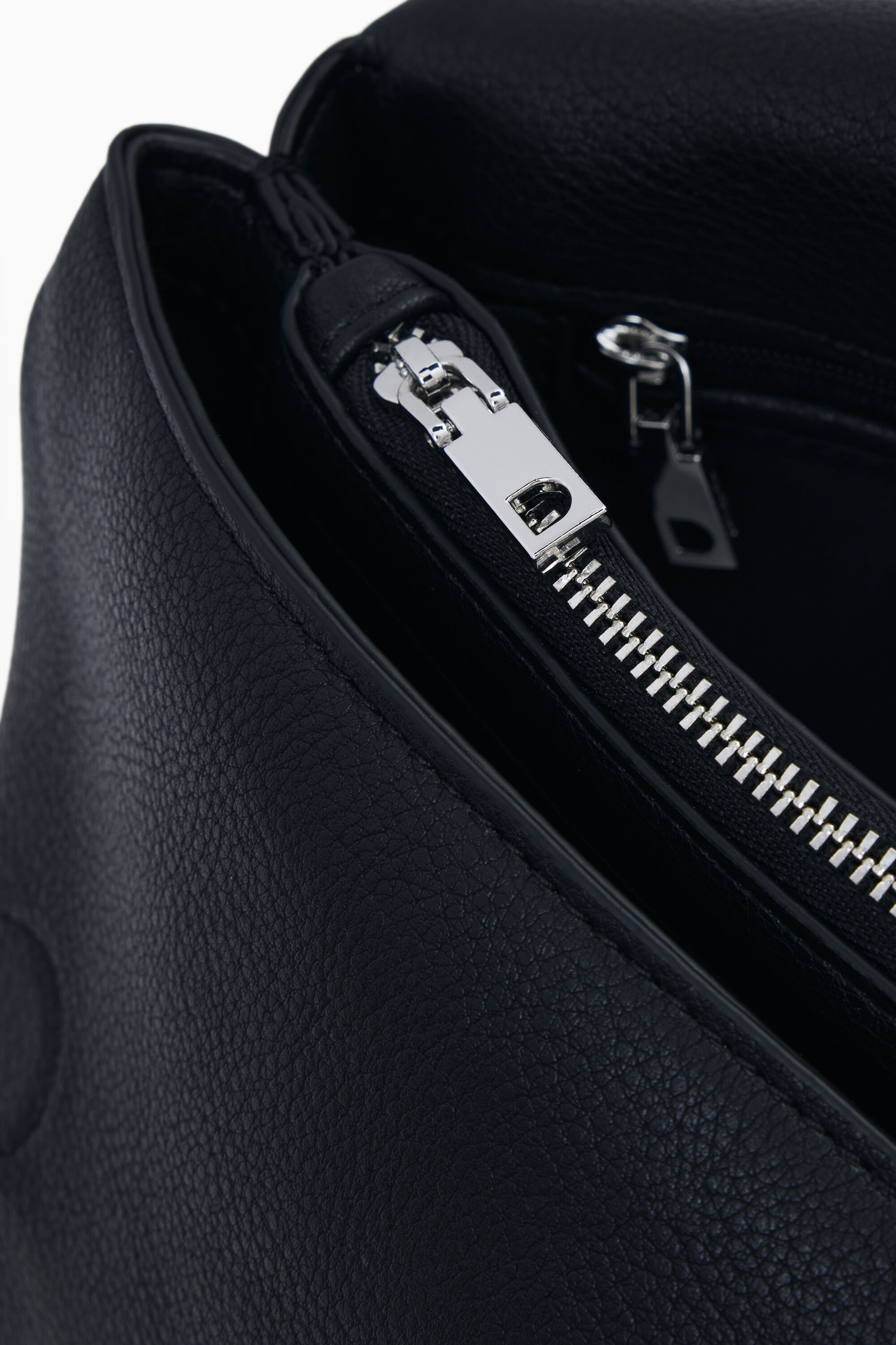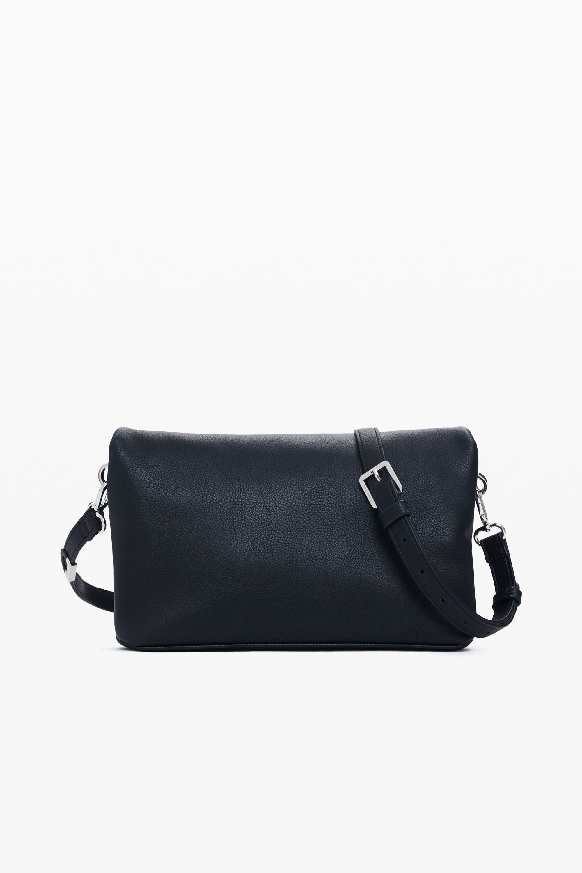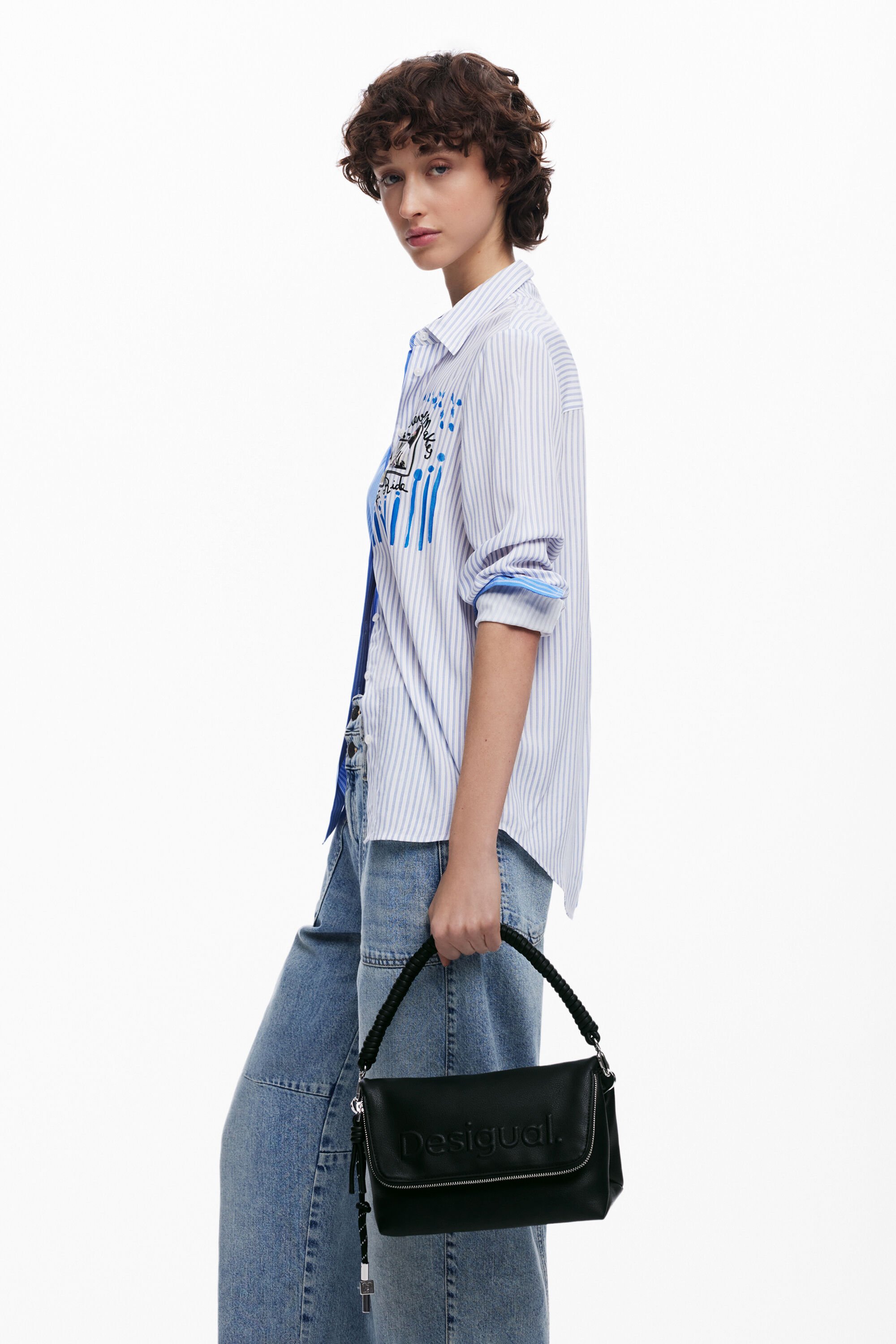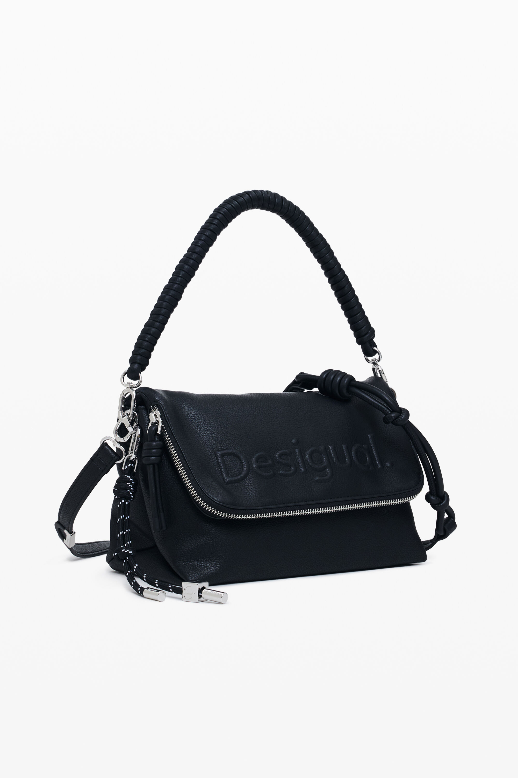 Crossbody bag in faux leather fabric, with flap, multiple compartments, interchangeable handles, and 3D effect logo in solid color.