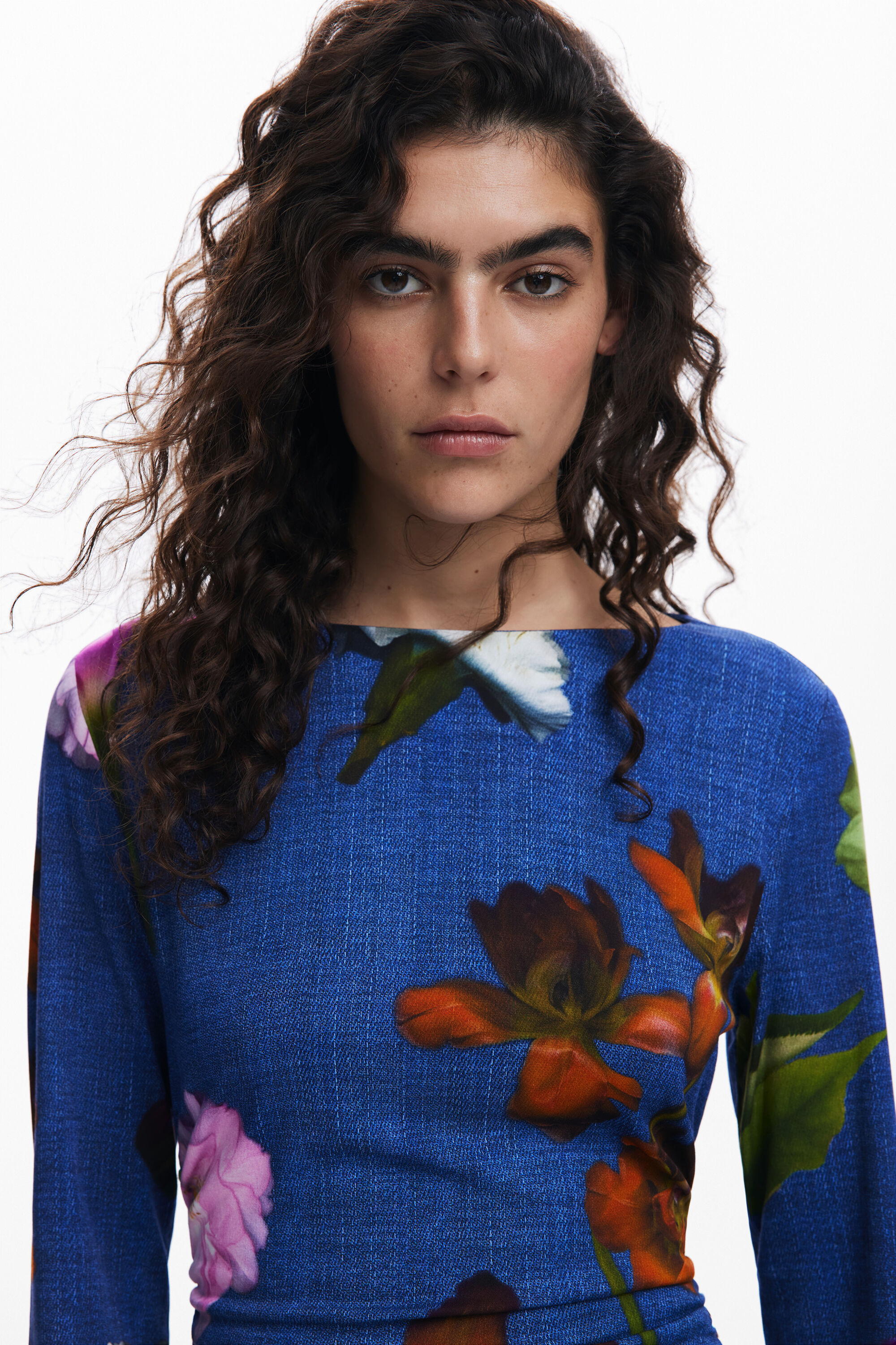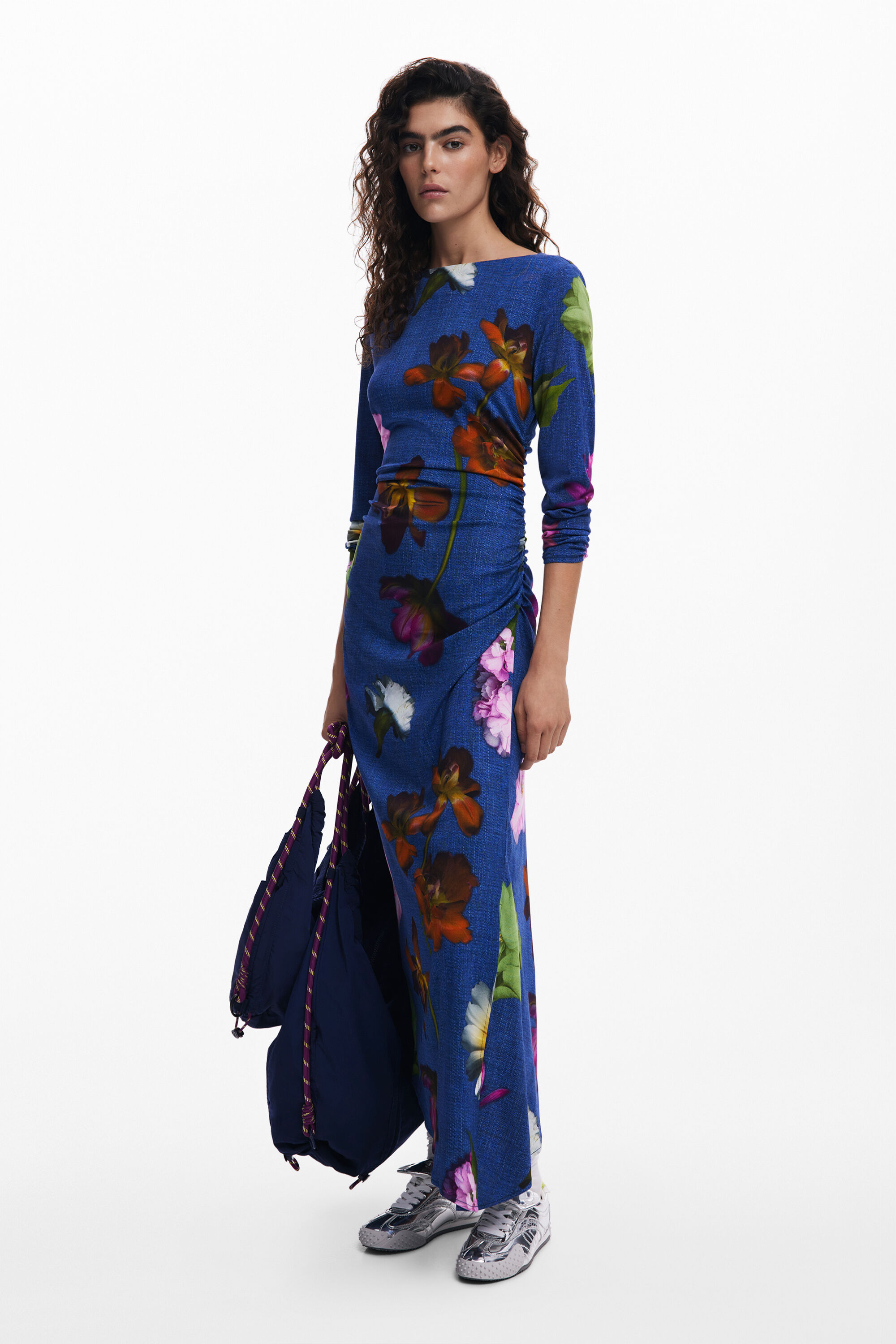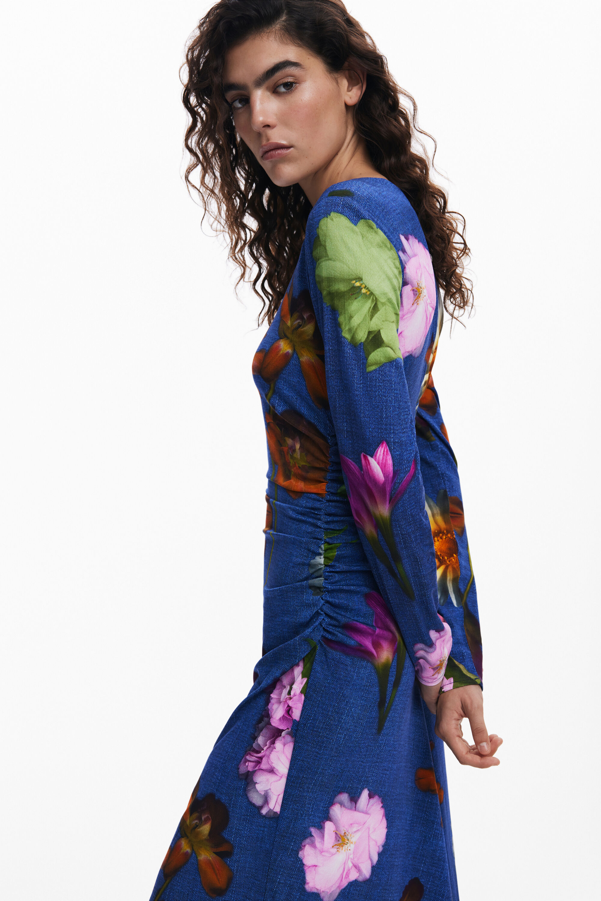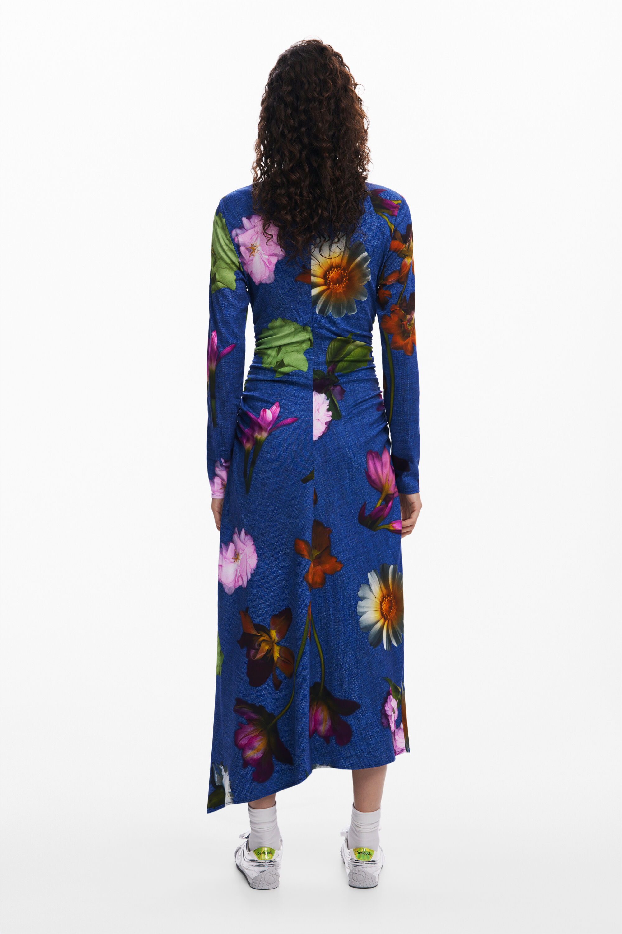Long-sleeve midi dress with an asymmetrical hem, side draping, and large floral print.Length: