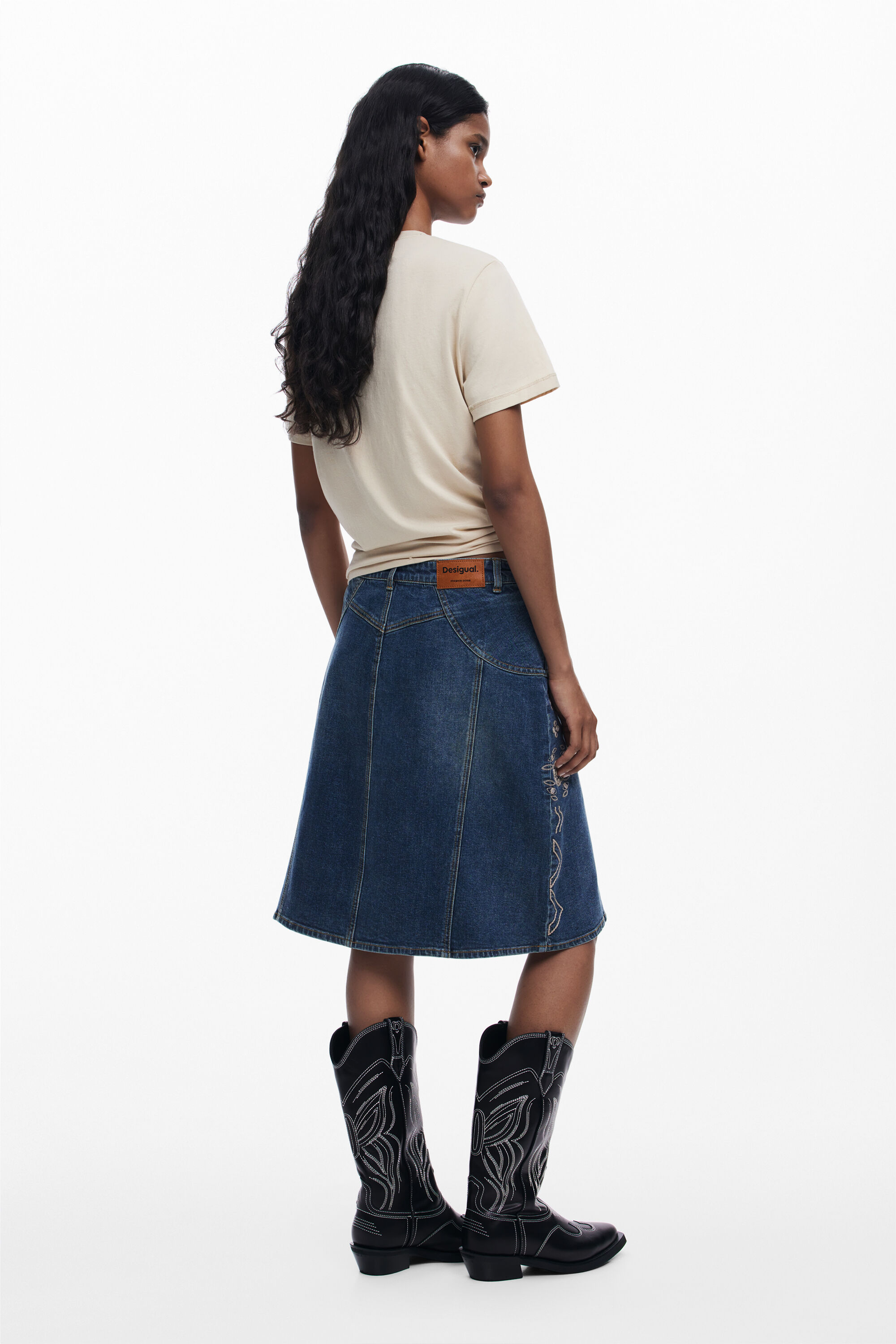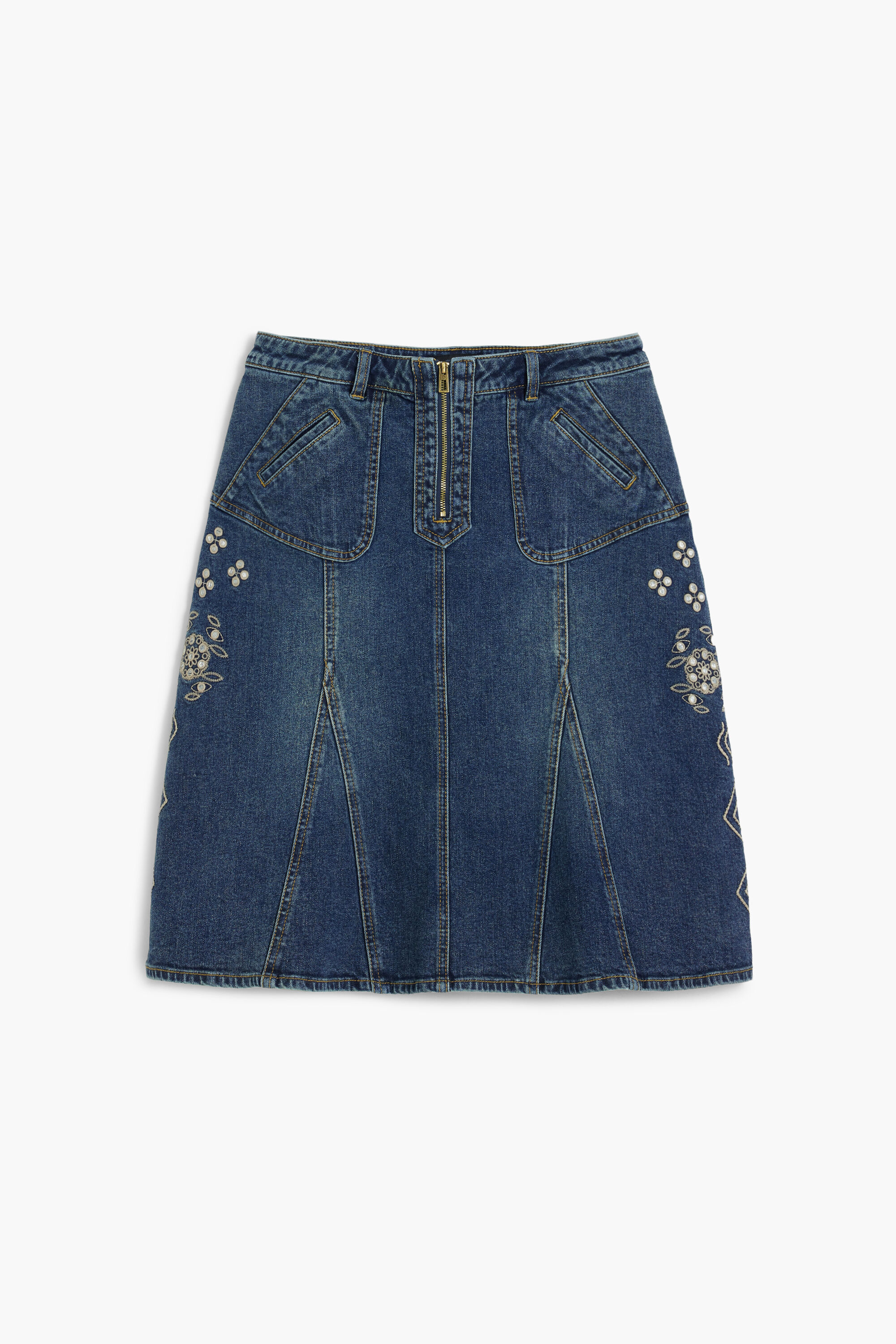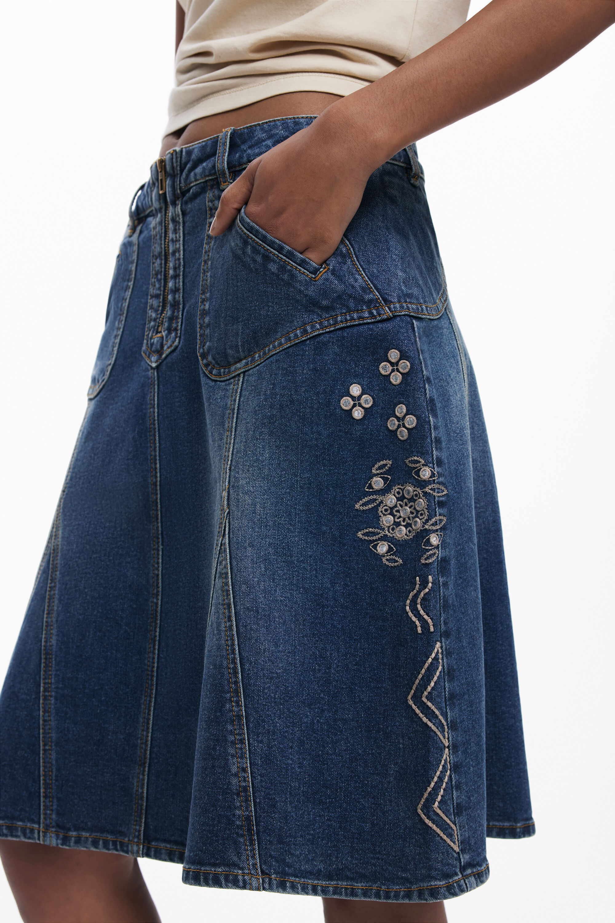 Knee-length skirt with godets in denim and embroidered details.Fit: