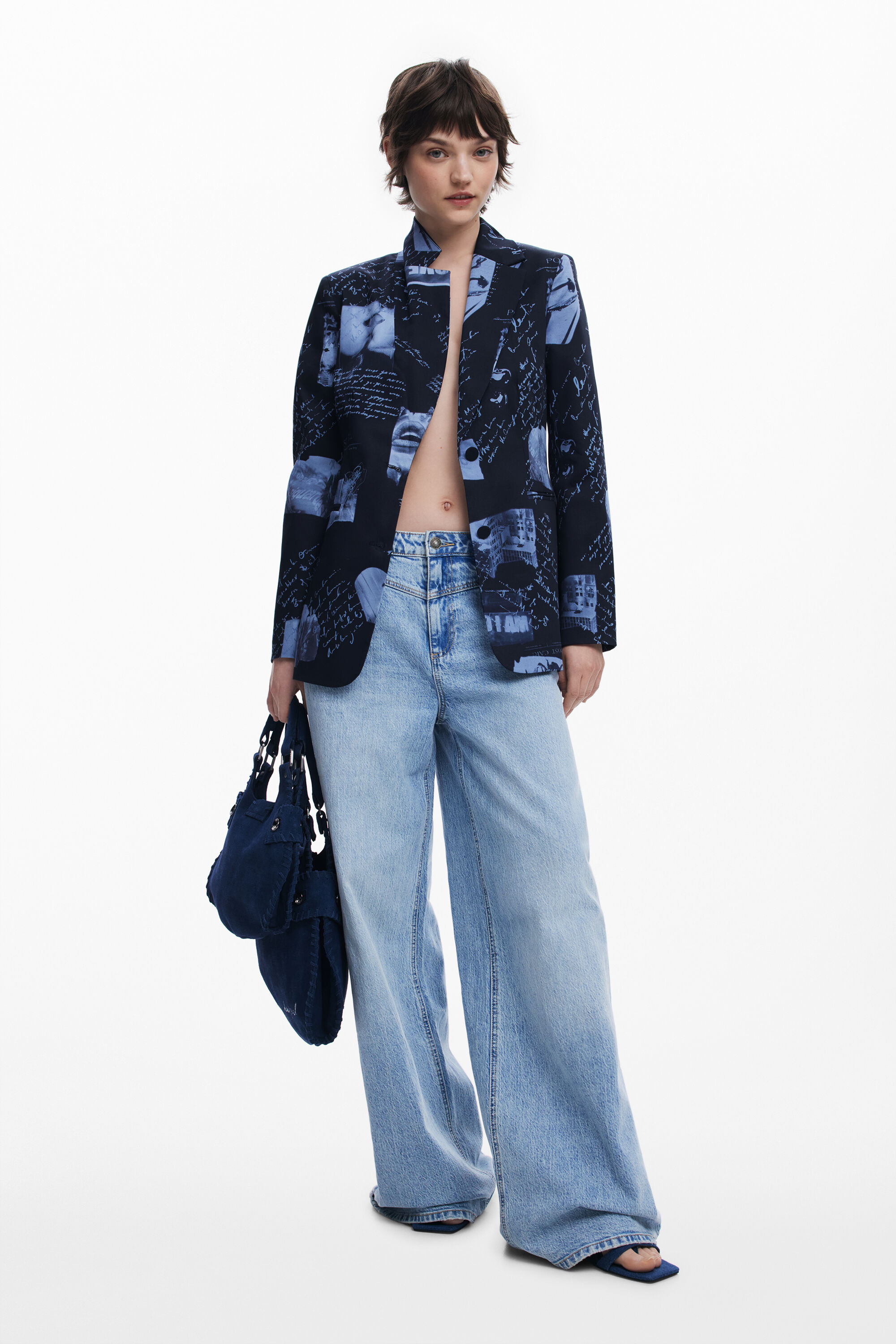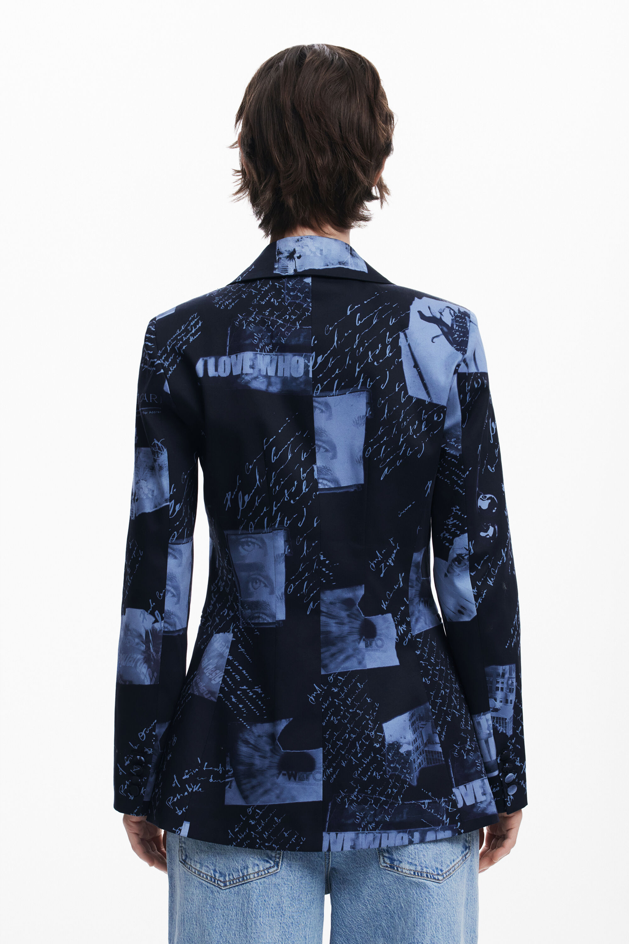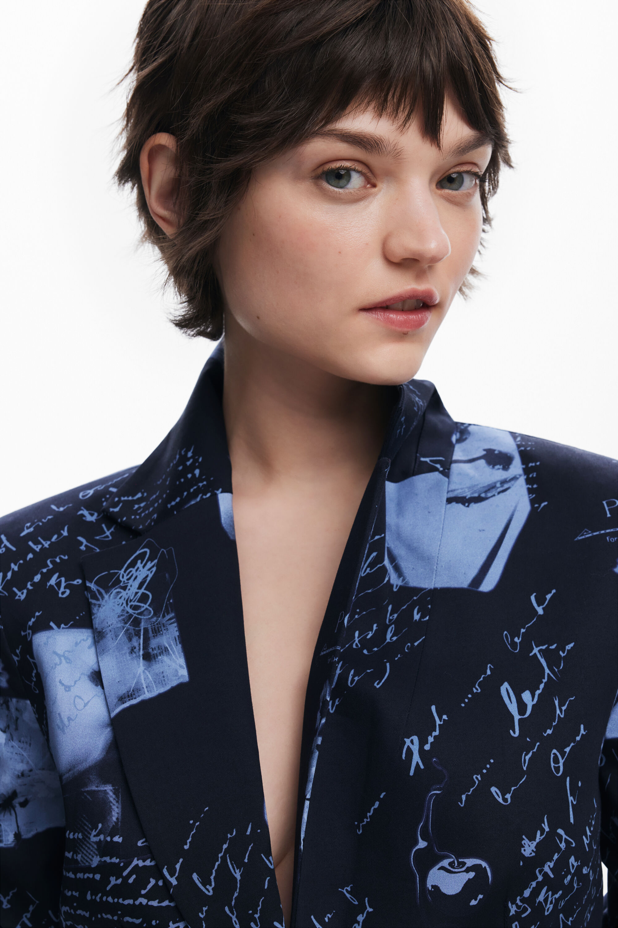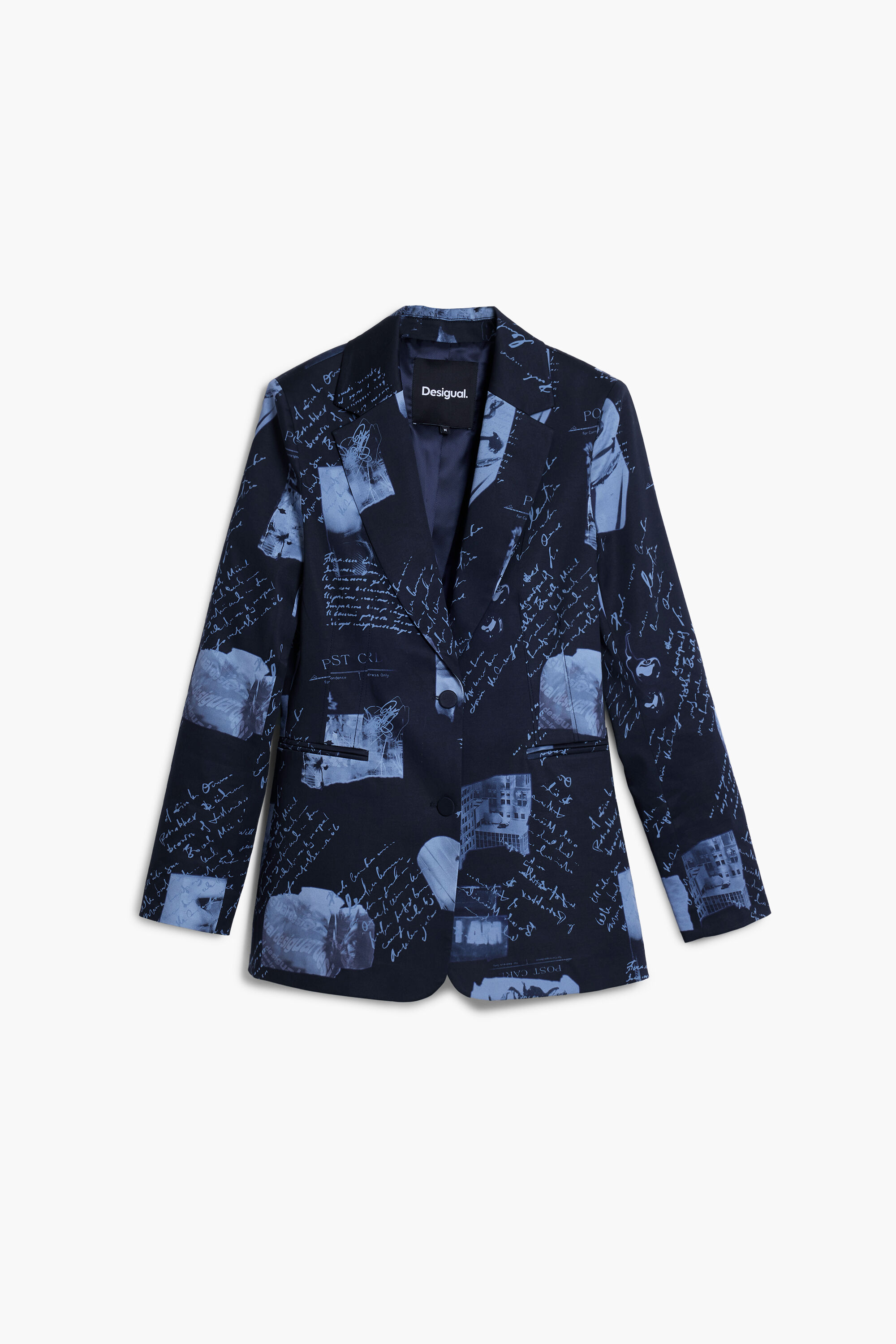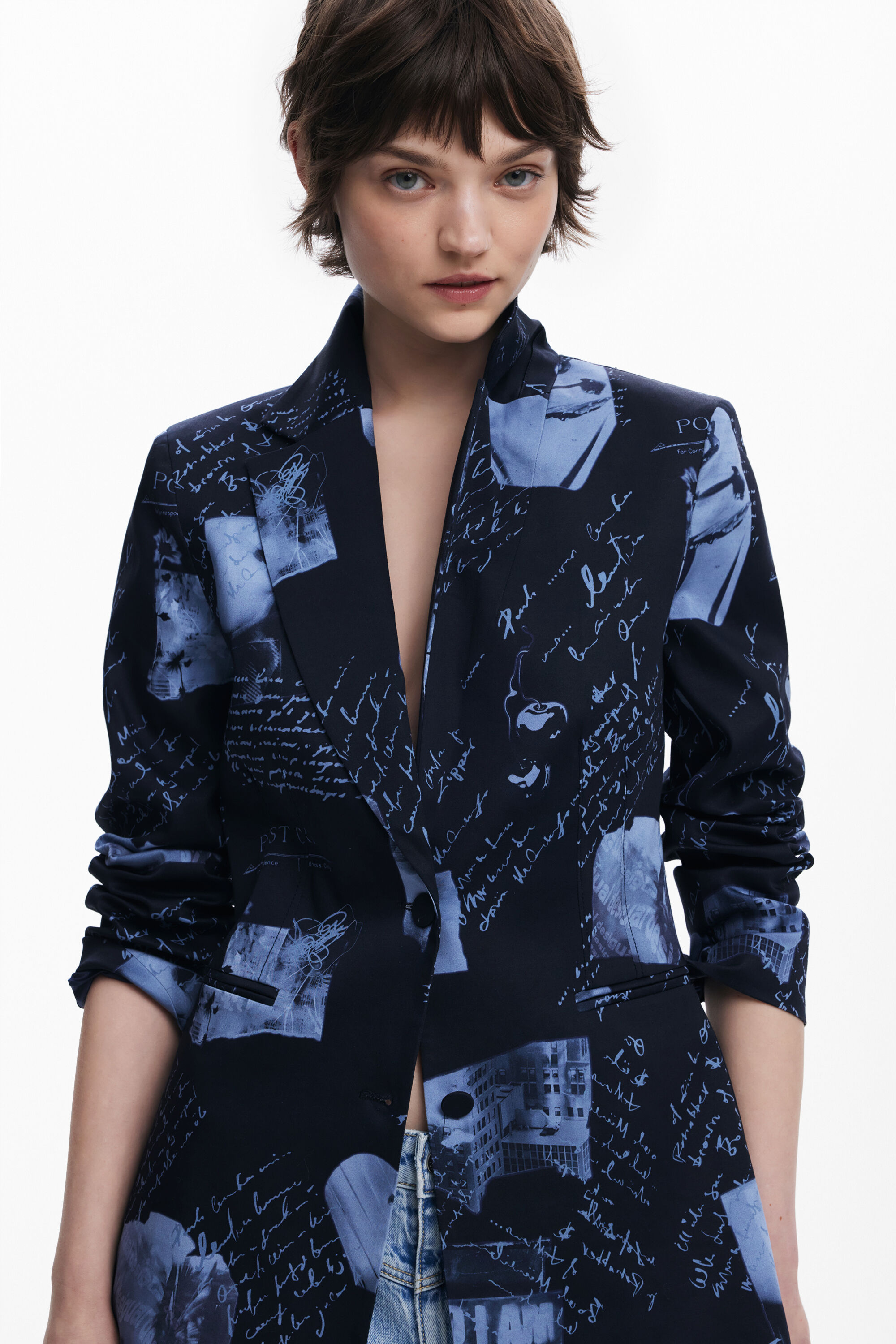 Blazer-style jacket with front pockets and a collage-style print in contrasting blue tones.
