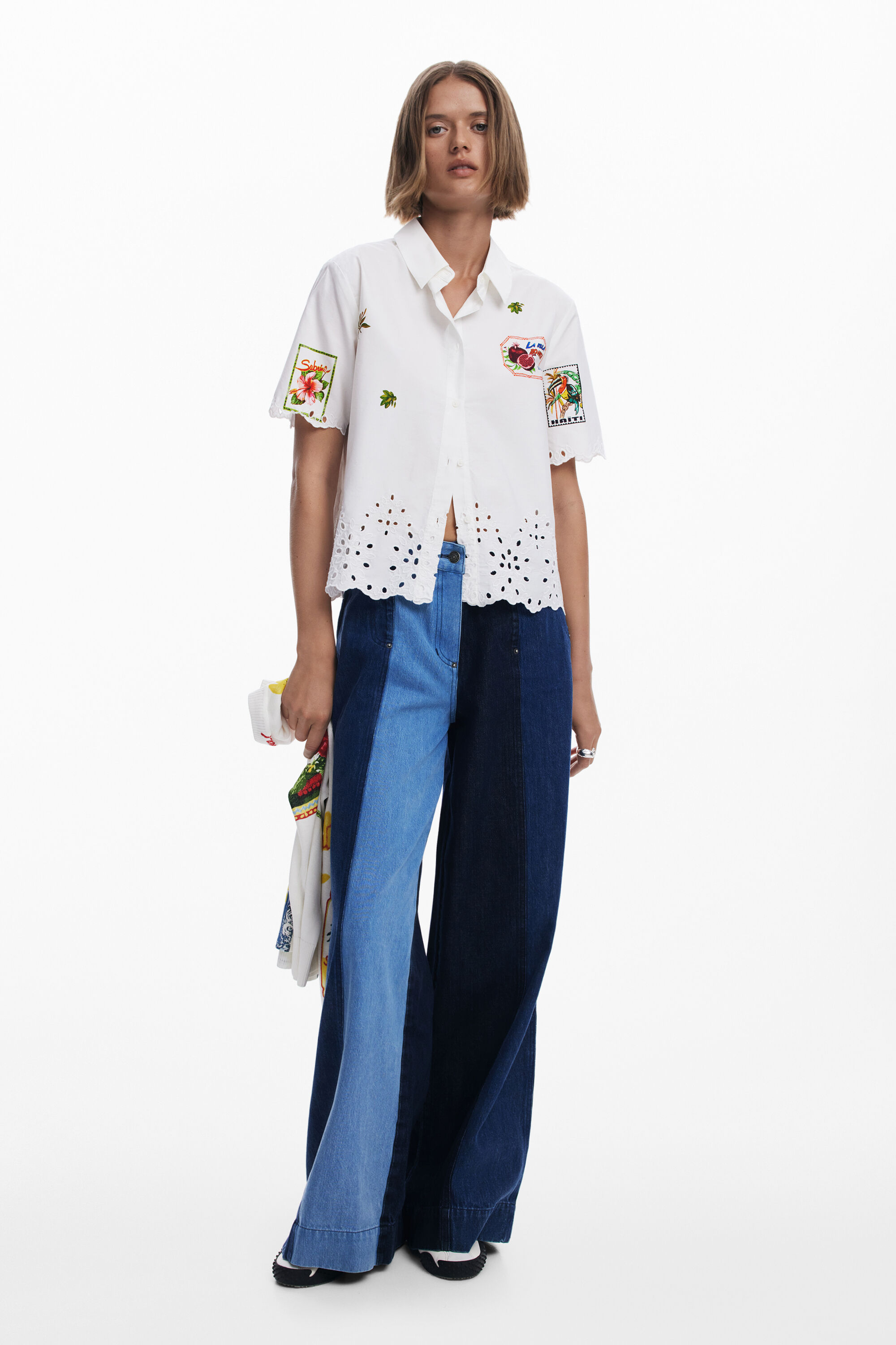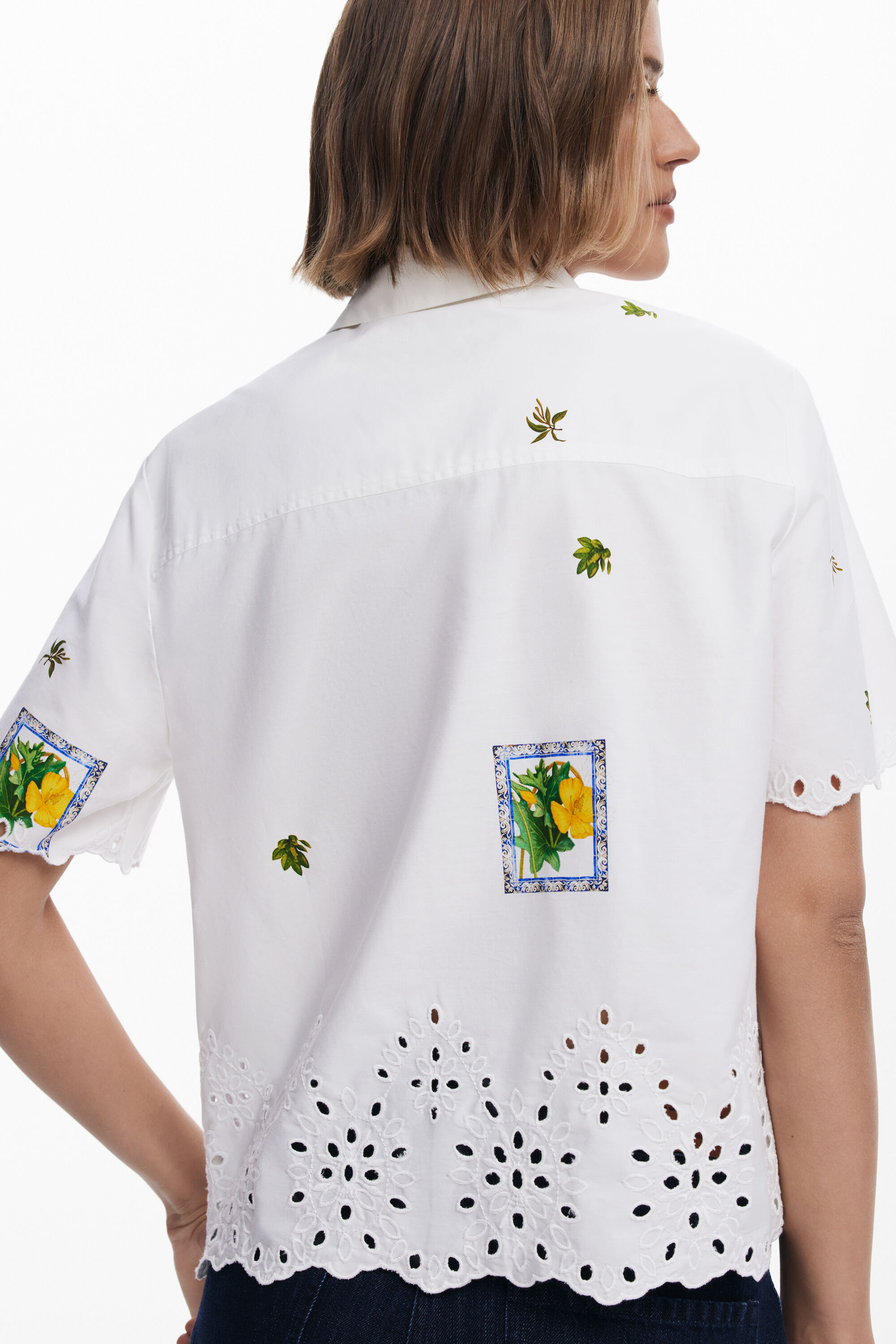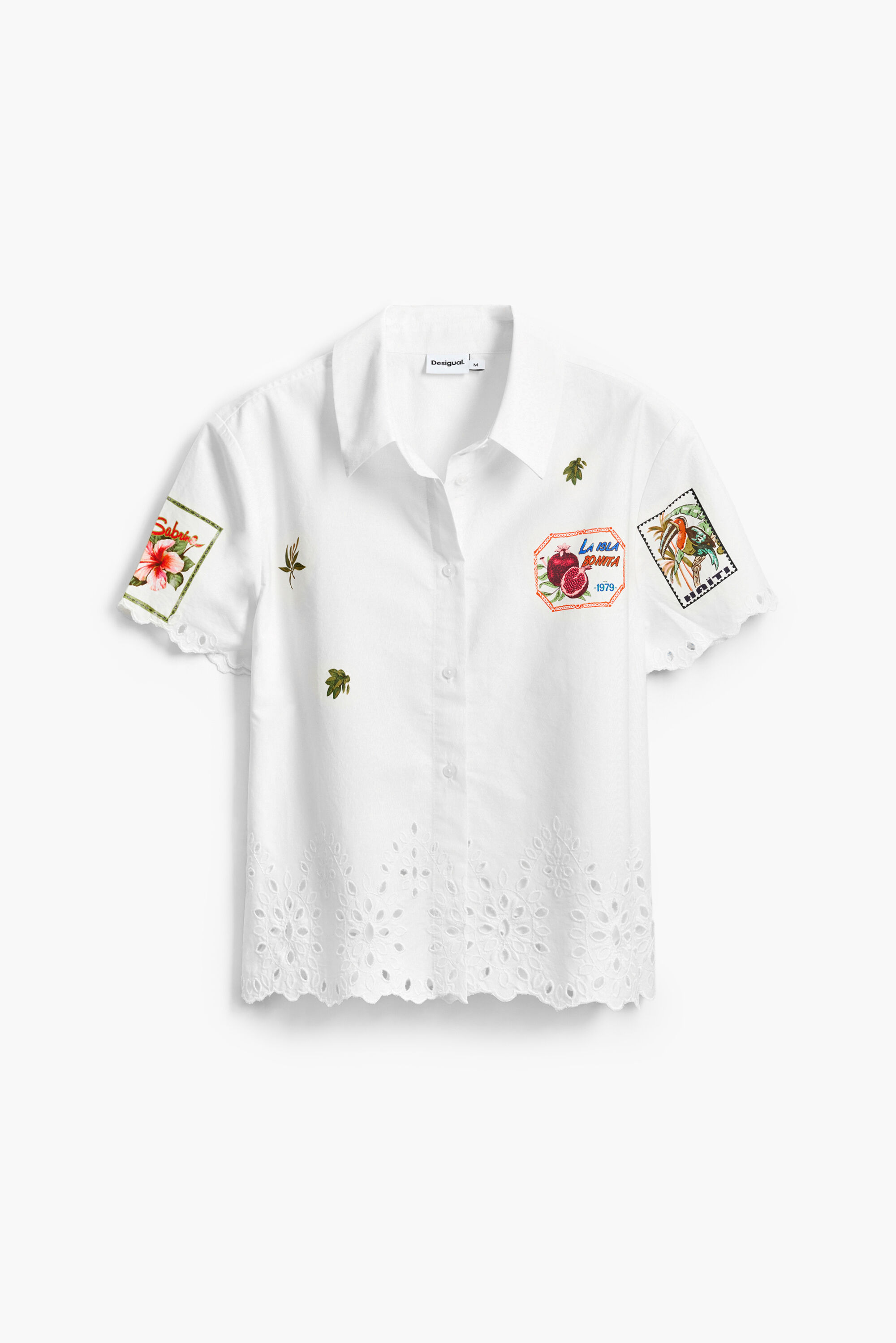 Long-sleeve shirt with a plain background and floral details and patches with perforation at the bottom and button closure