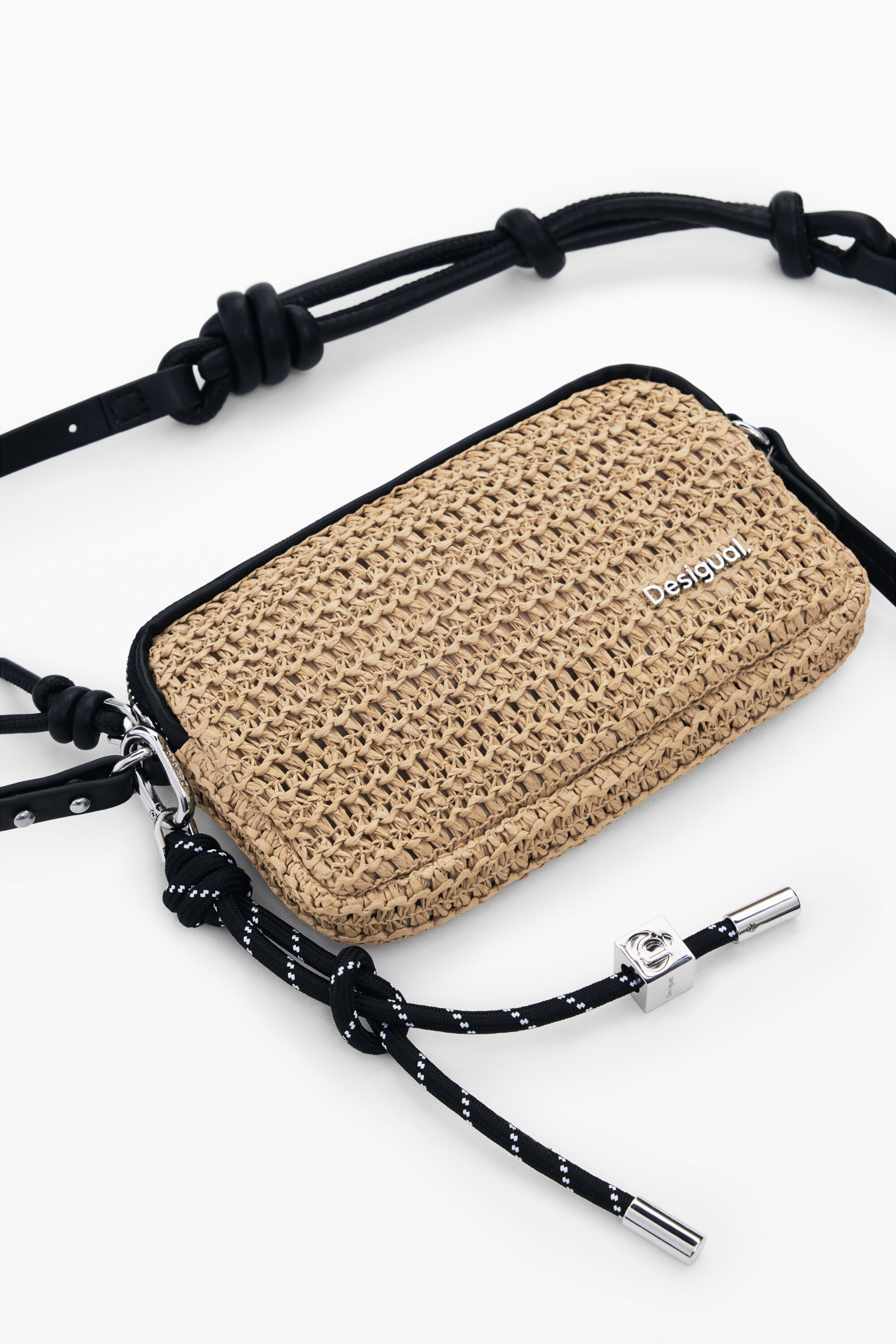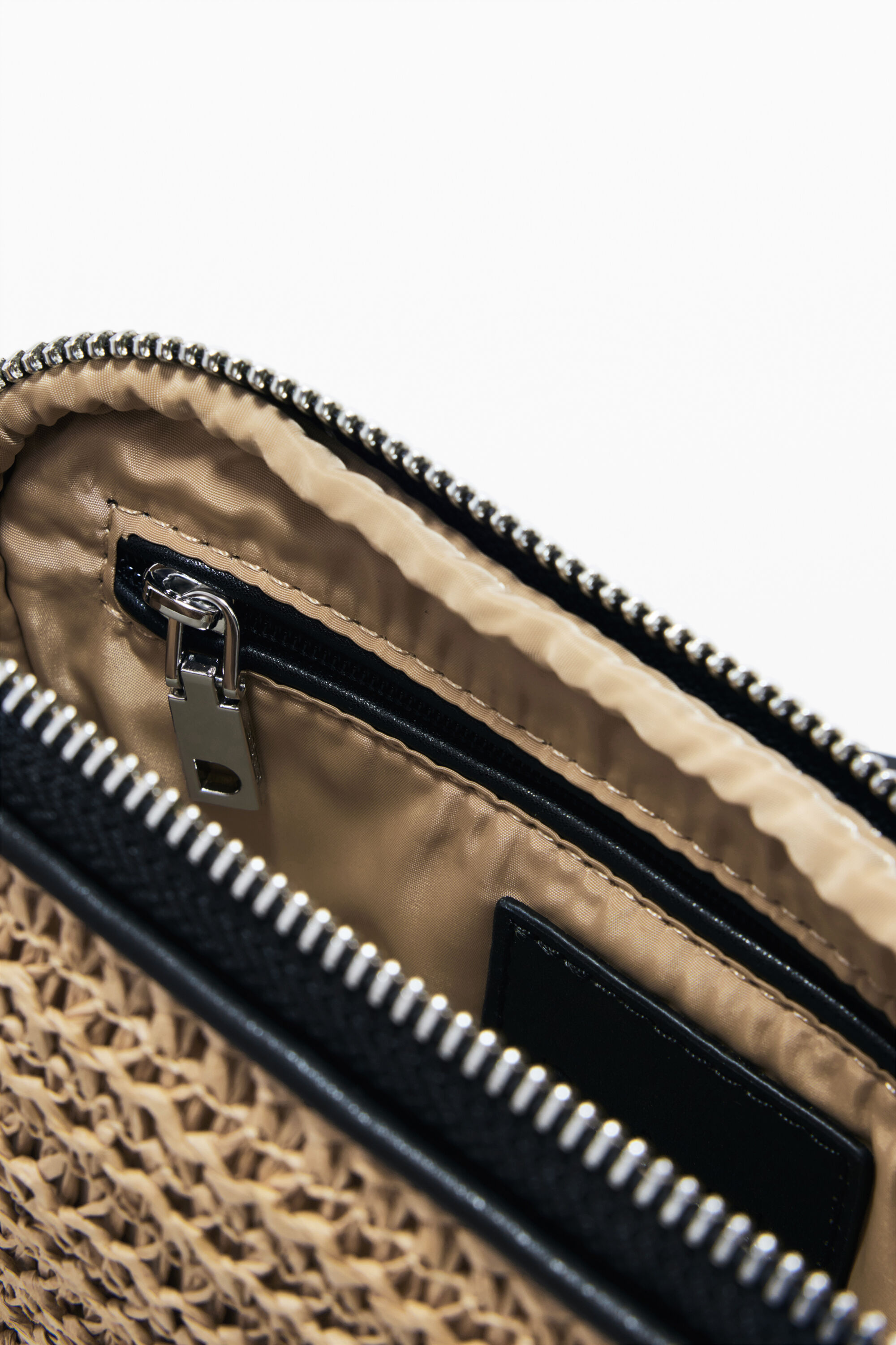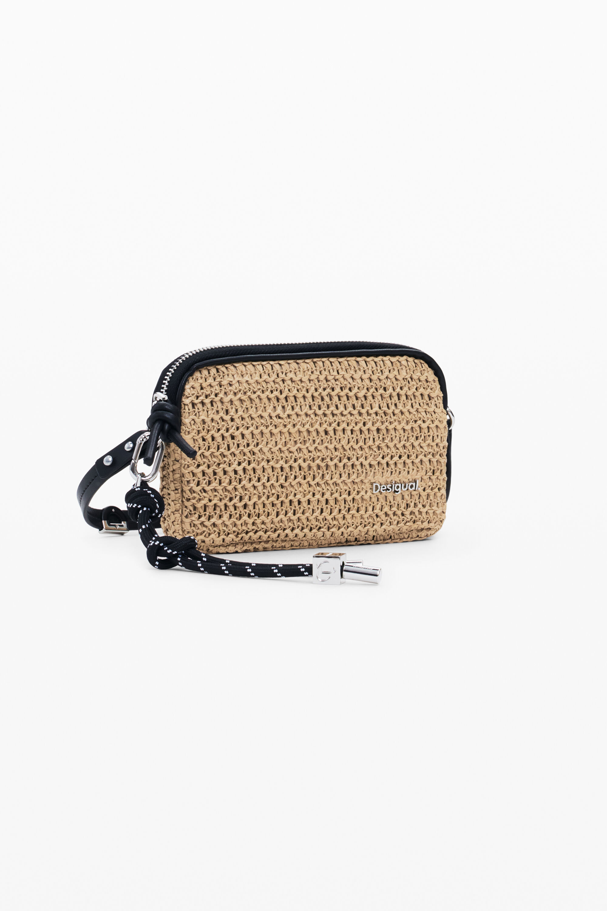 Medium wallet with adjustable strap to wear as a crossbody, made of raffia fabric with a zipper closure and metallic logo.Multiple interior pocketsZipper closureDetachable handleRaffia fabricDesigned in BarcelonaFSC paperMeasurements: 18.5 x 3.5 x 1 1 cm