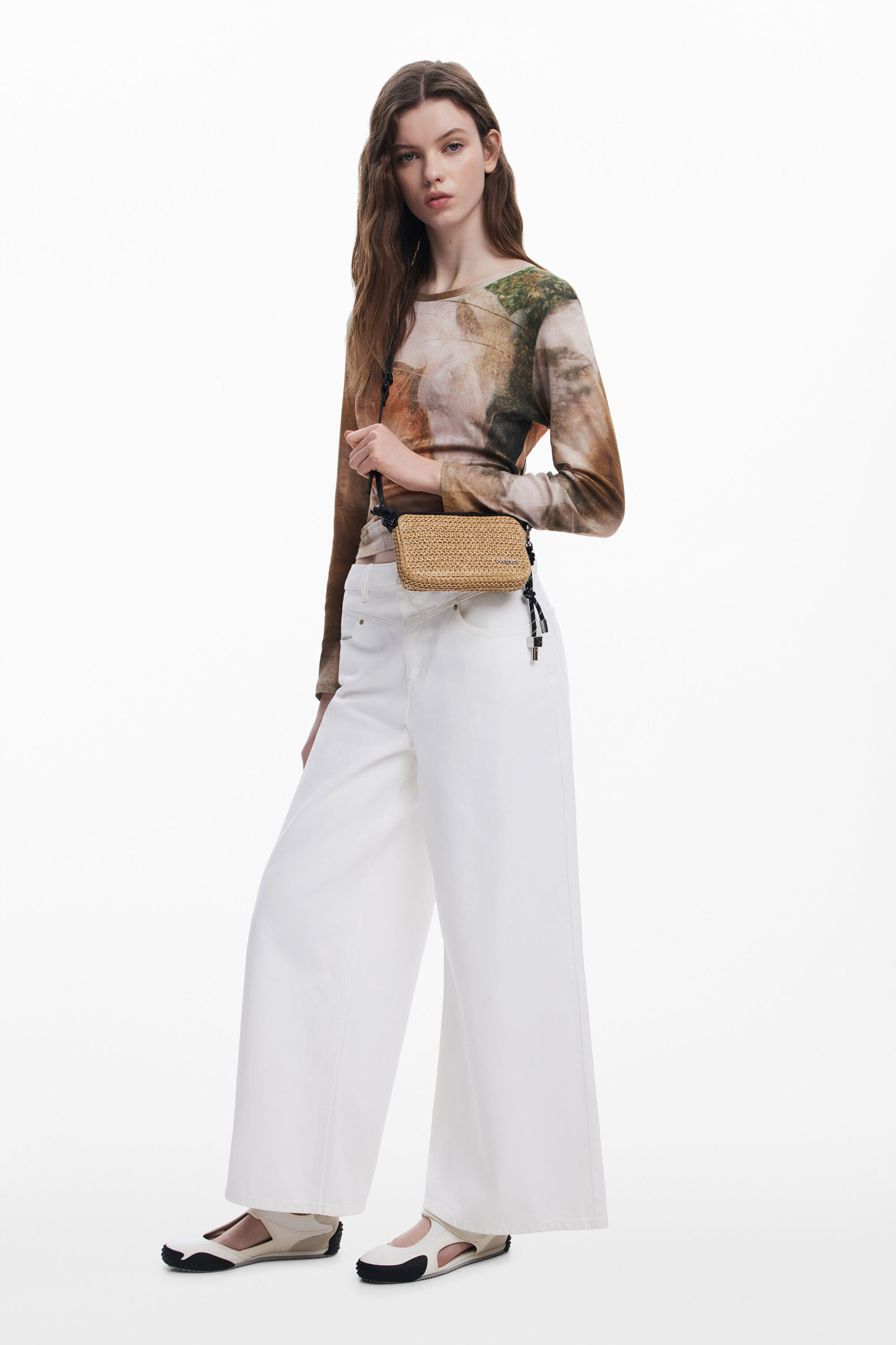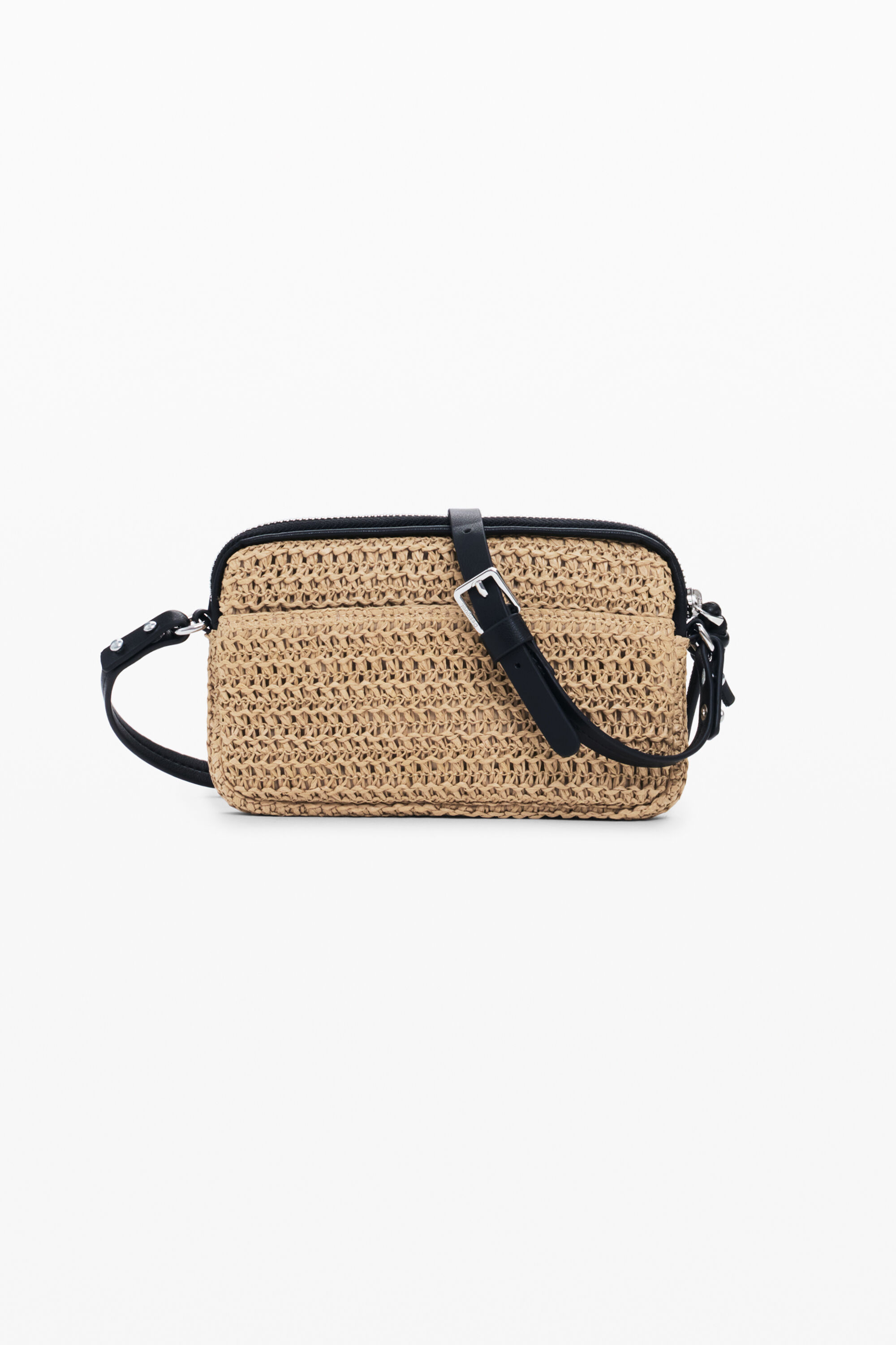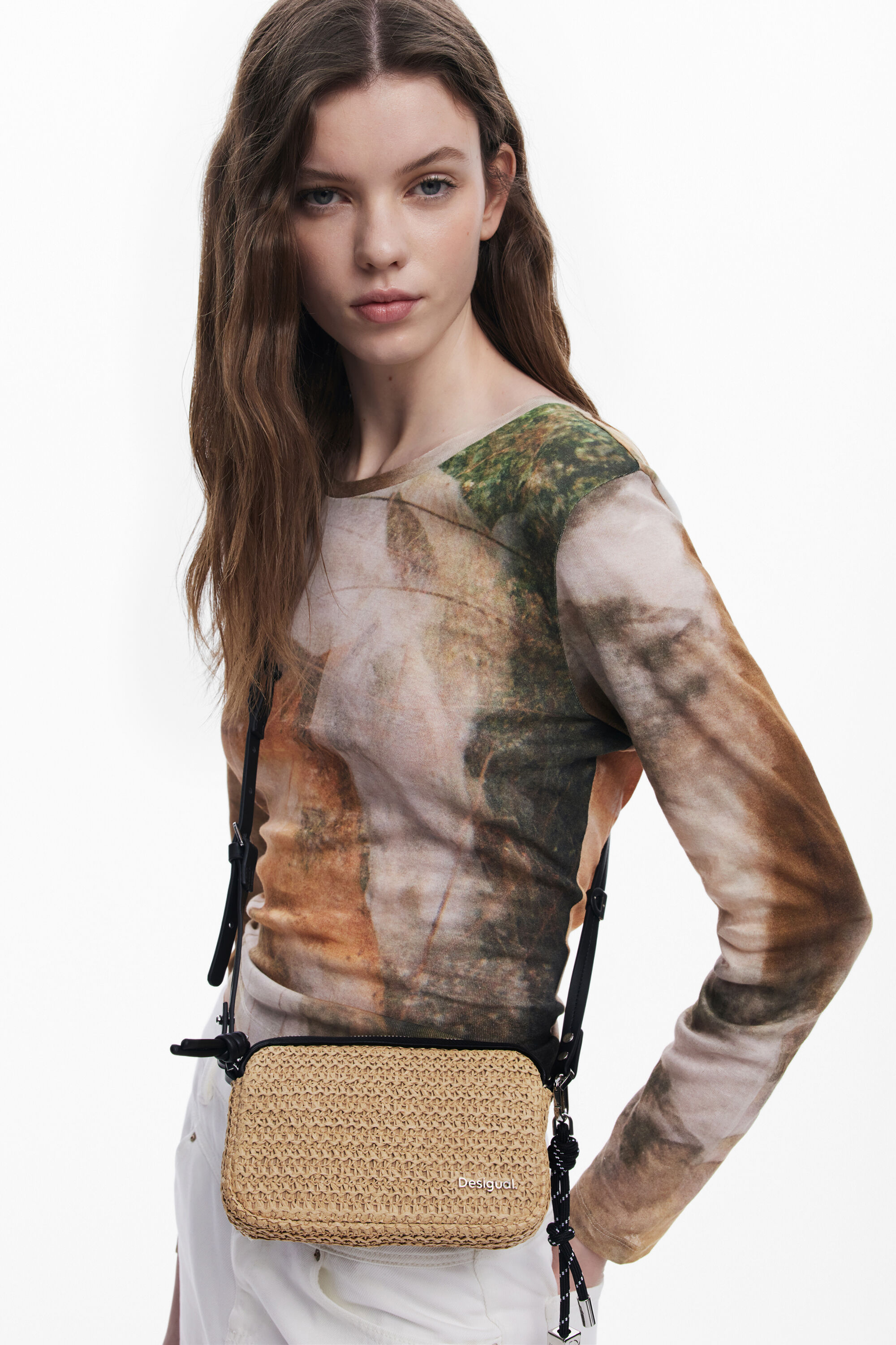 Medium wallet with adjustable strap to wear as a crossbody, made of raffia fabric with a zipper closure and metallic logo.Multiple interior pocketsZipper closureDetachable handleRaffia fabricDesigned in BarcelonaFSC paperMeasurements: 18.5 x 3.5 x 1 1 cm