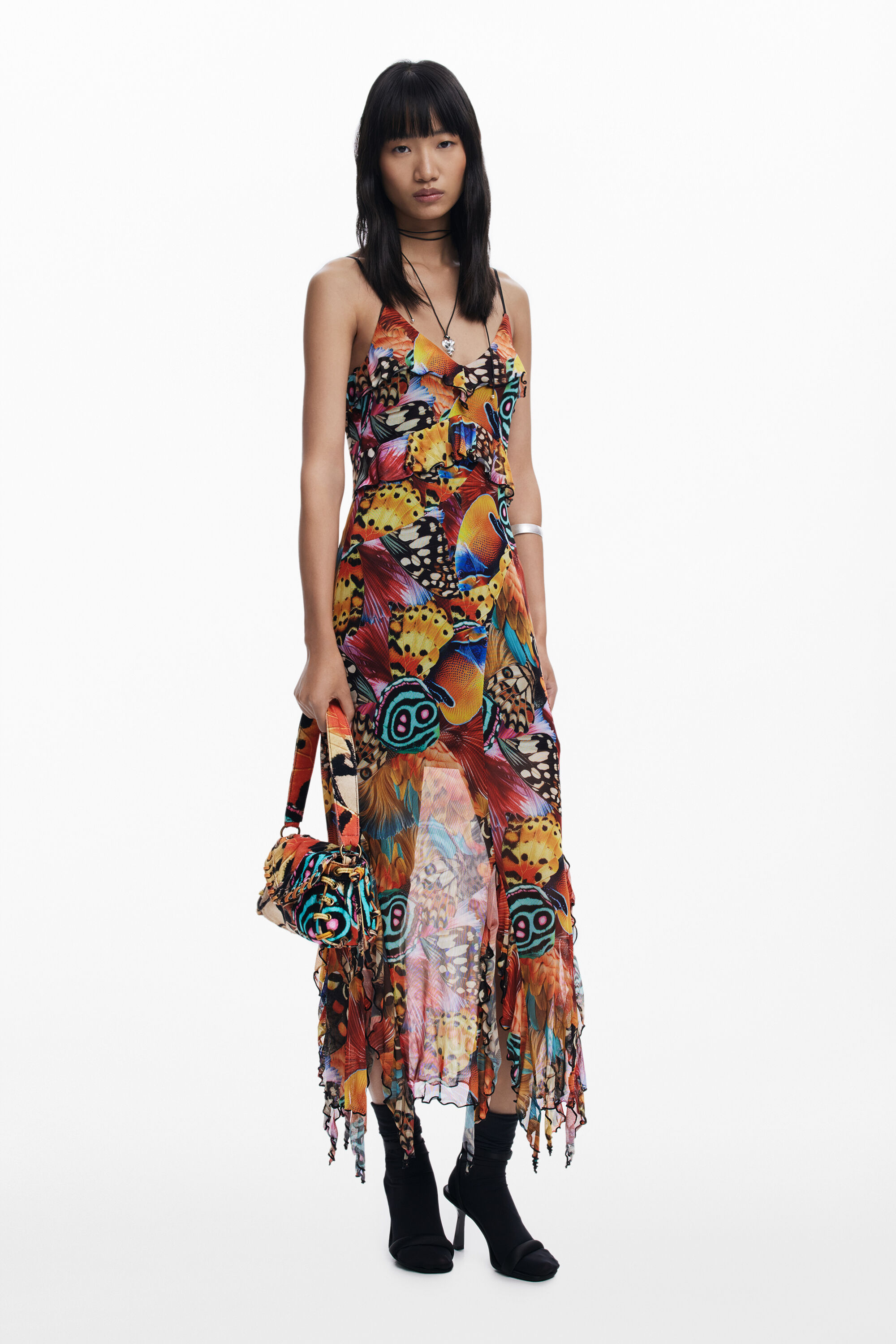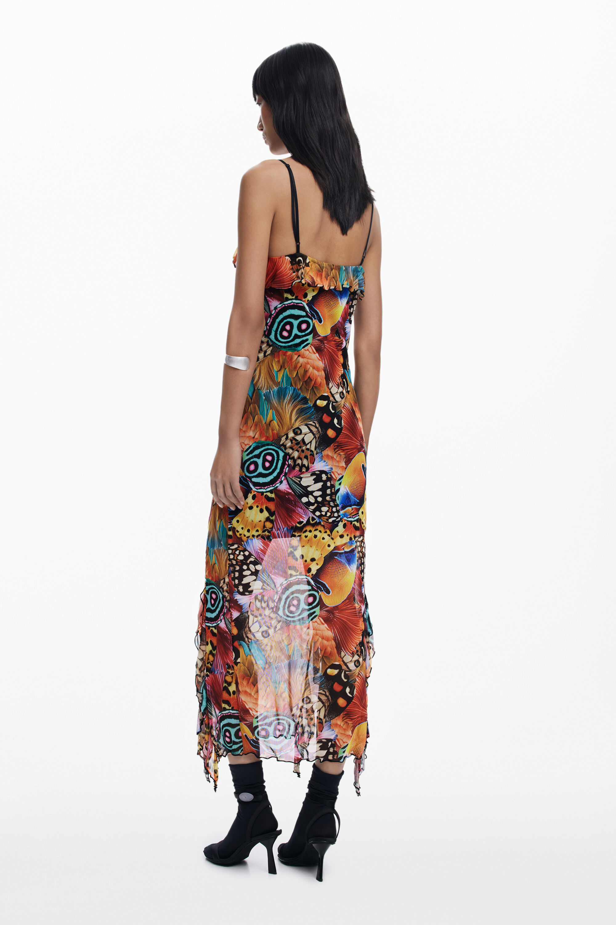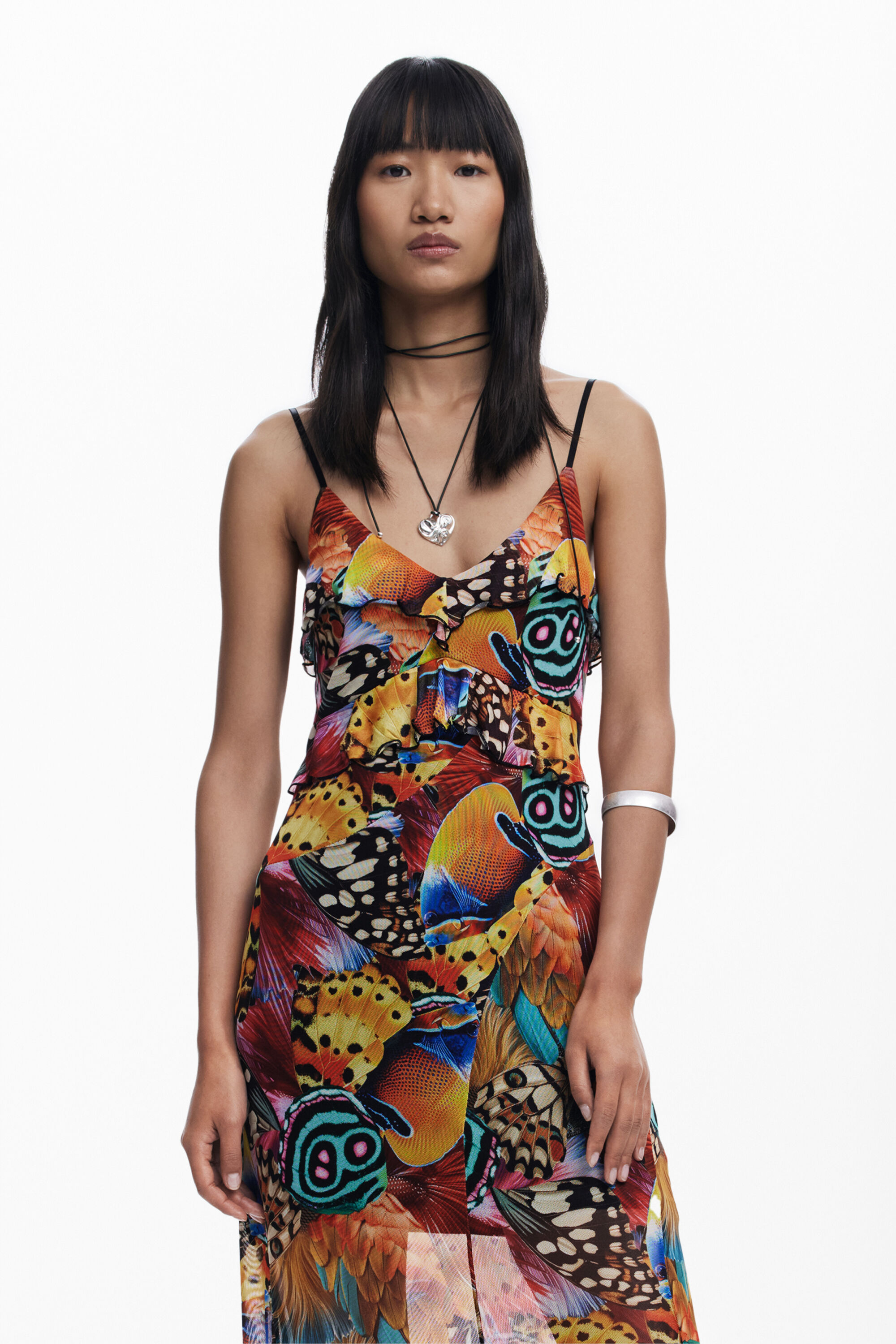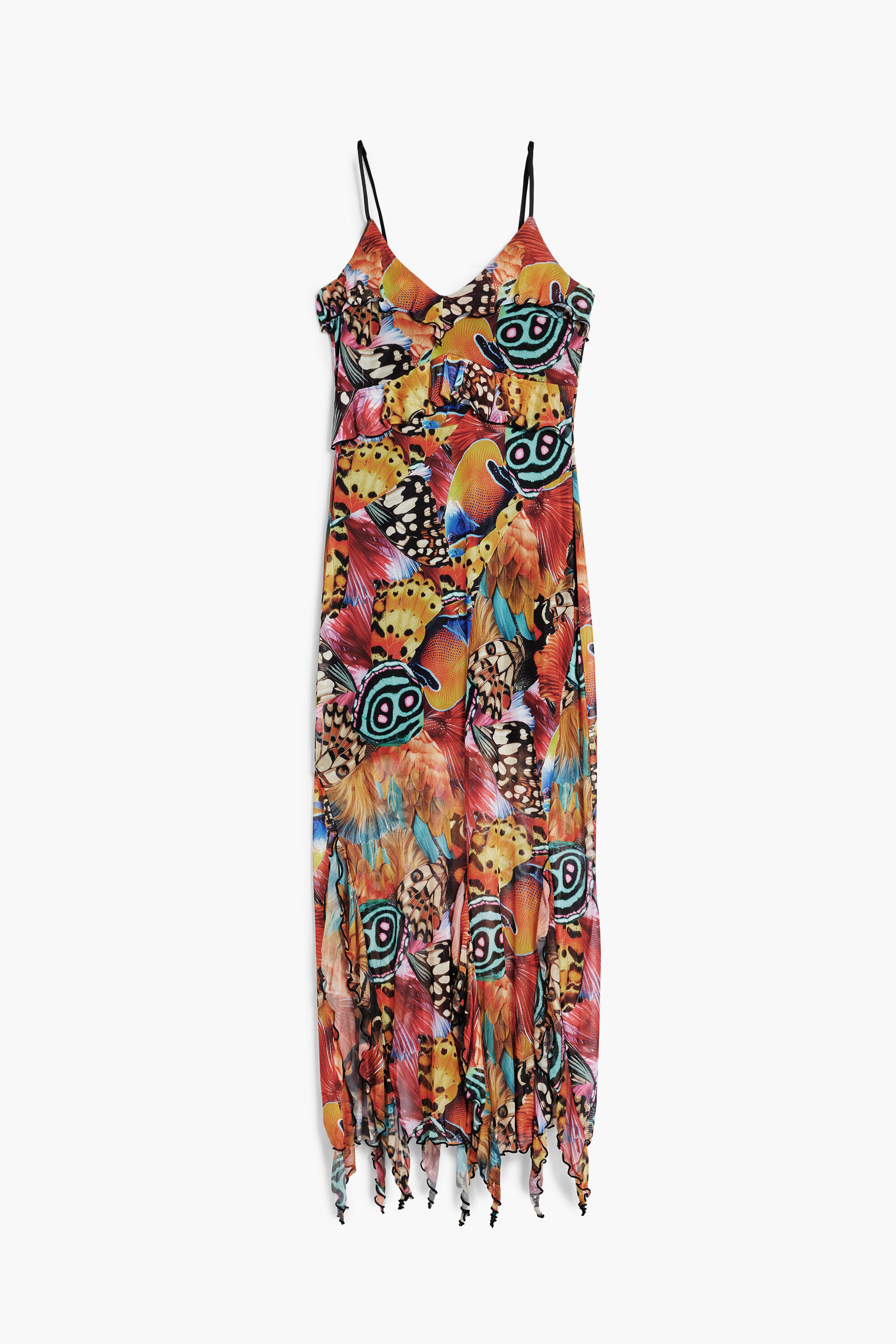 Fitted midi dress in tulle with short lining, V-neckline with ruffle detail, thin strap, asymmetric ruffle details at the hem, and butterfly and feather print designed by Monsieur Christian Lacroix.Fit: SlimLength: MidiNeckline: V-neckSleevelessRecycled polyester