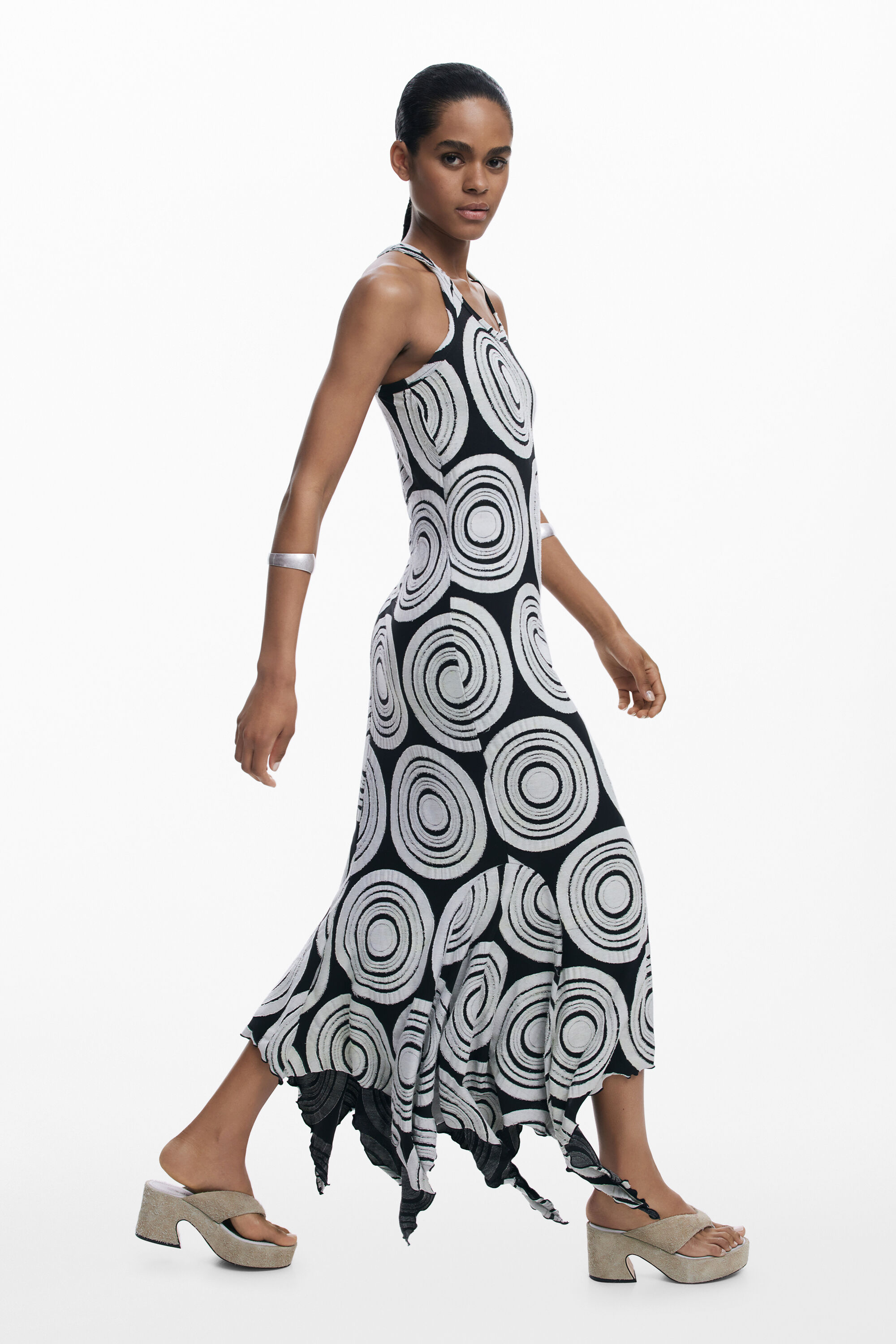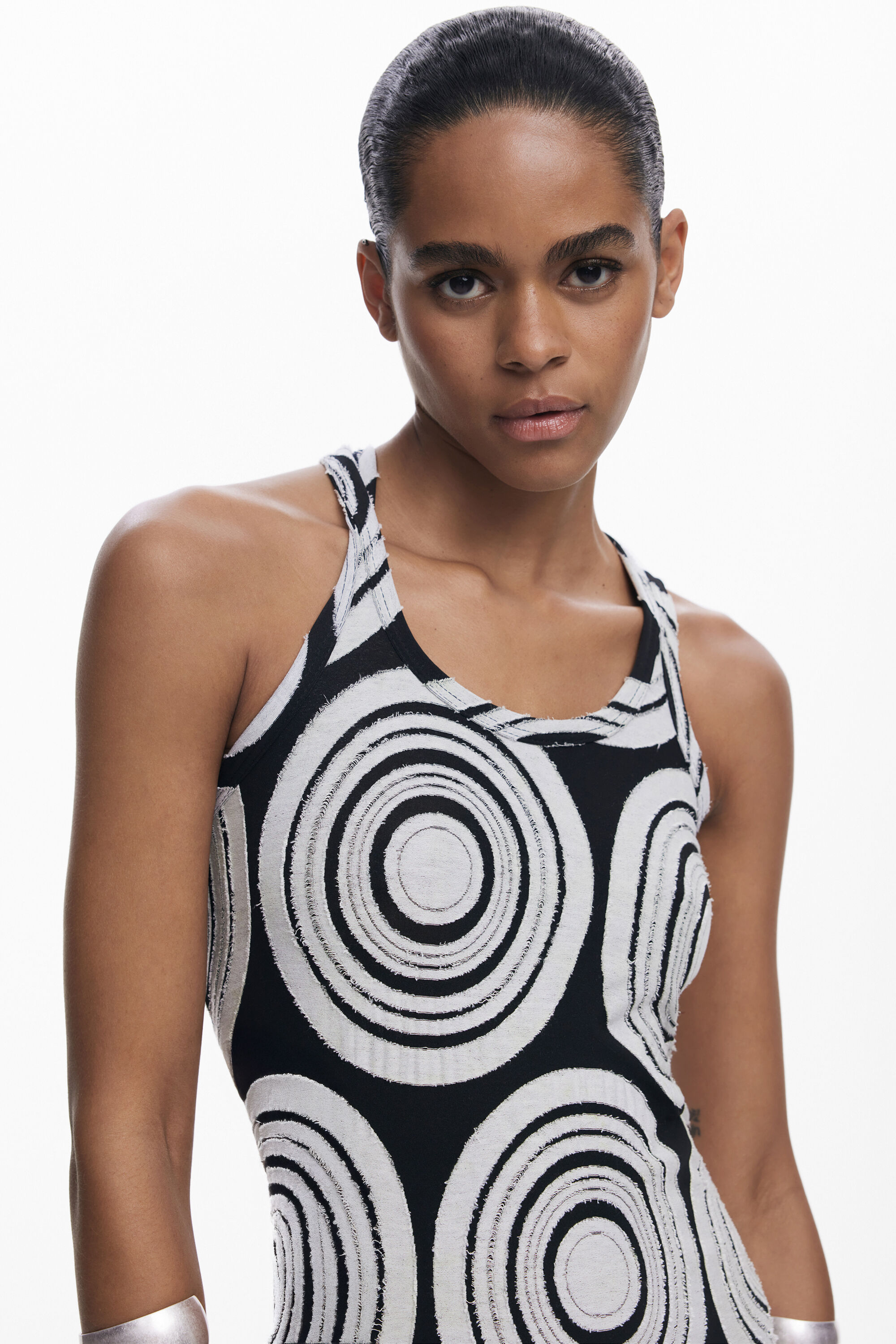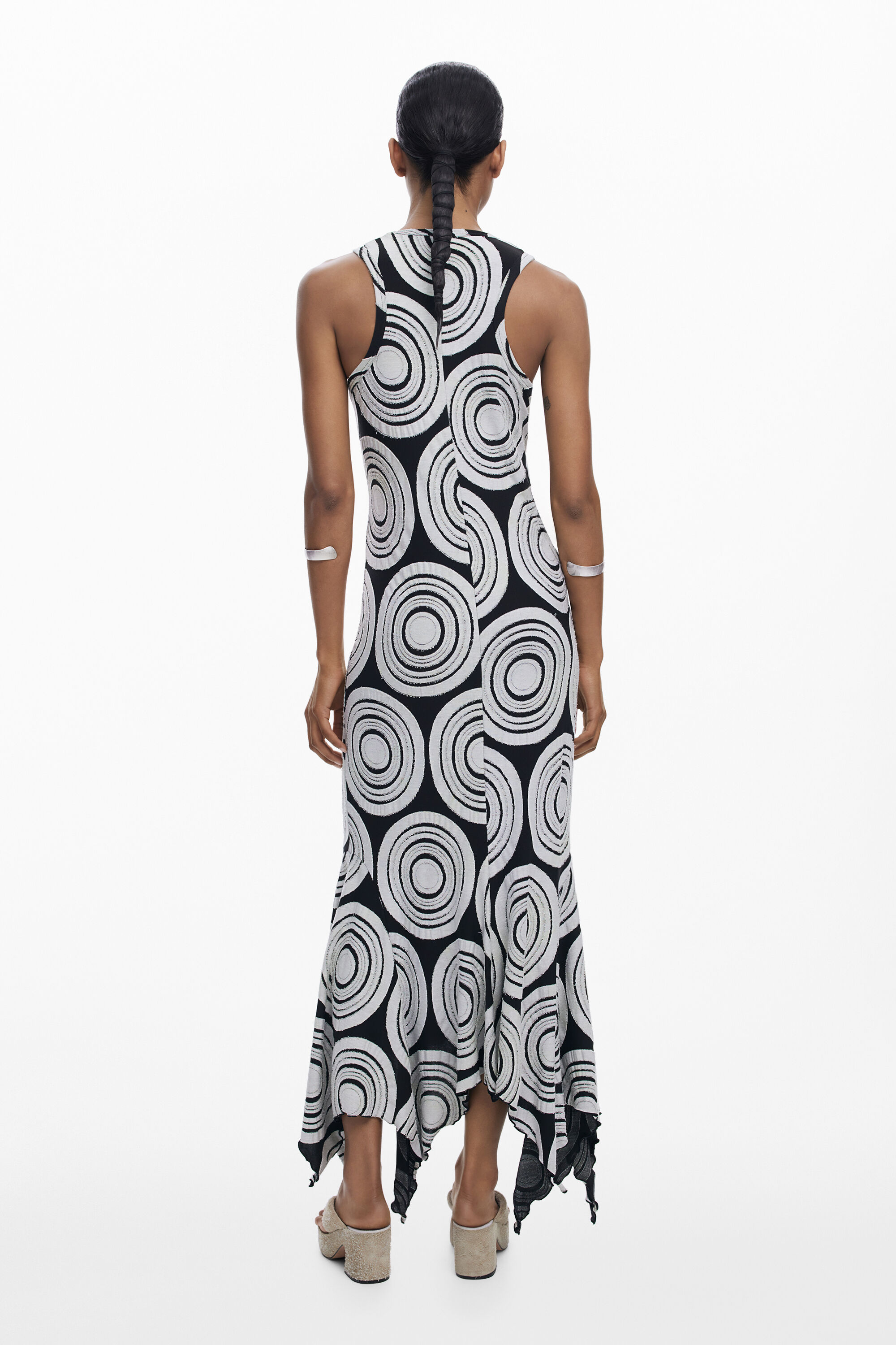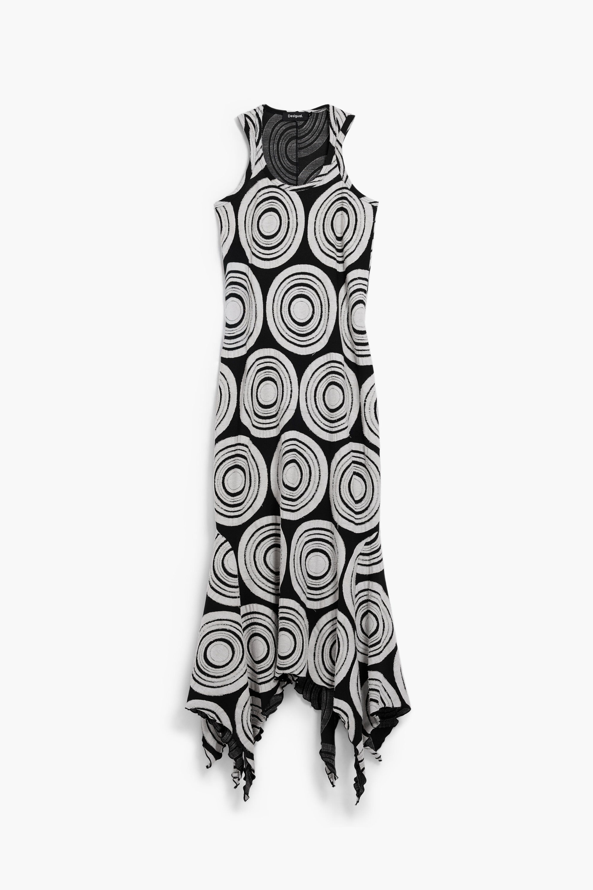 Racerback dress with an asymmetrical hem, decorative seams, and a geometric print of black and white circles.Color: