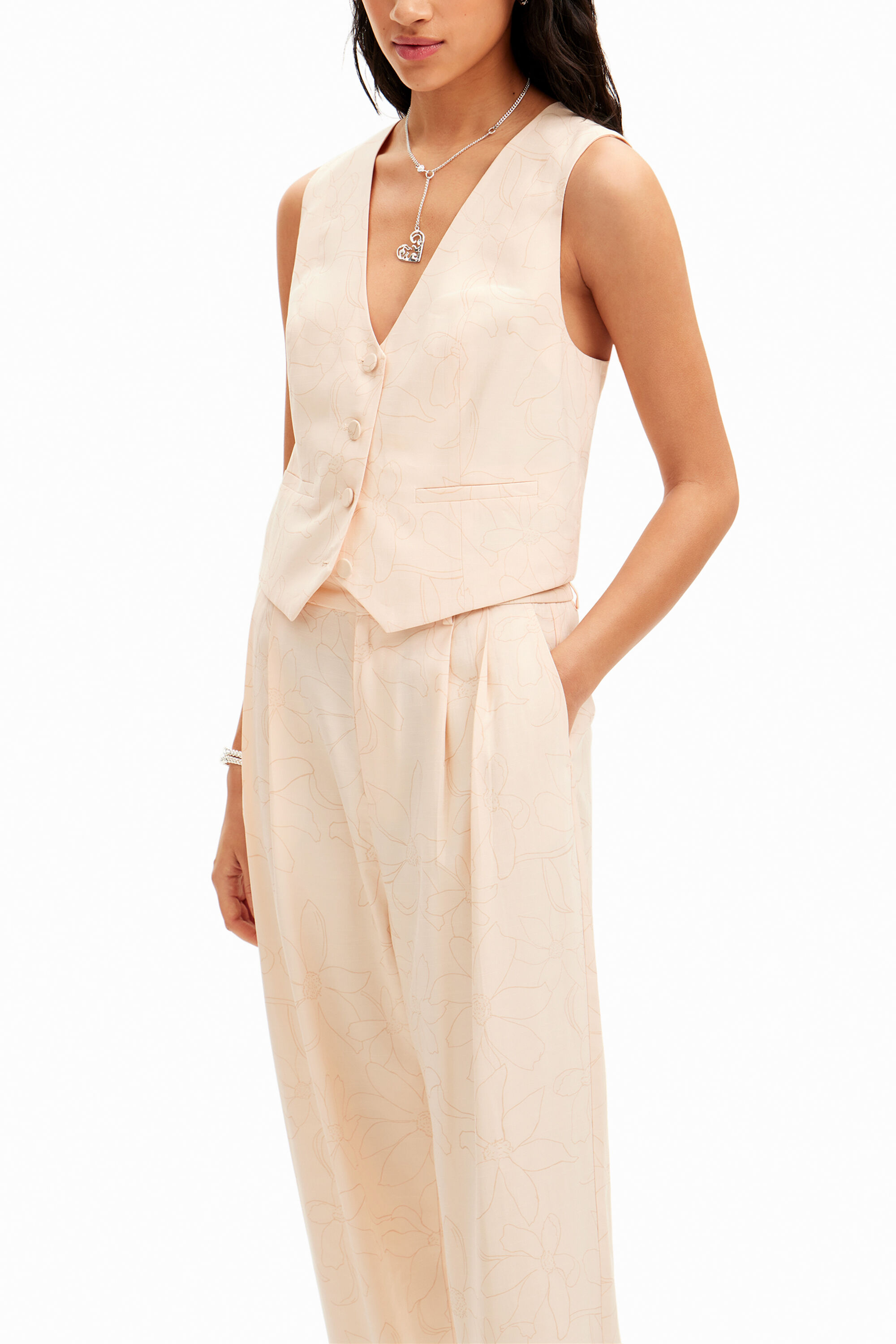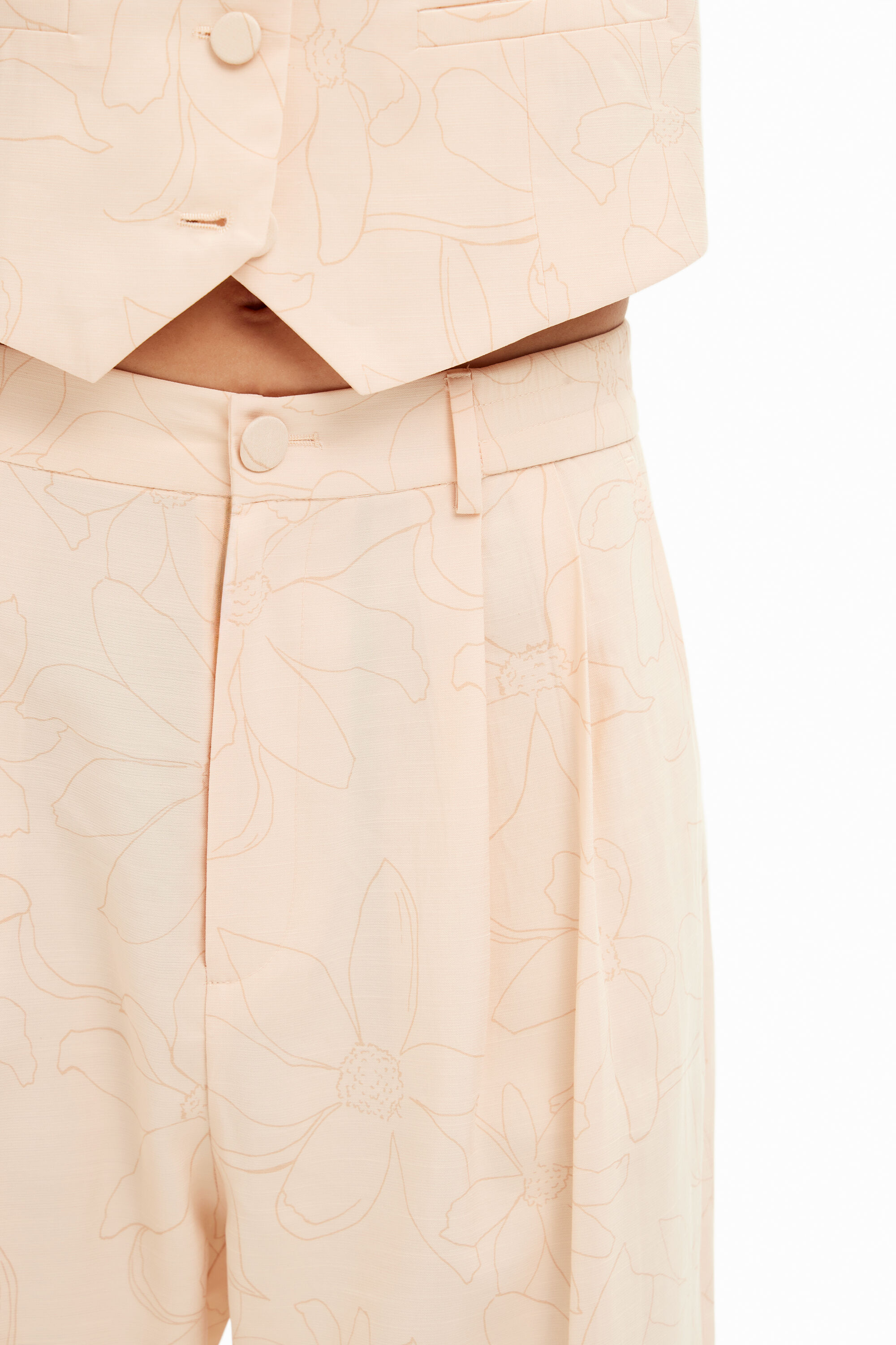 Straight tailored-style trousers with darts and a tone-on-tone floral print.Fit: StraightLength: StandardTone-on-tone illustrated floral printElasticated waist with gathering at the backTwo side pockets and two decorative back pocketsCovered button and zip closureLightweight textured fabricCreate a total look with the matching blazer and waistcoatLenzing™ EcoVero™ viscose