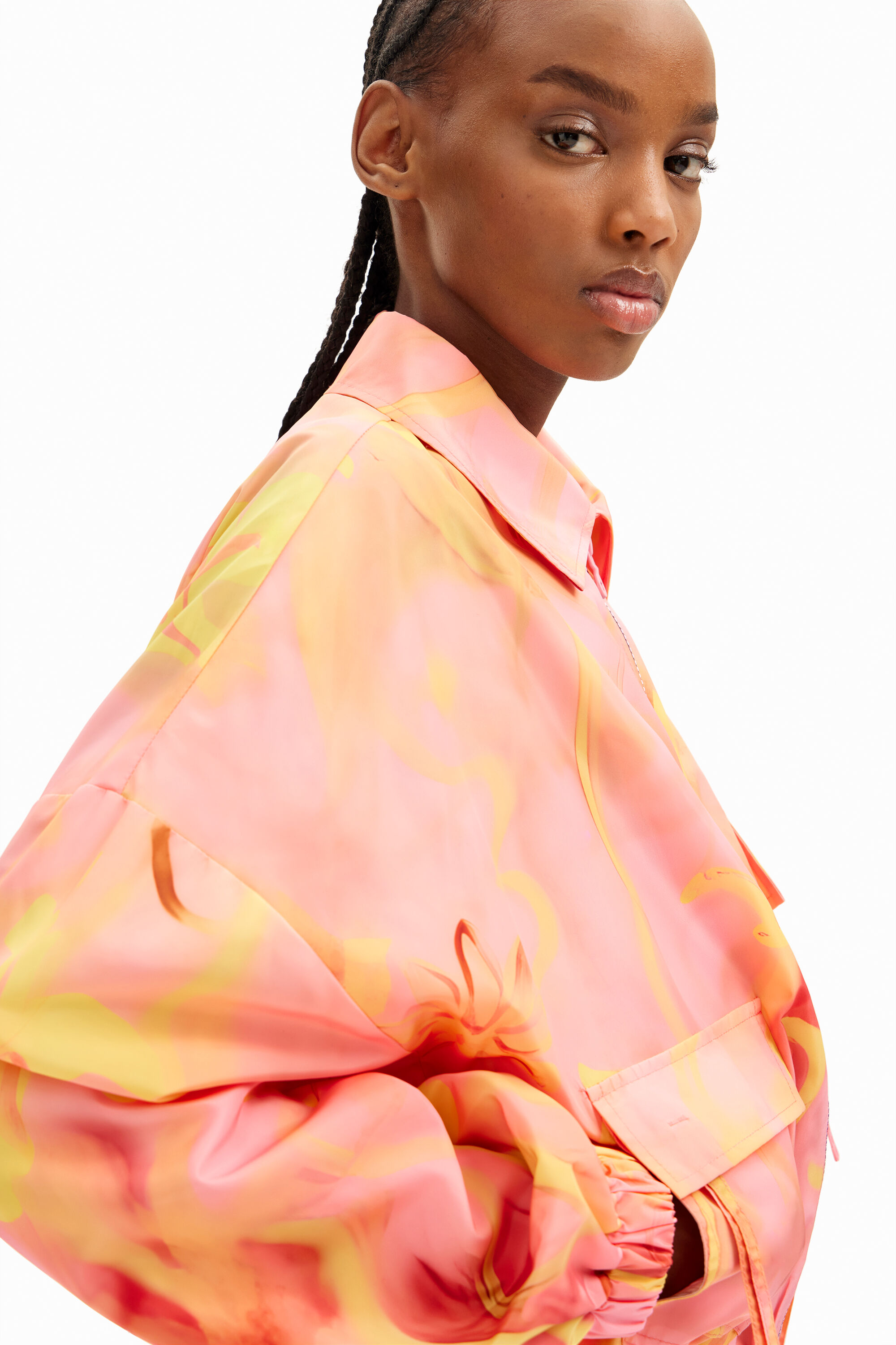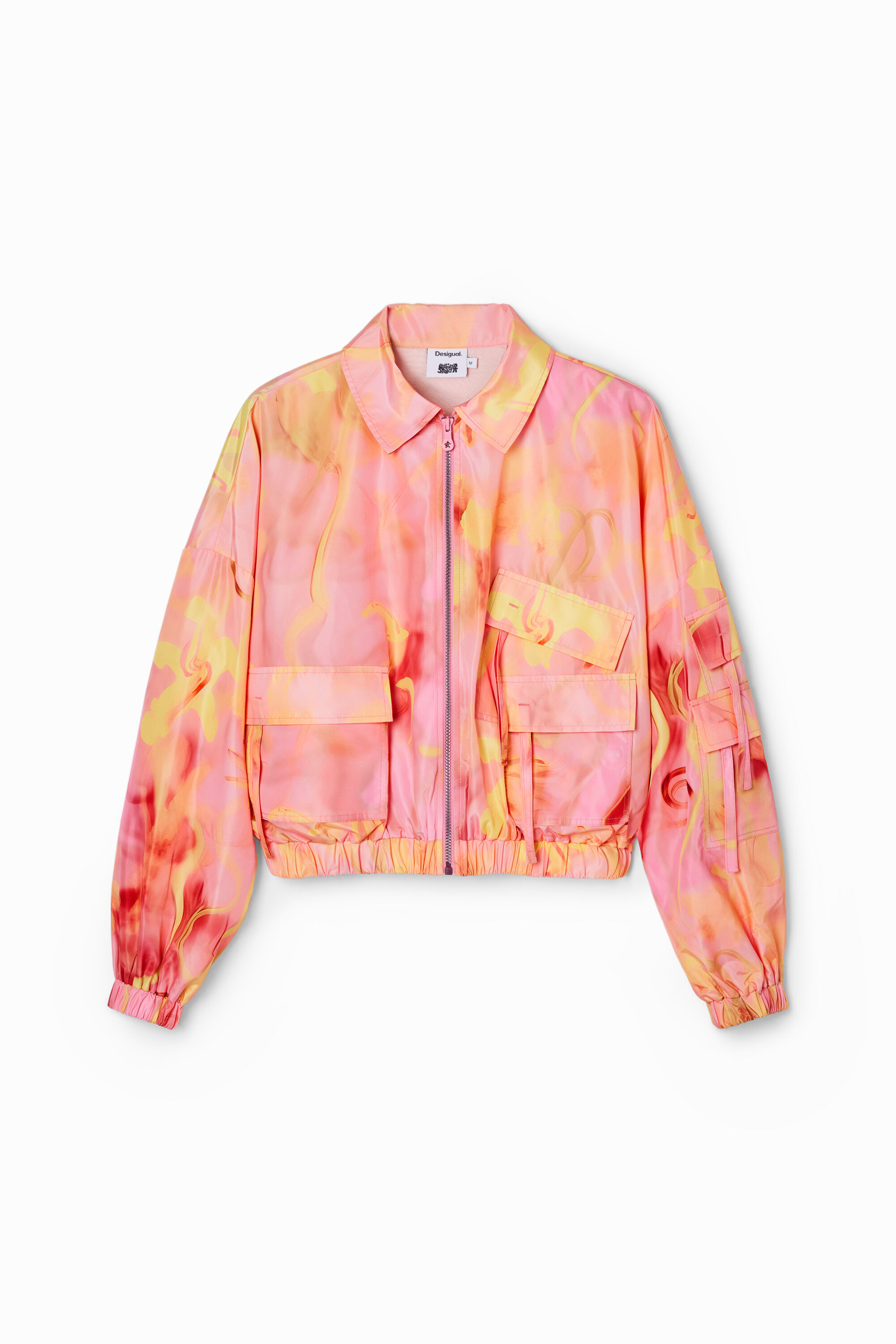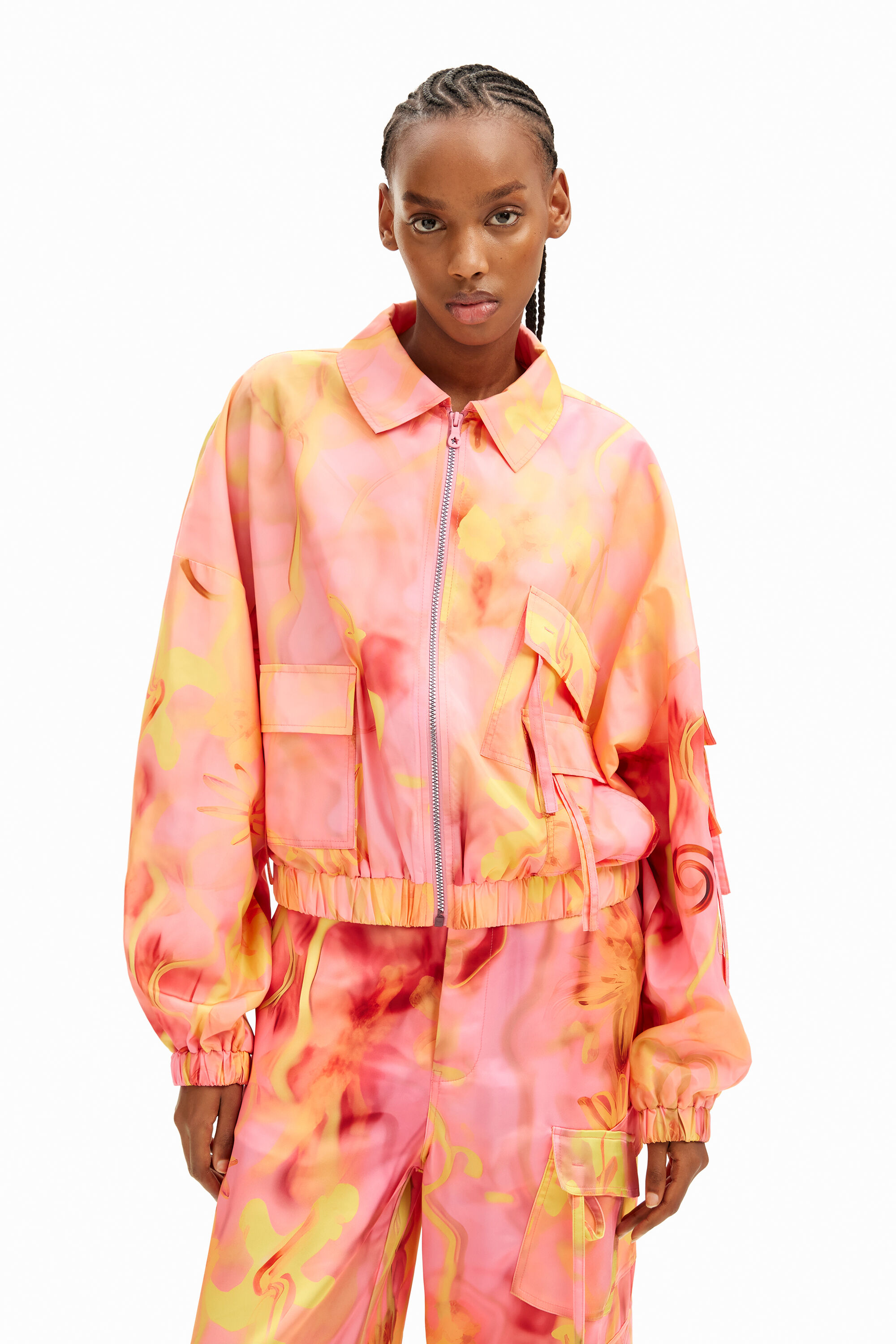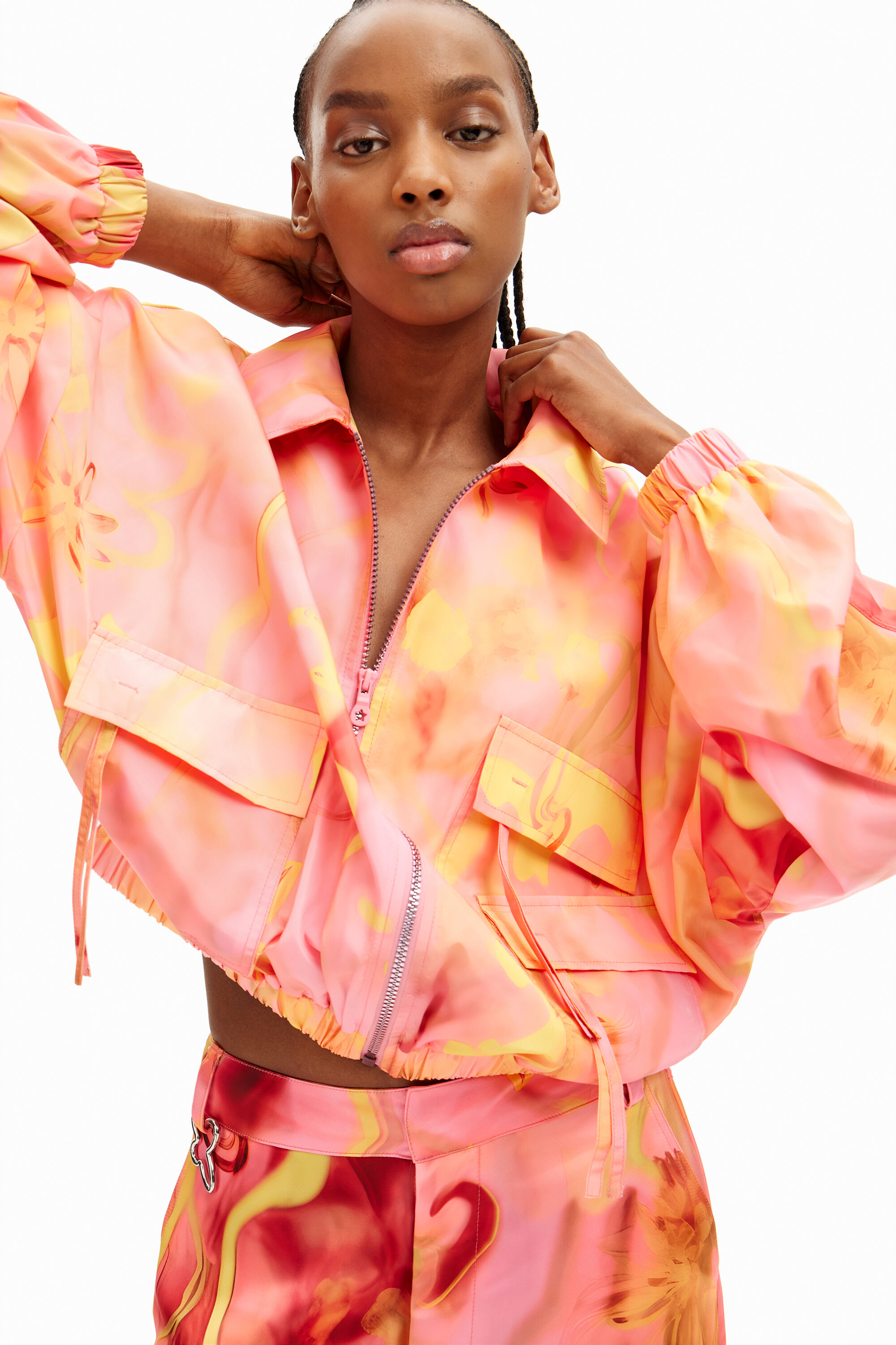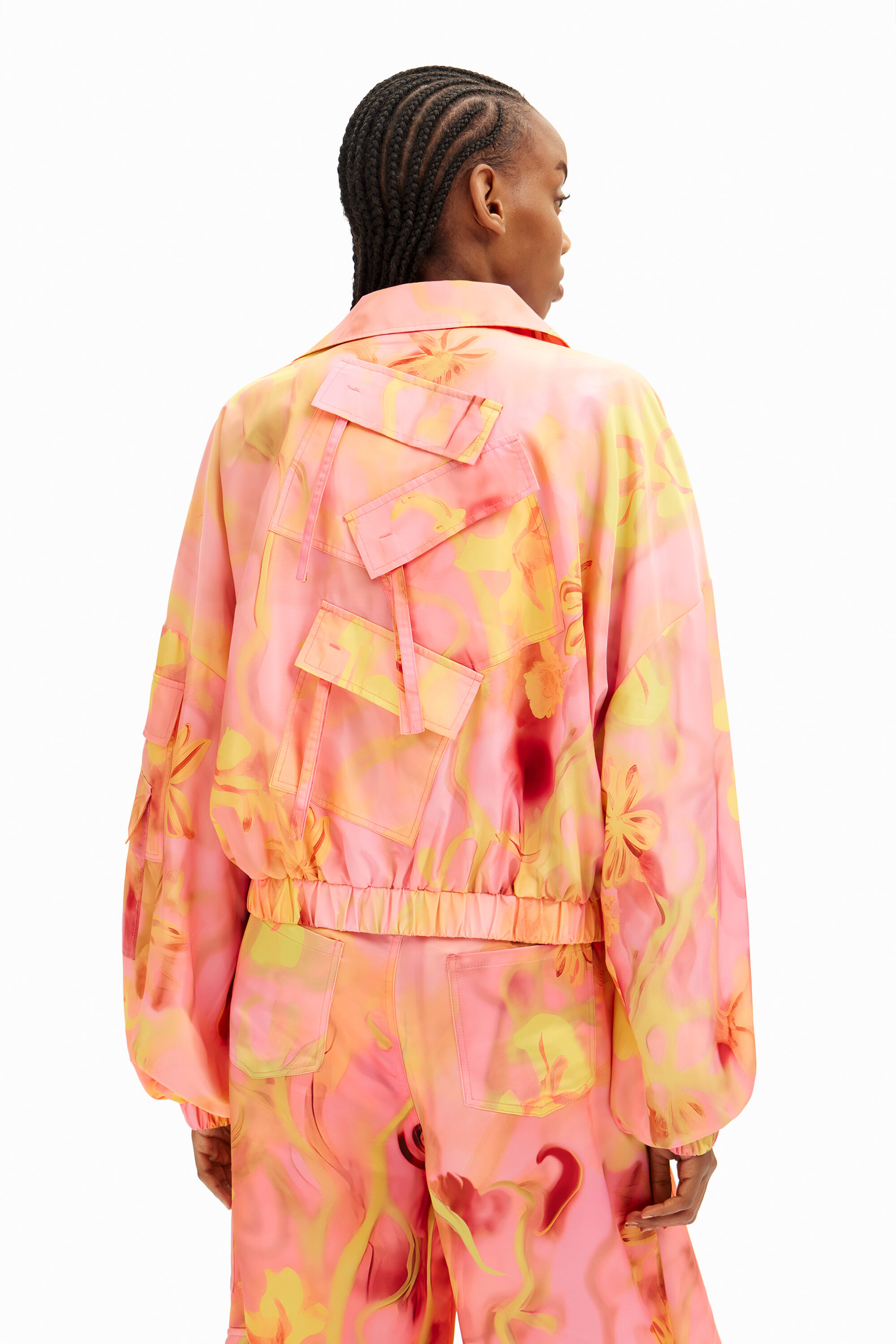 Bomber jacket with multiple pockets and hologram-style tropical flower print.