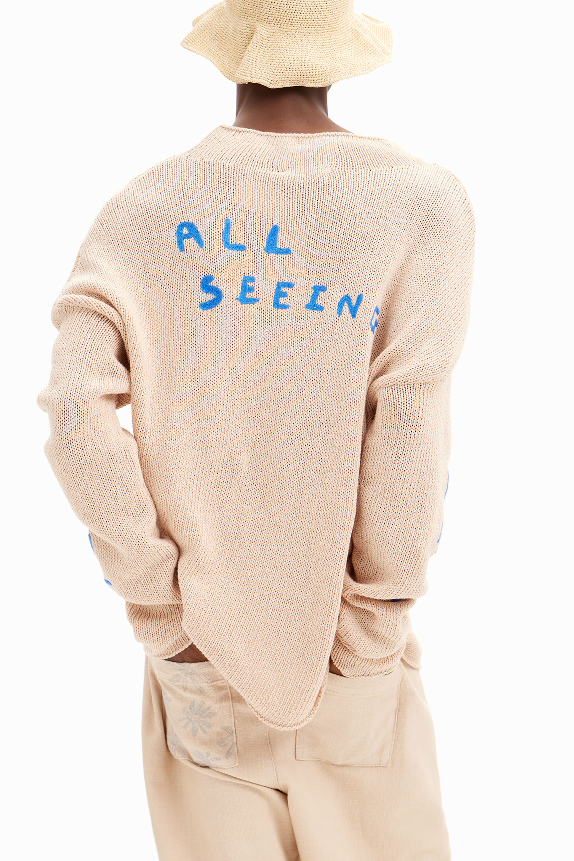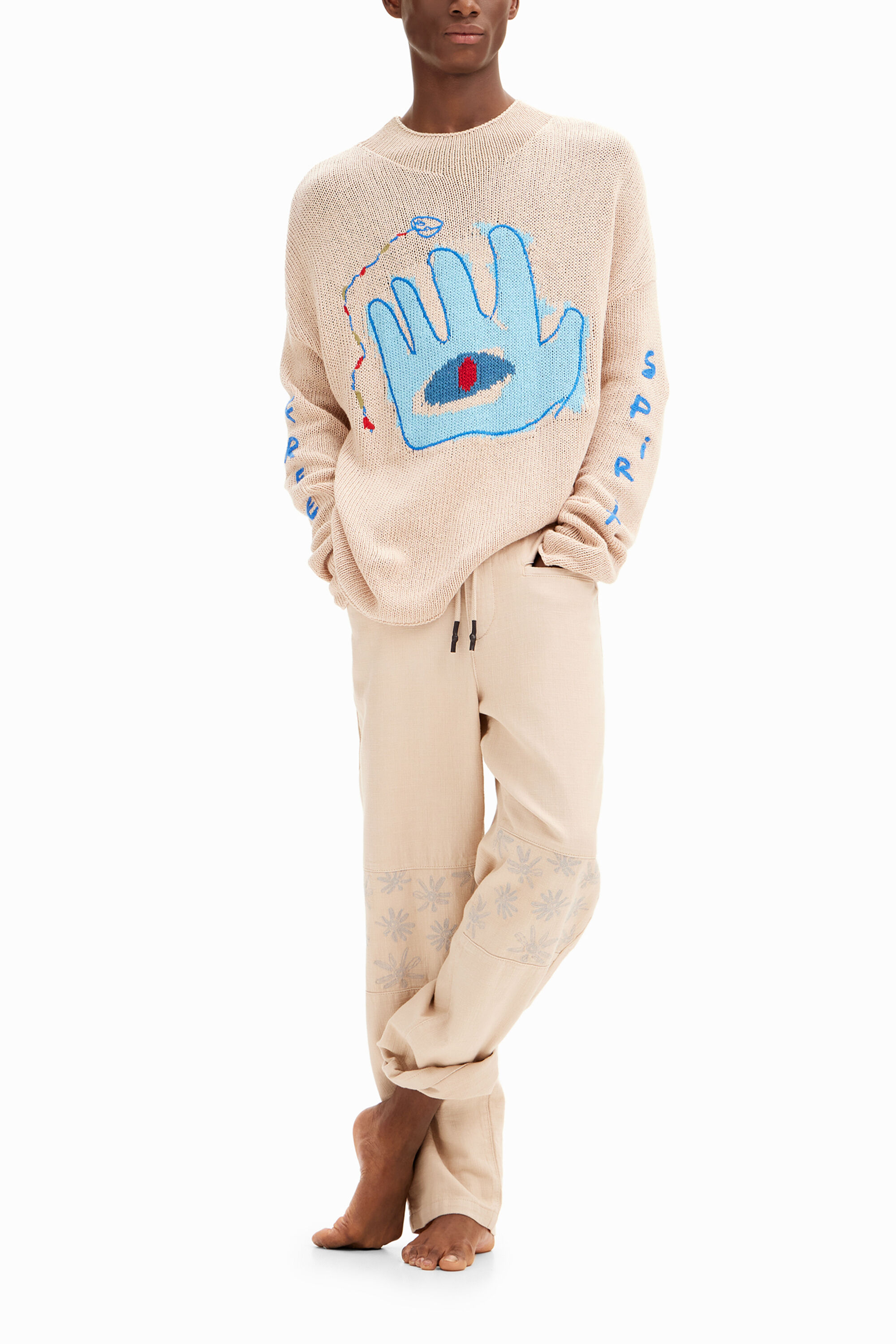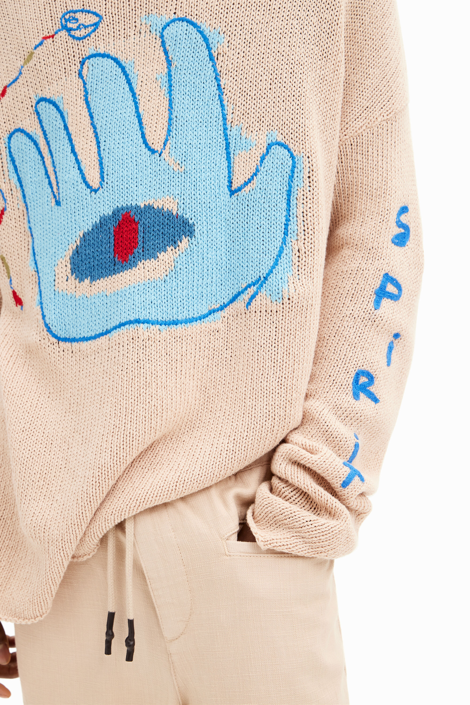 Relaxed fit long sleeve round neck knitted sweater with embroidered illustration of a Hamsa hand in the center and details on the sleeves.Fit: RegularHand of Fatima inspired printRound neckLong sleeveEmbroidered details on the sleeves.Collar with finishingWhen you buy Desigual cotton products, you are supporting our investment in Better Cotton.