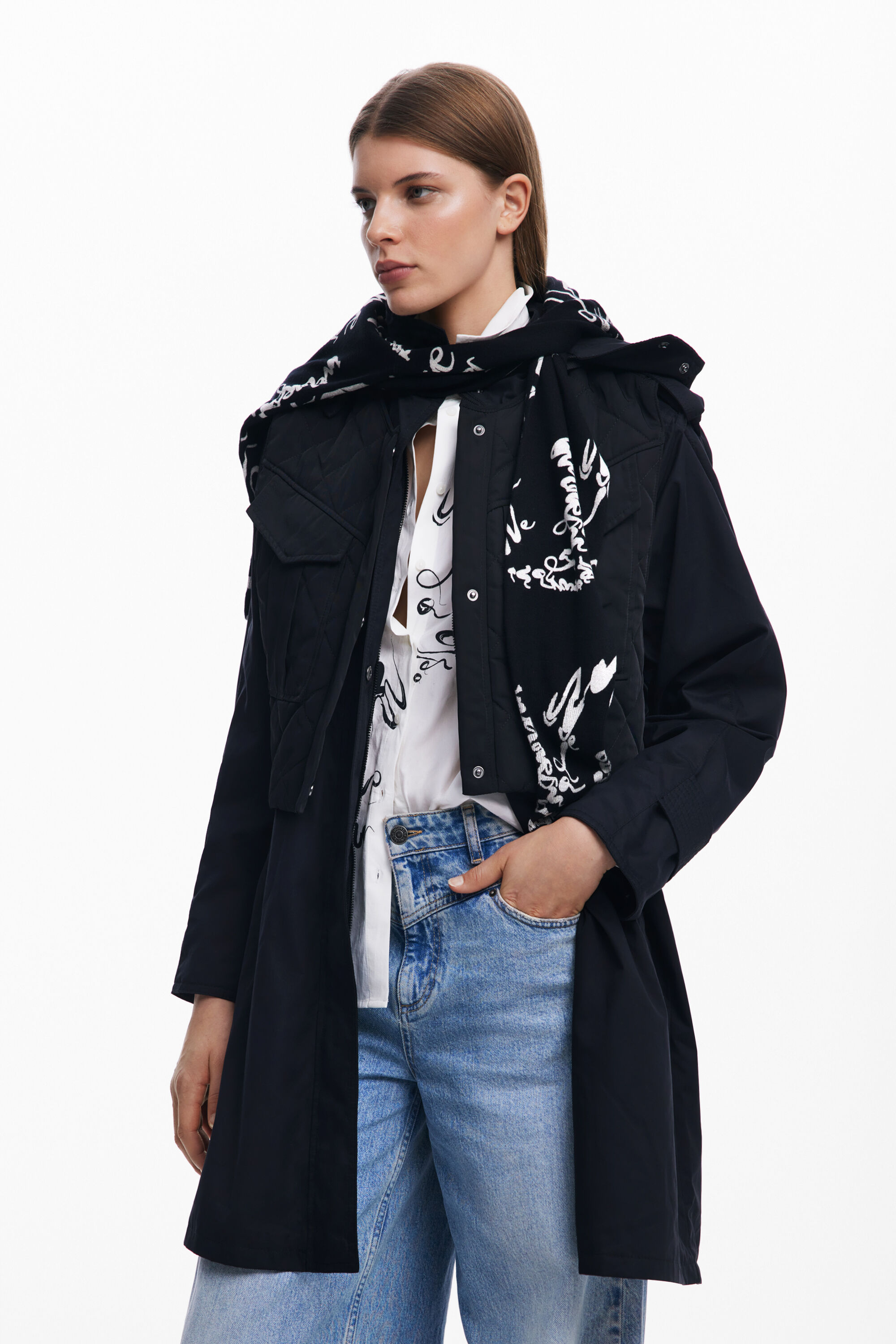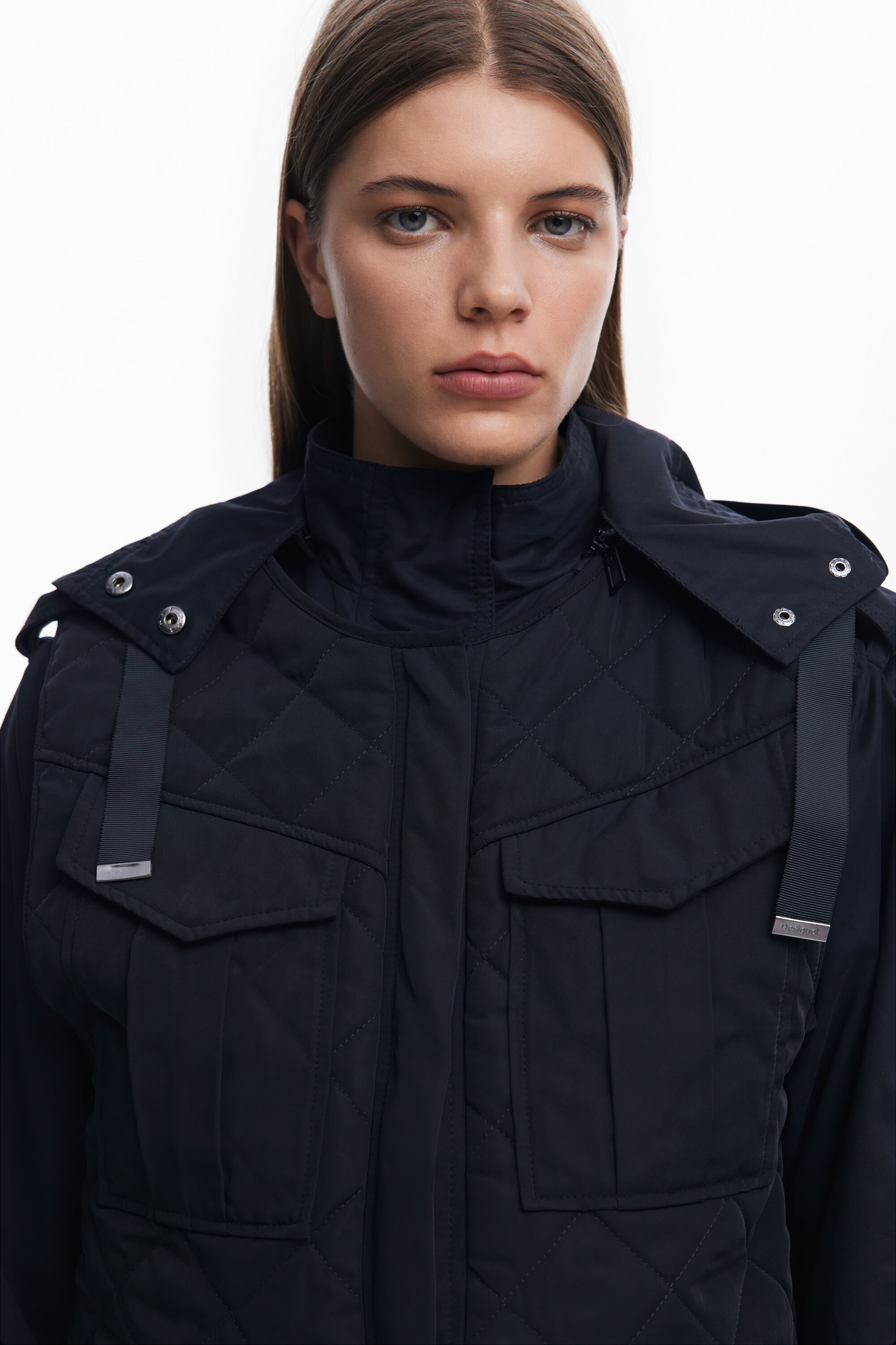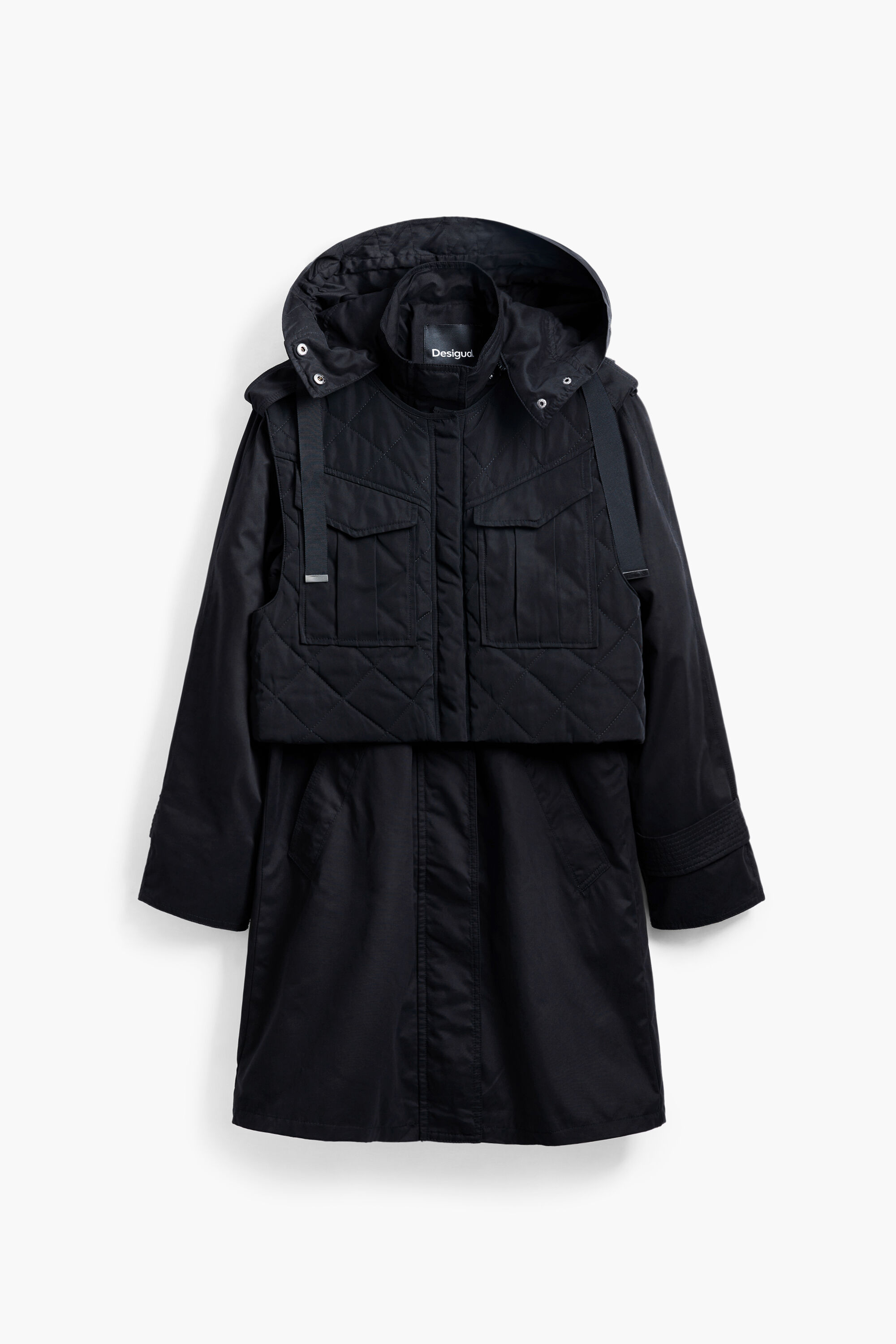 Padded midi parka, solid color, with several front pockets and convertible into a vest.