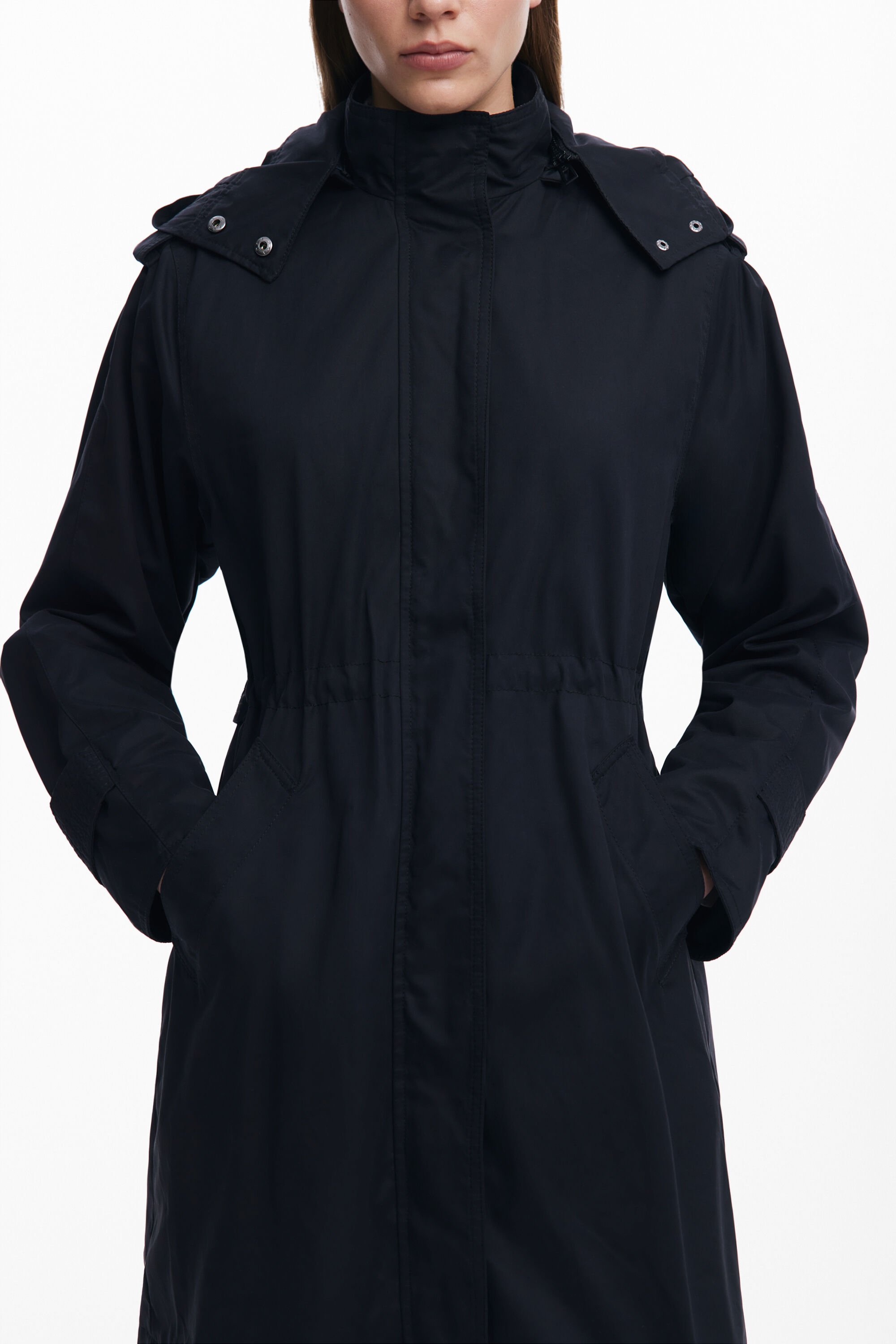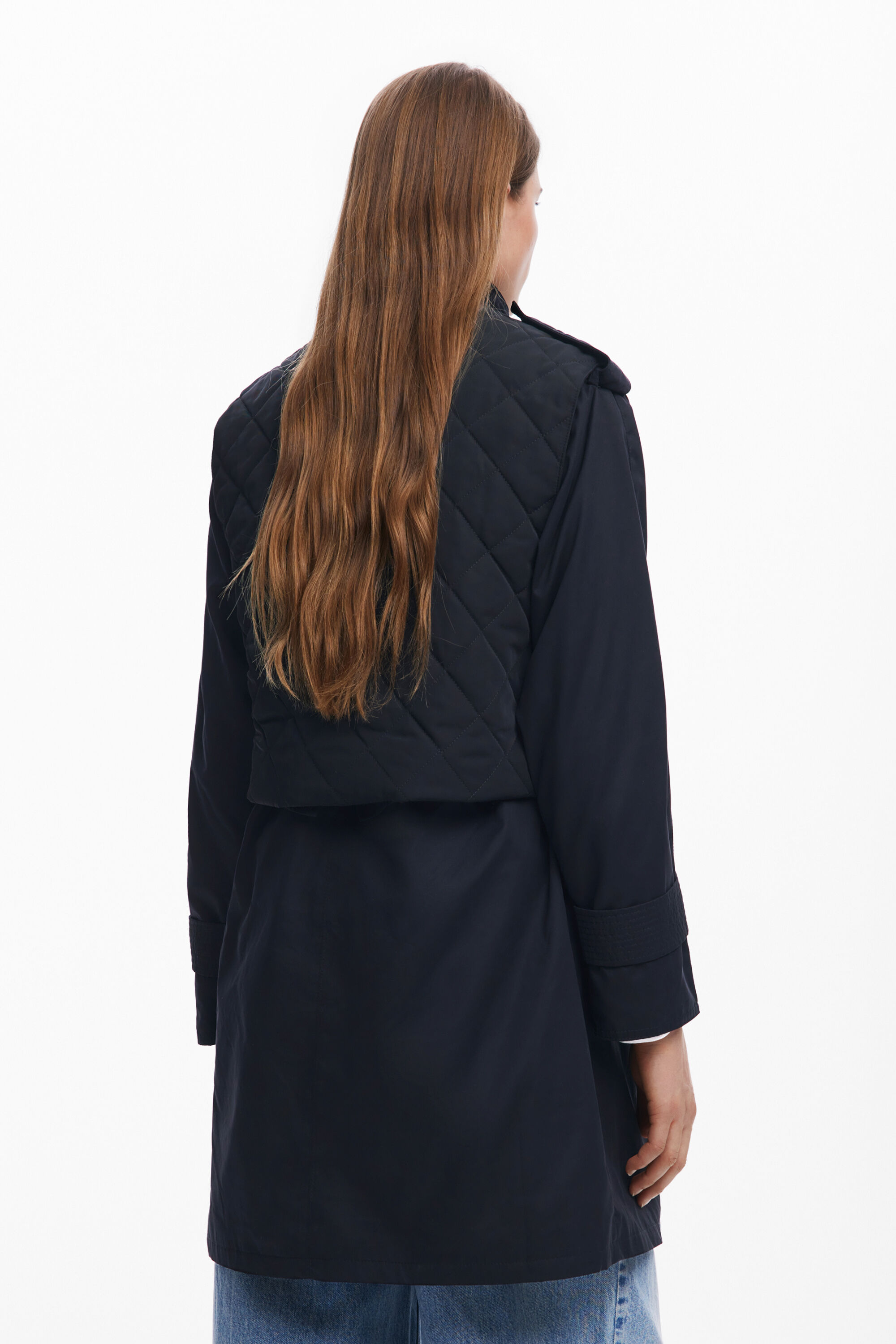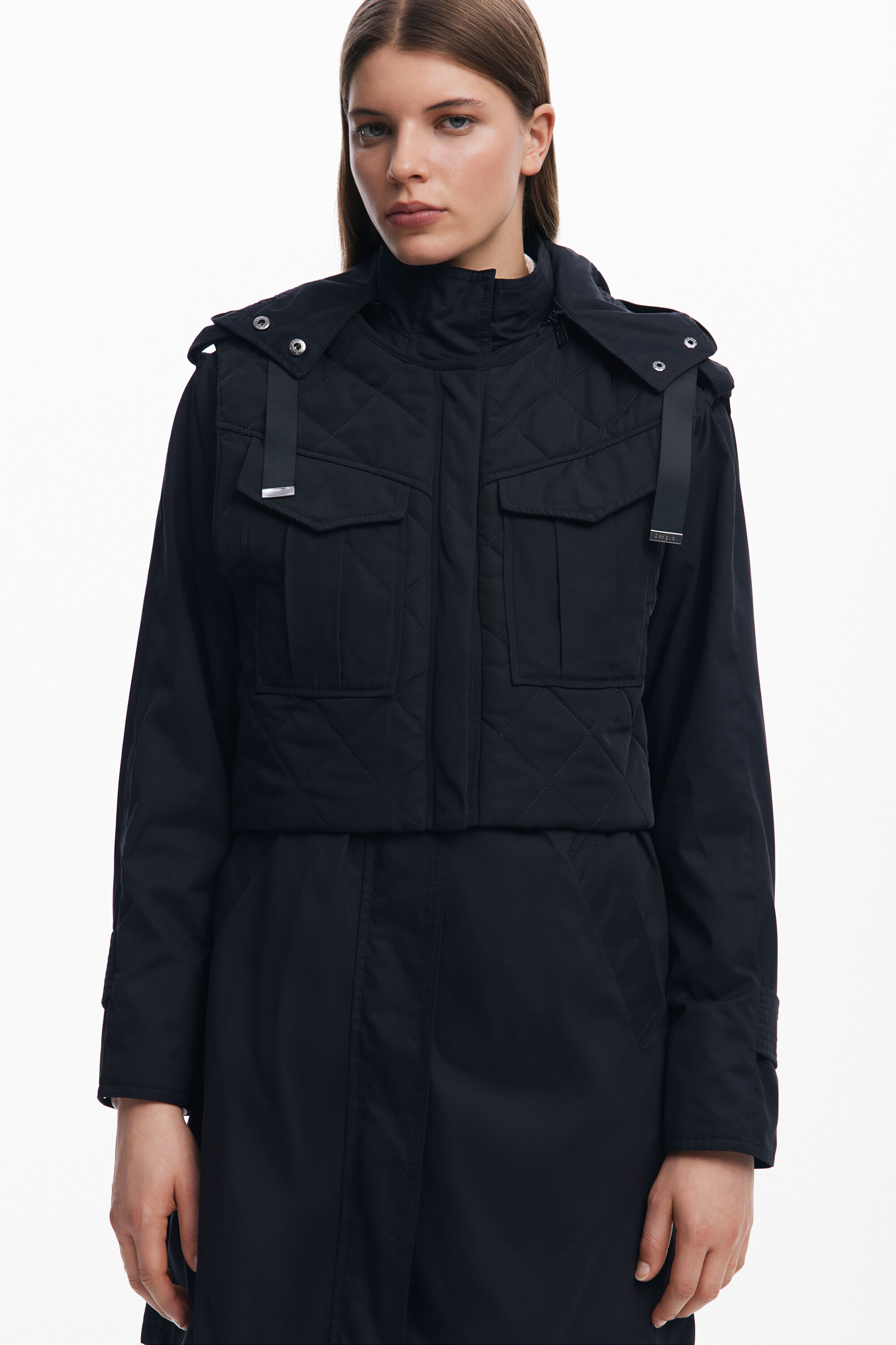 Padded midi parka, solid color, with several front pockets and convertible into a vest.