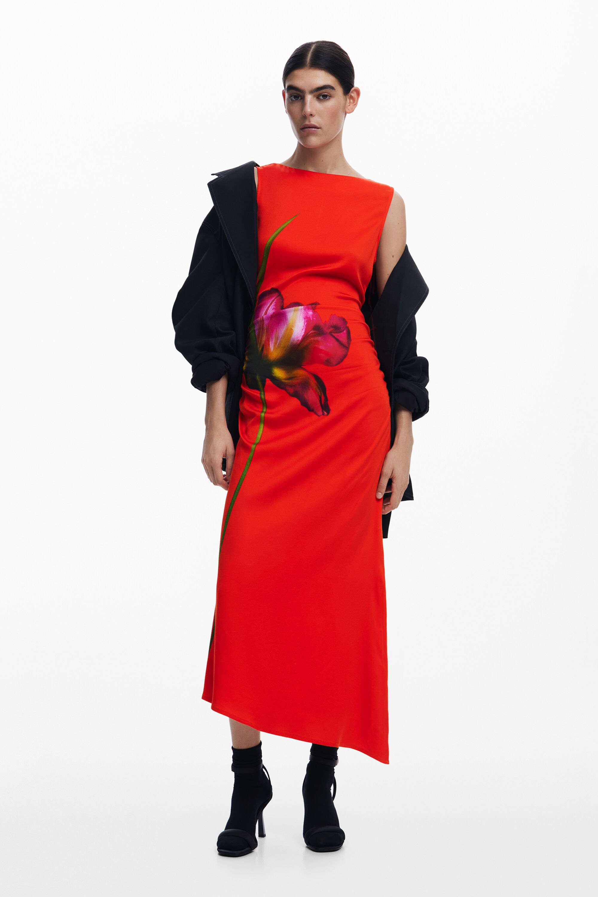 Asymmetric cut midi dress, boat neck, with gathered detail and slit at the hem and floral printFit: