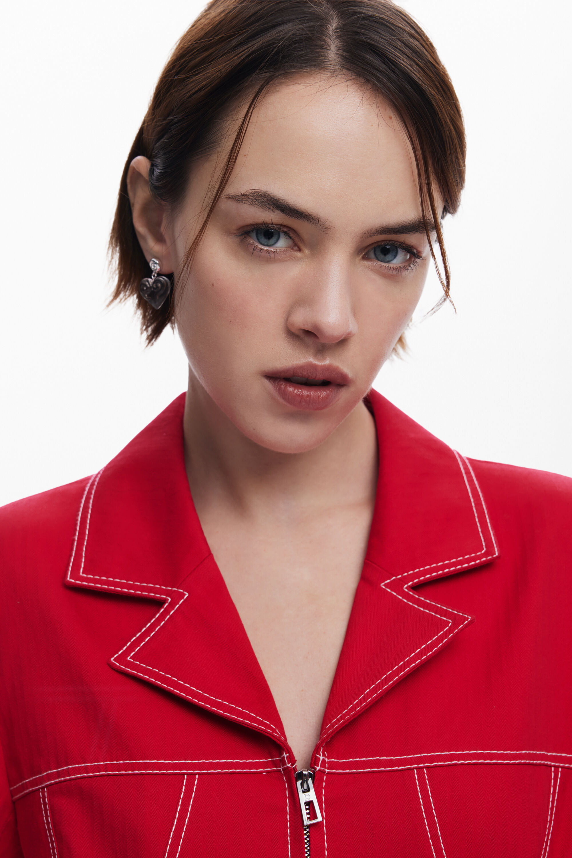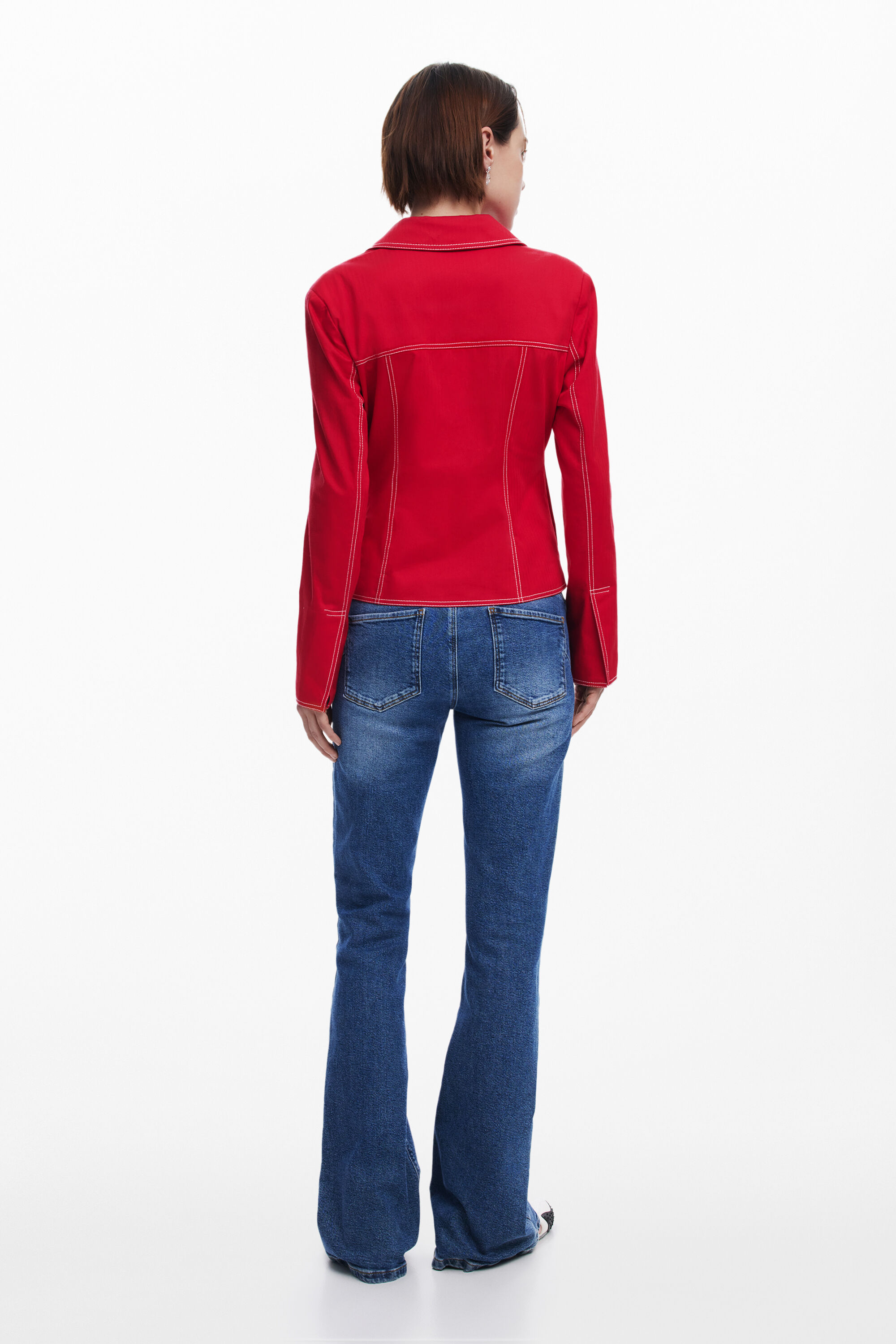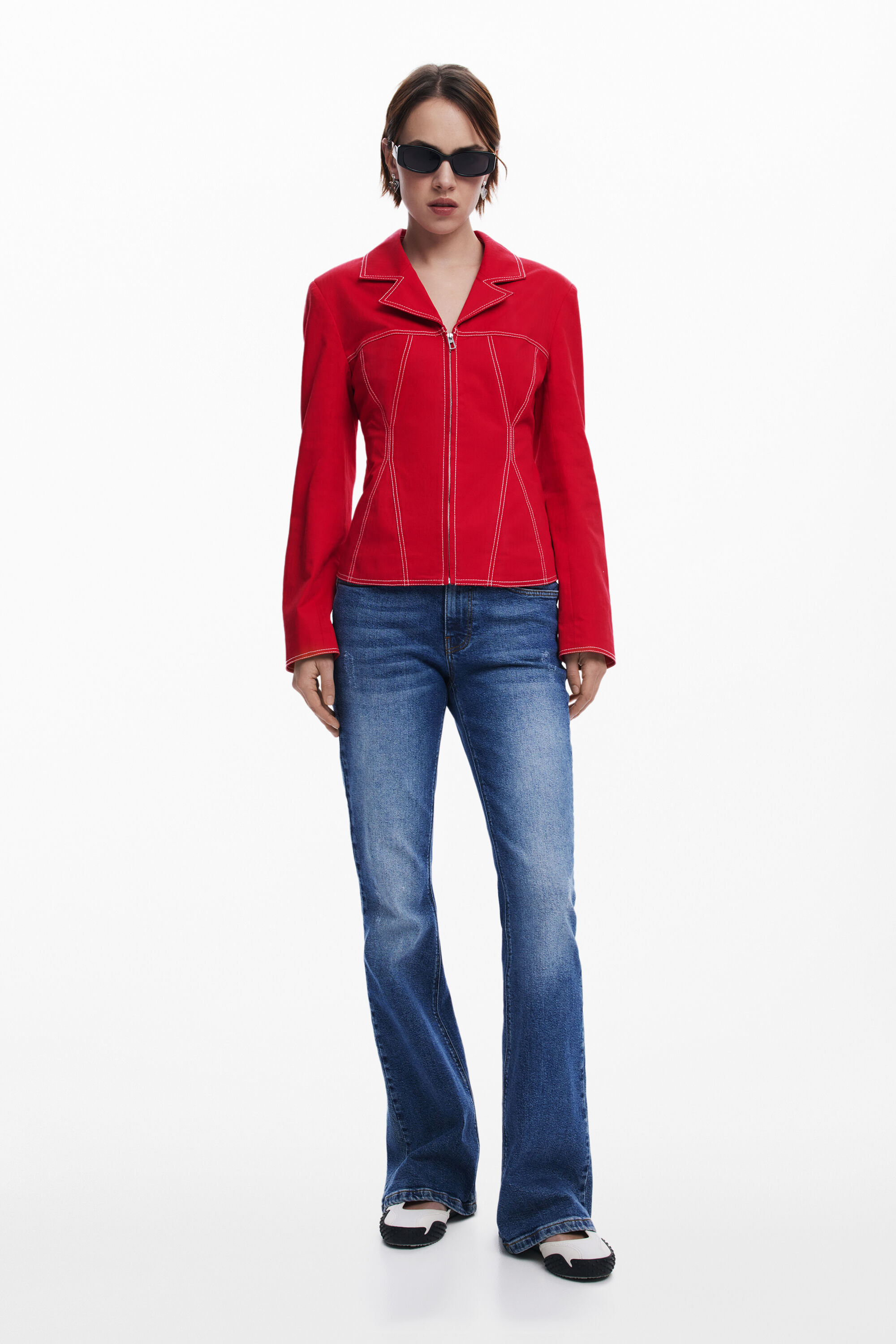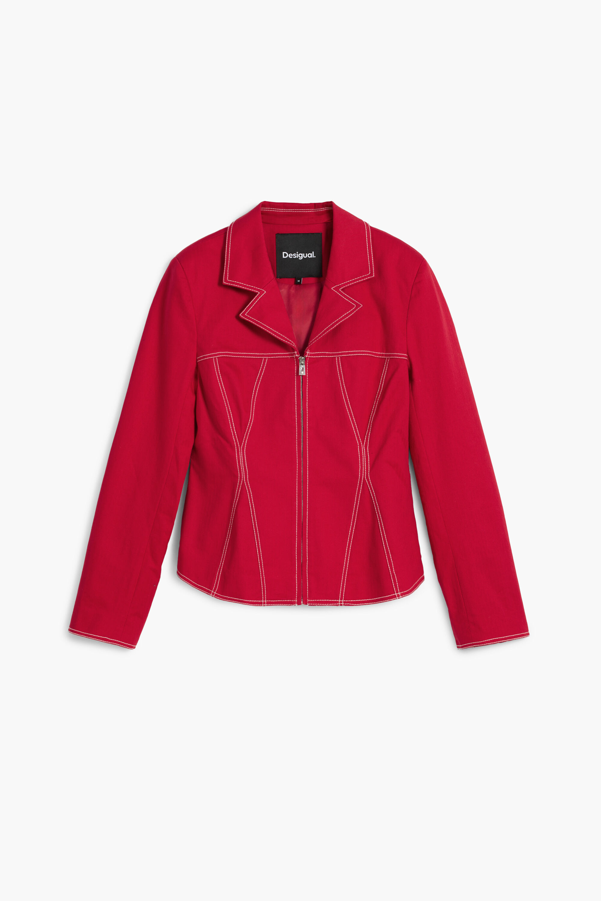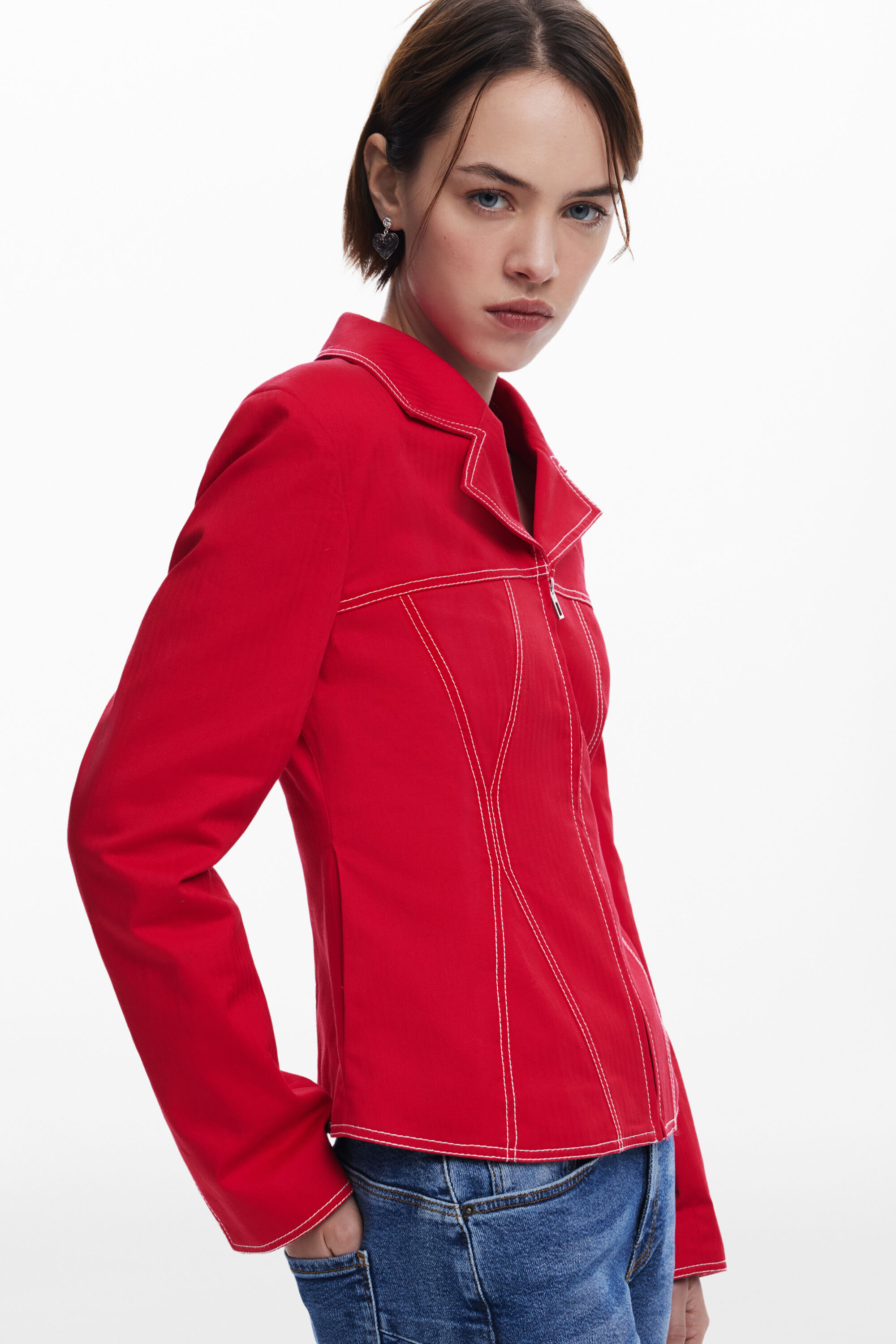 Biker-style jacket with decorative stitching, fitted, with lapel collar and peplum hem.Fit: