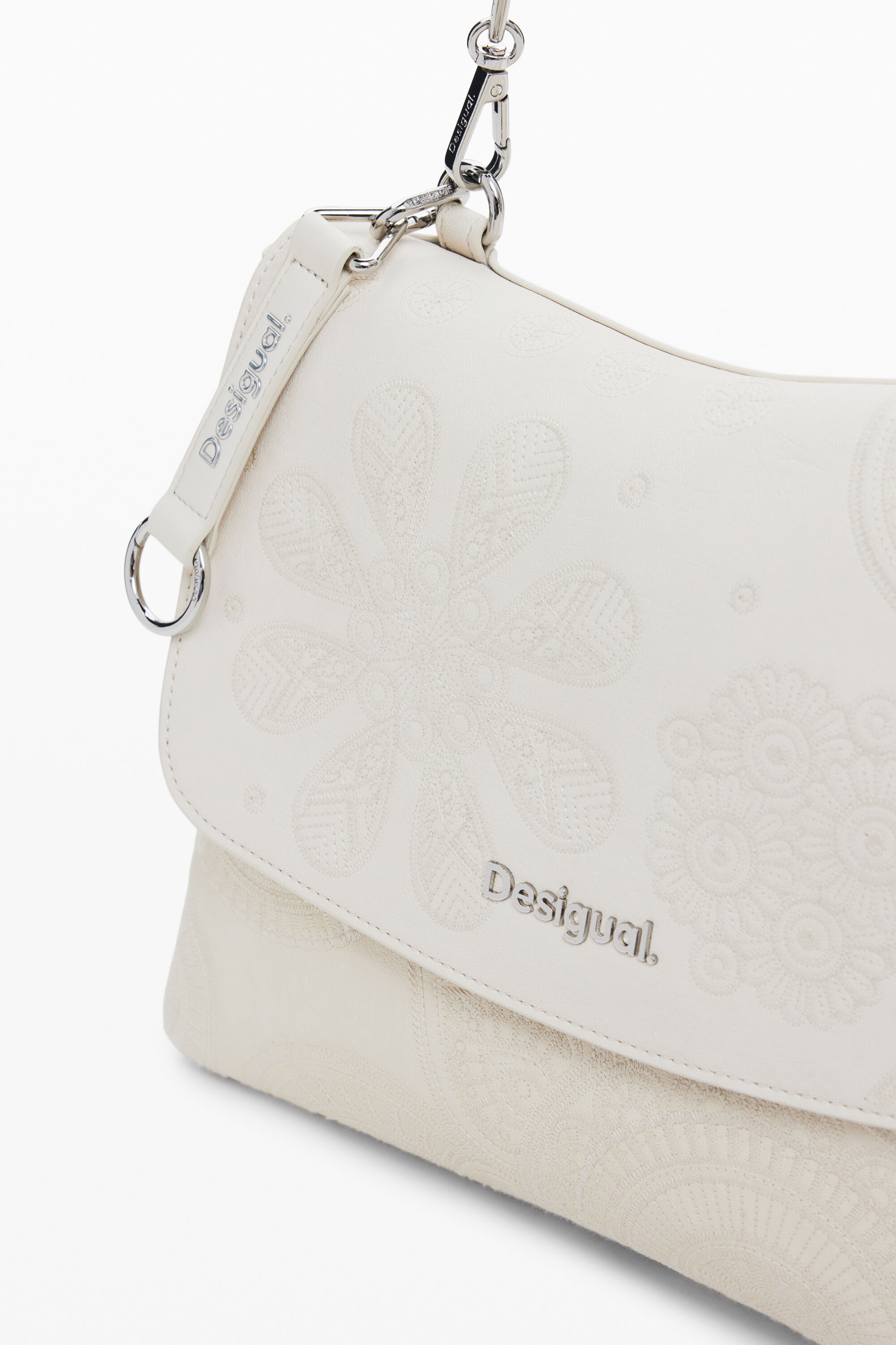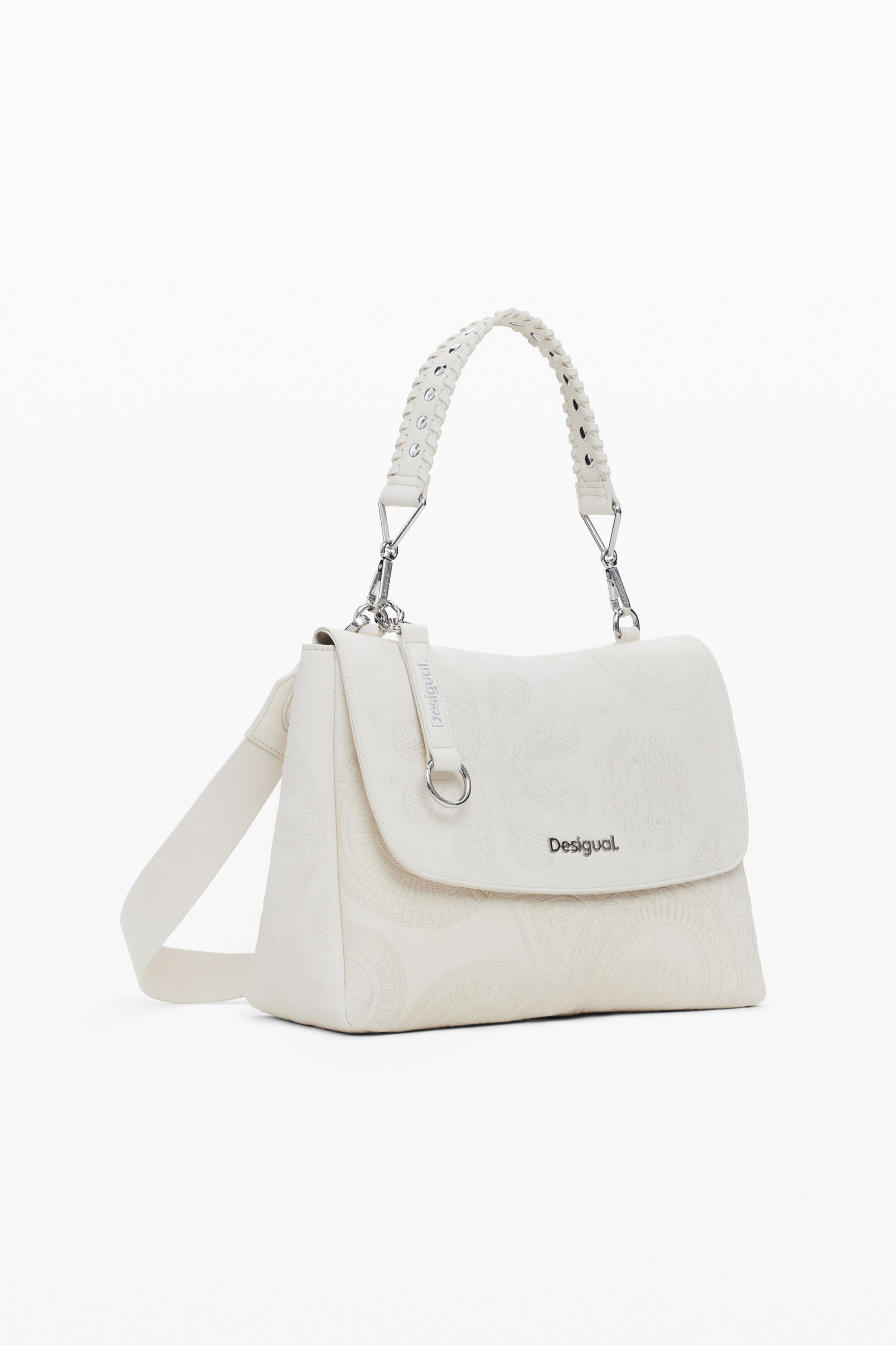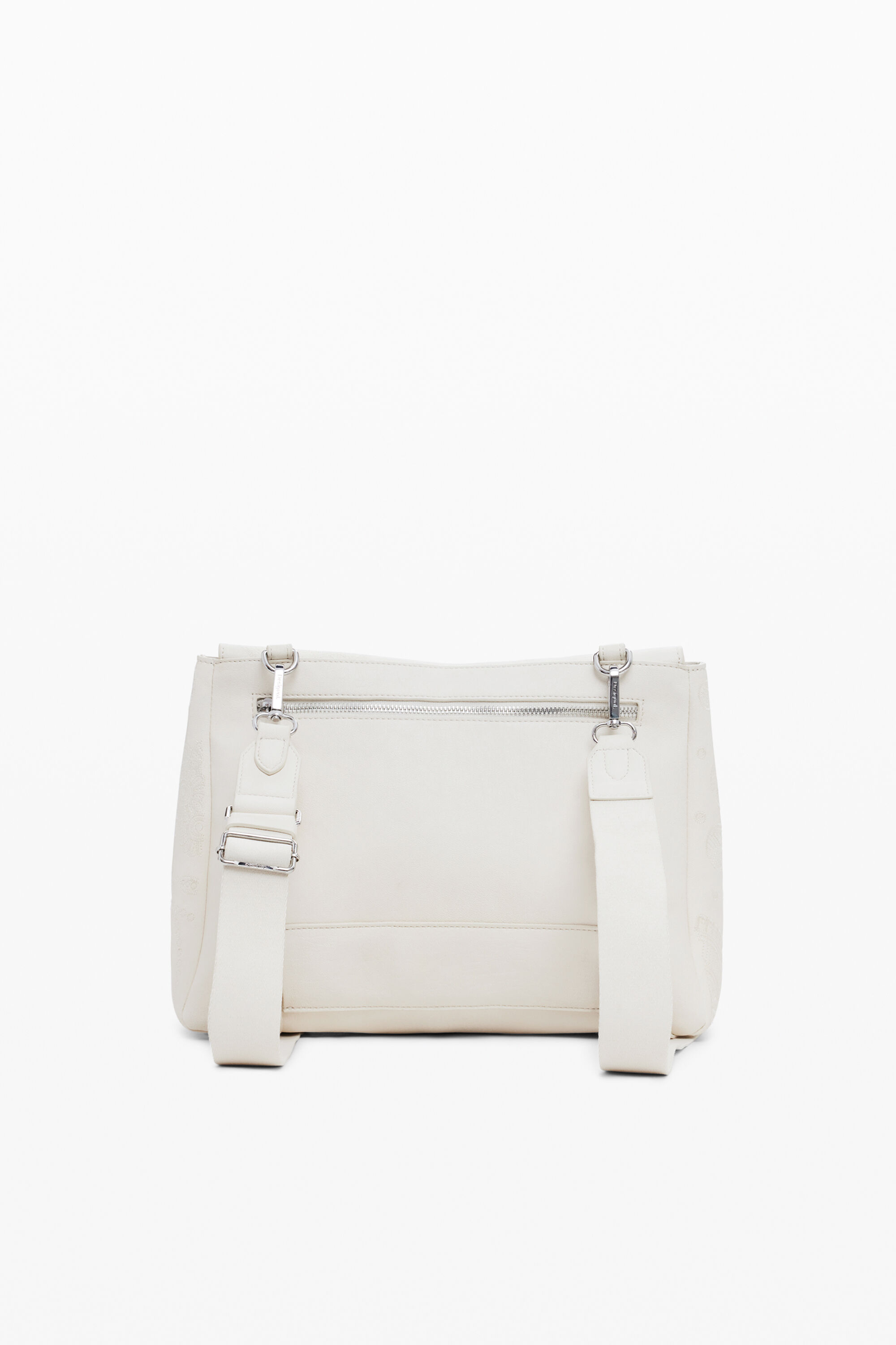 Medium bag in faux leather fabric, with detachable handle, convertible to a backpack, magnetic flap closure and zipper, and mandala embroidery in solid color.