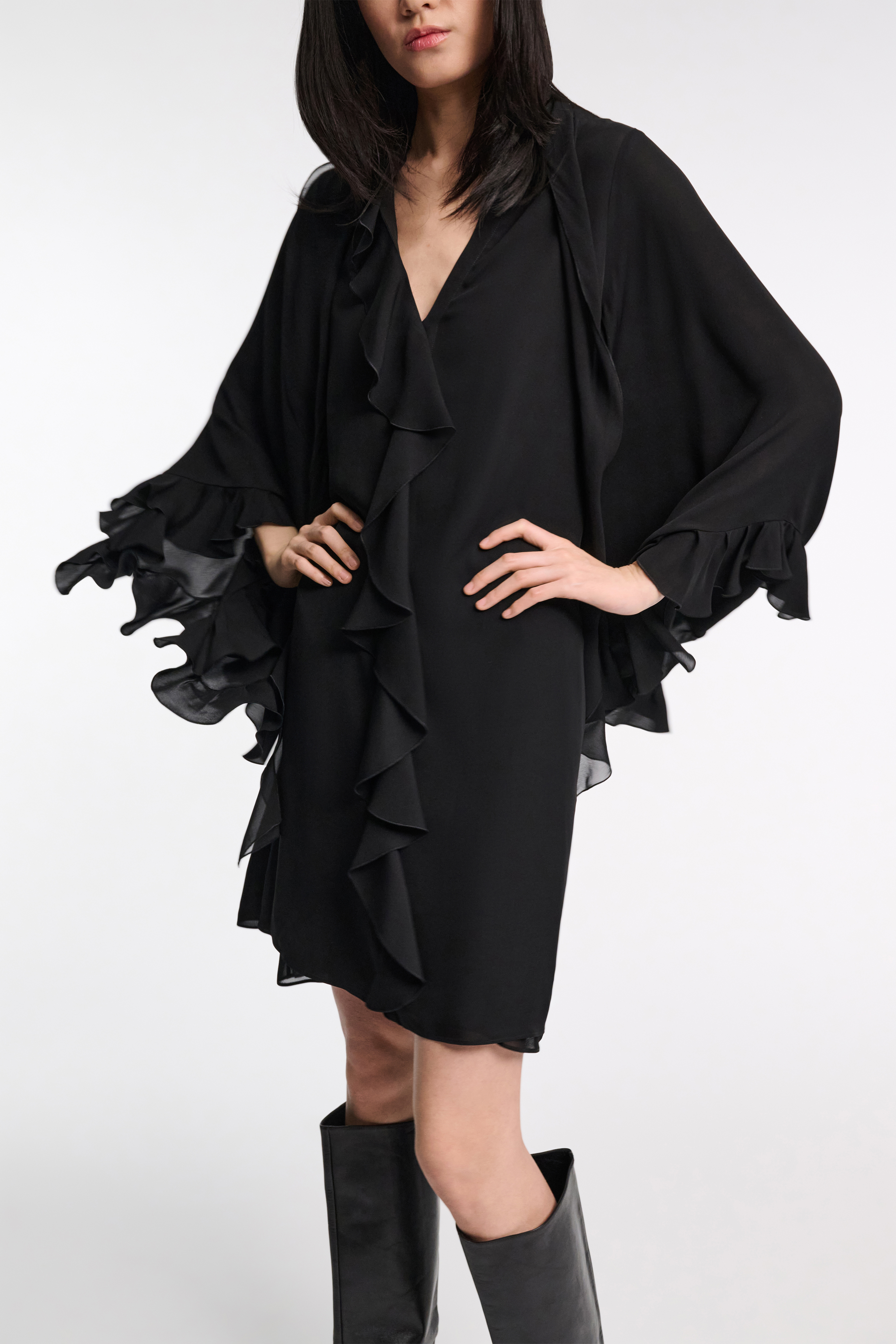 The ruffle mini dress is made from double- and single silk georgette and comes with a matching scarf-detail.
