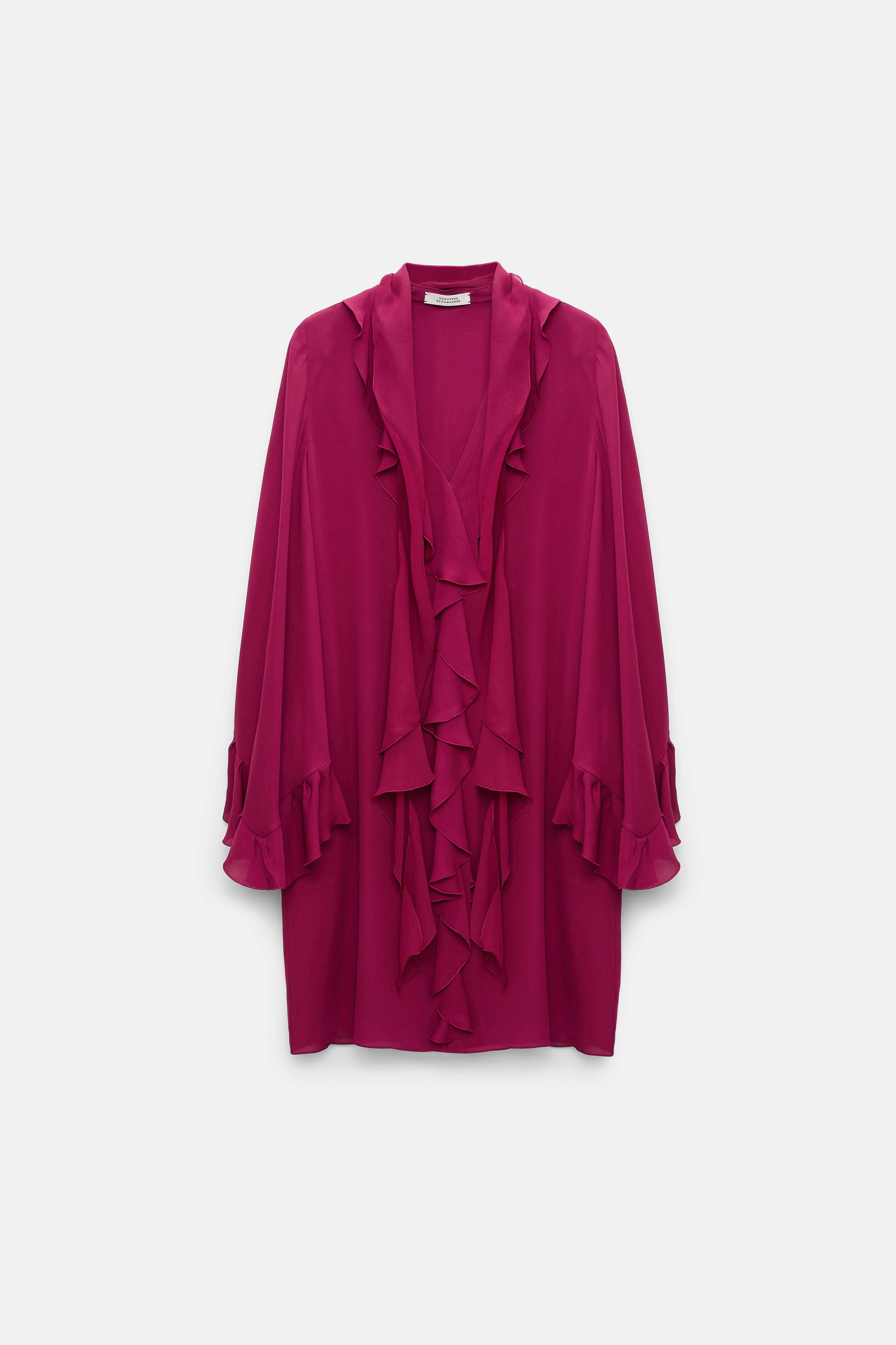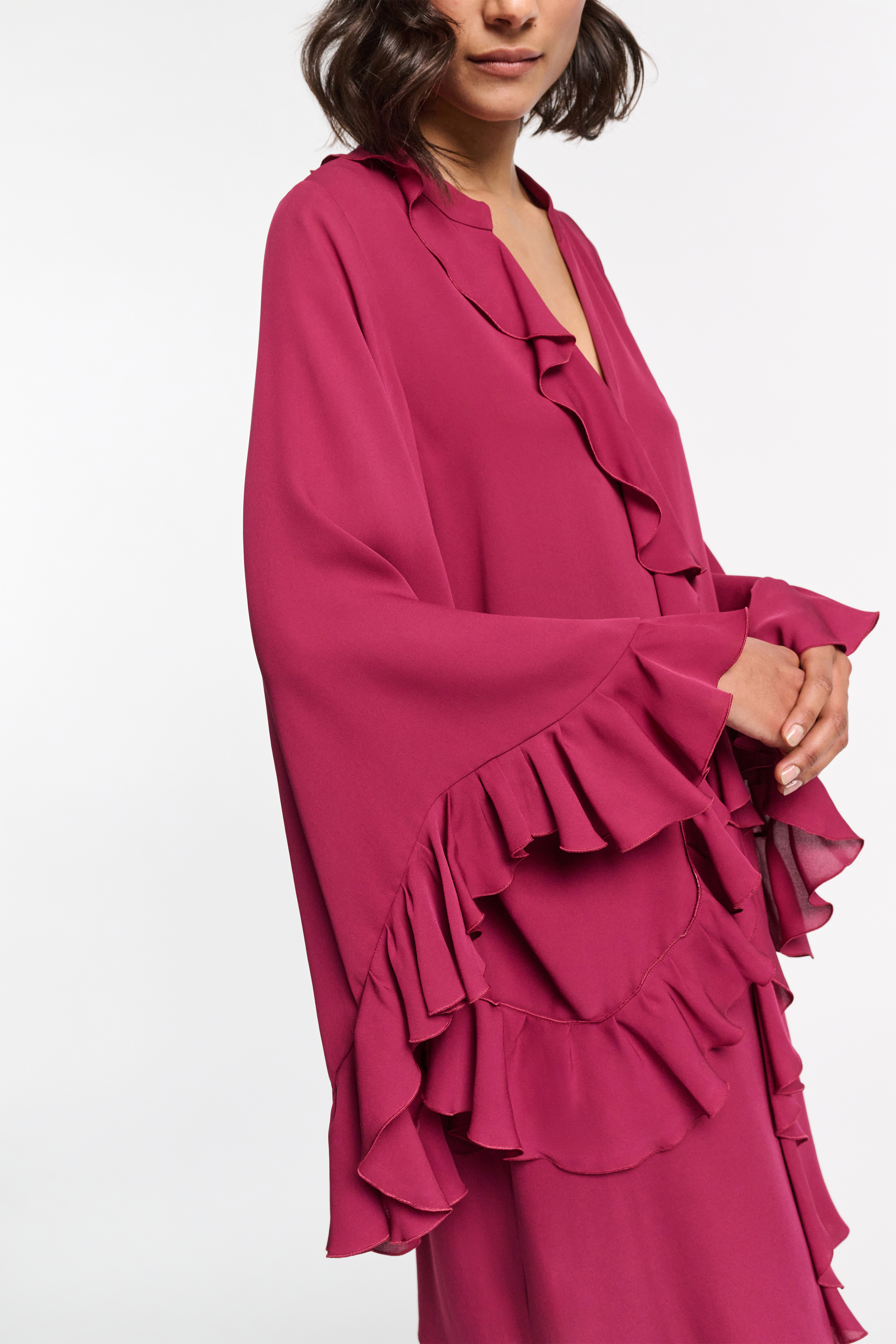 The dress has a relaxed fit and wide sleeves with ruffles at the cuffs.