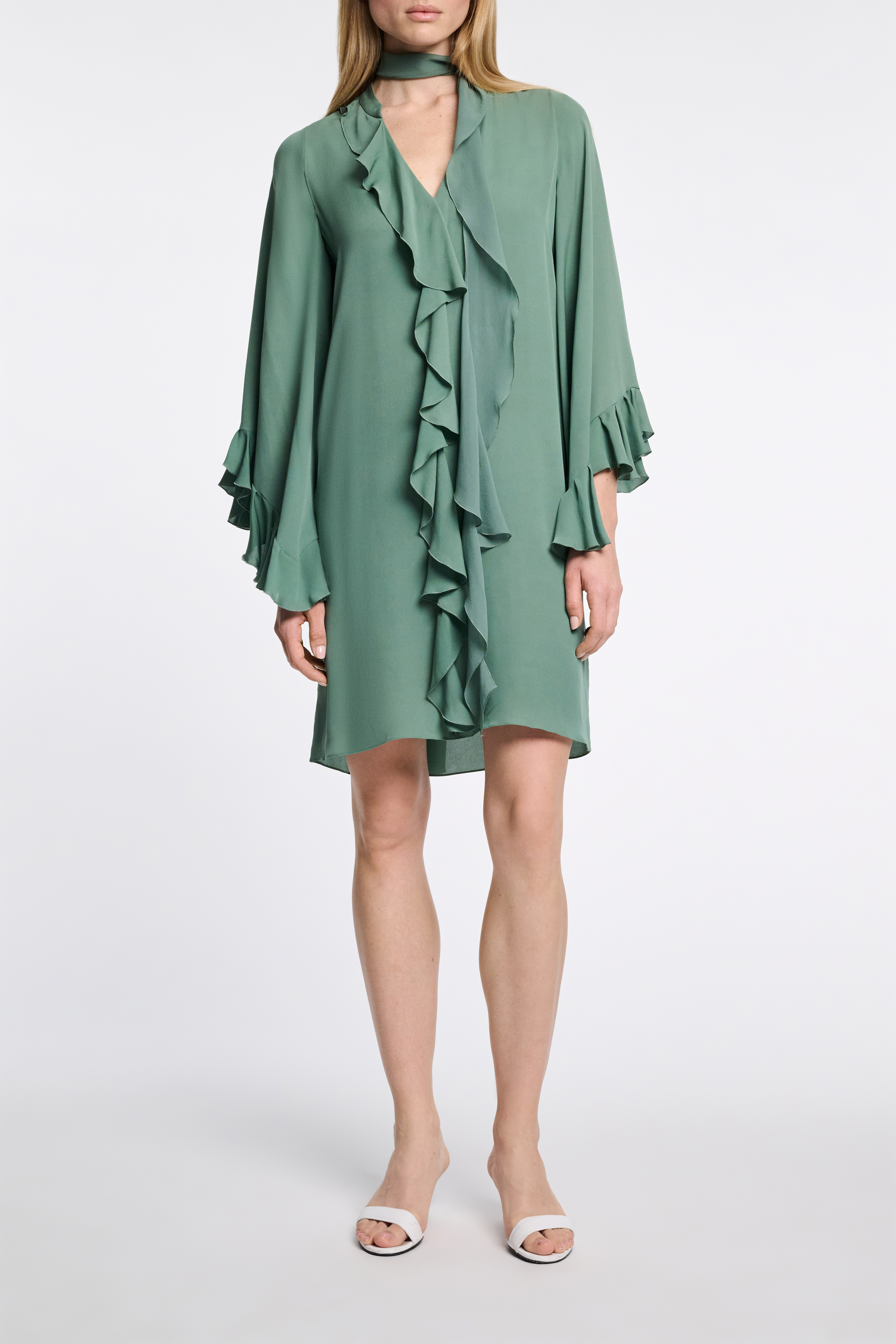 The ruffle mini dress is made from double- and single silk georgette and comes with a matching scarf-detail.