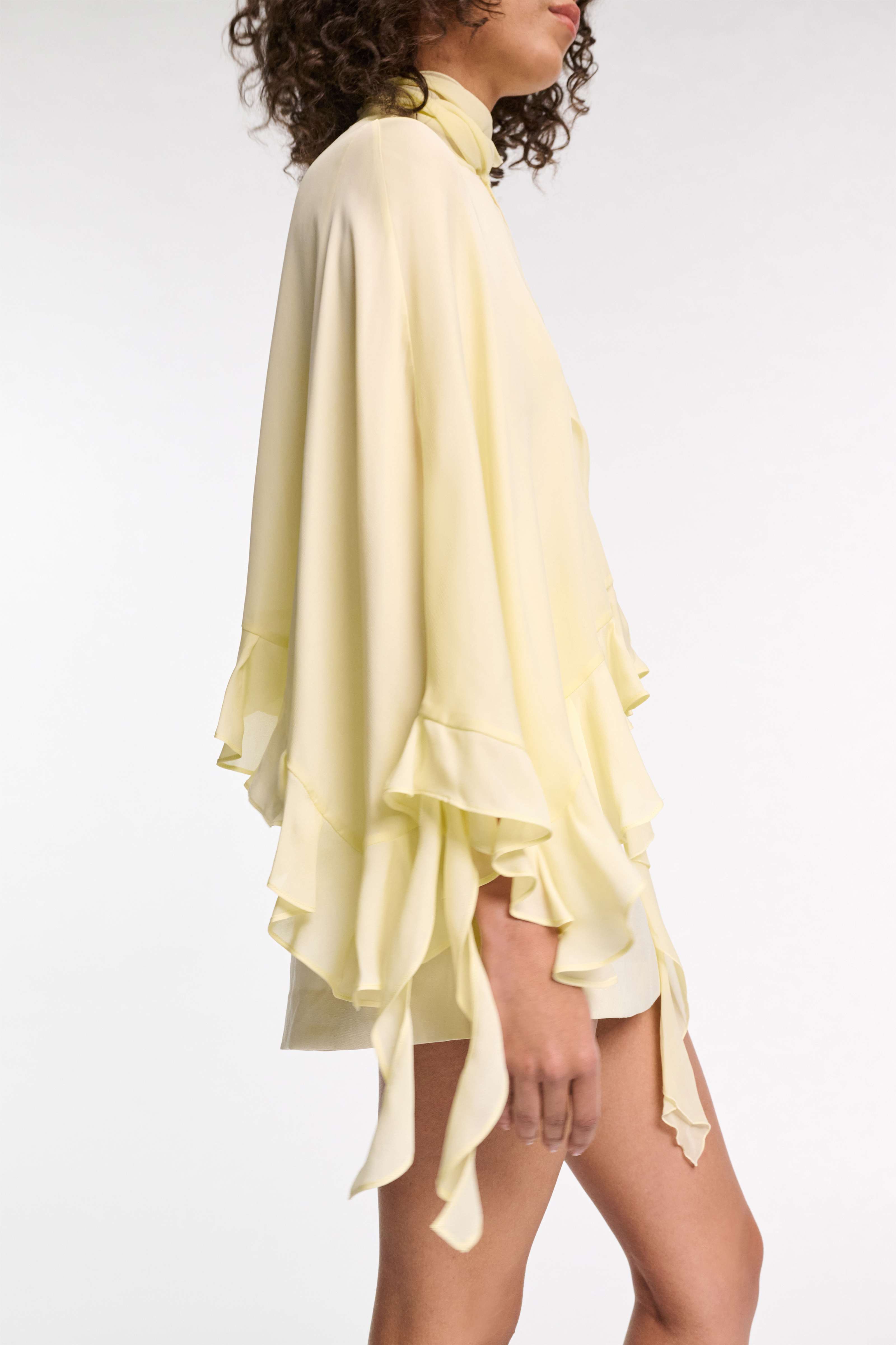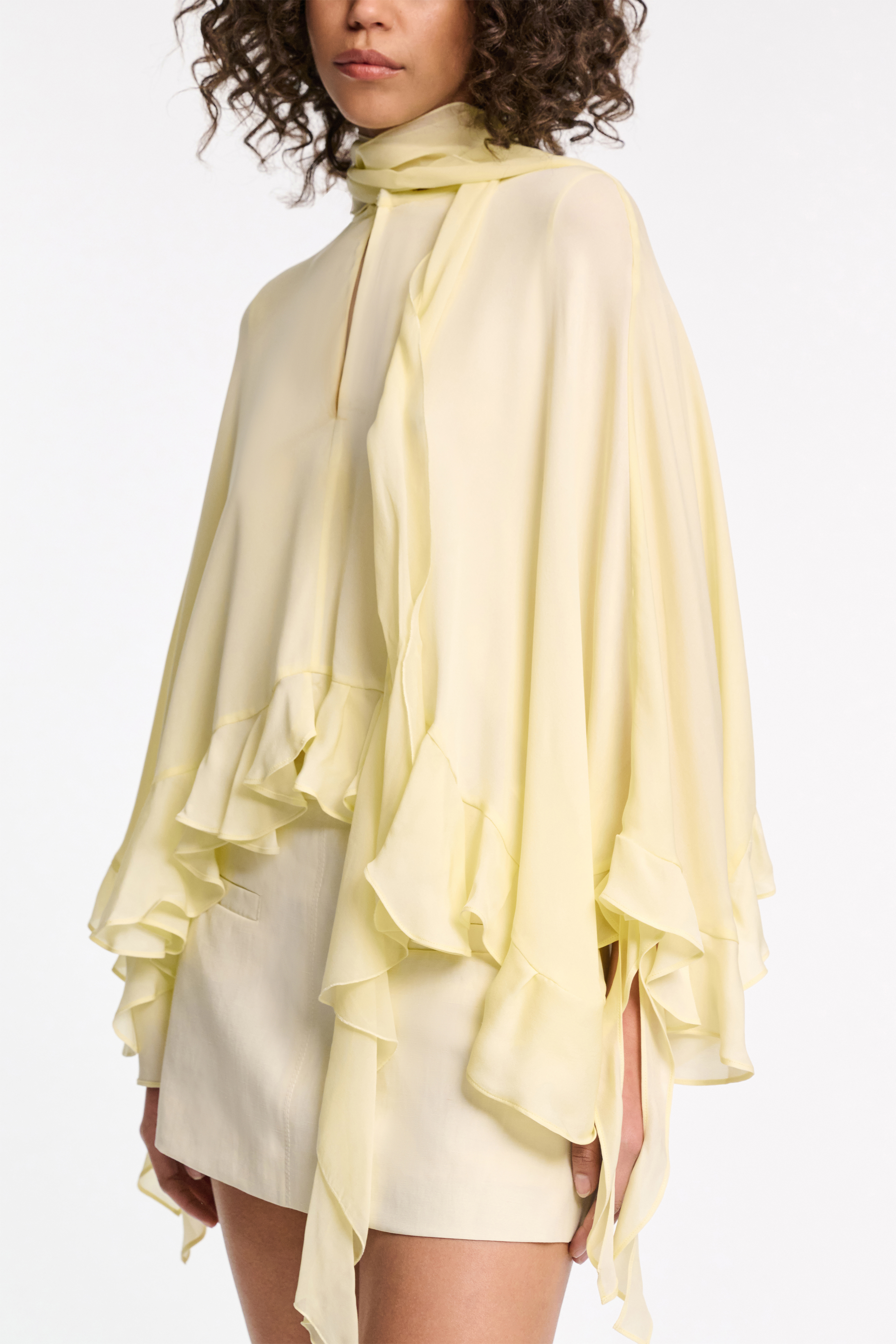The blouse has an oversized, cape-like drape and is finished with ruffle flounces at the cuffs and hem.
