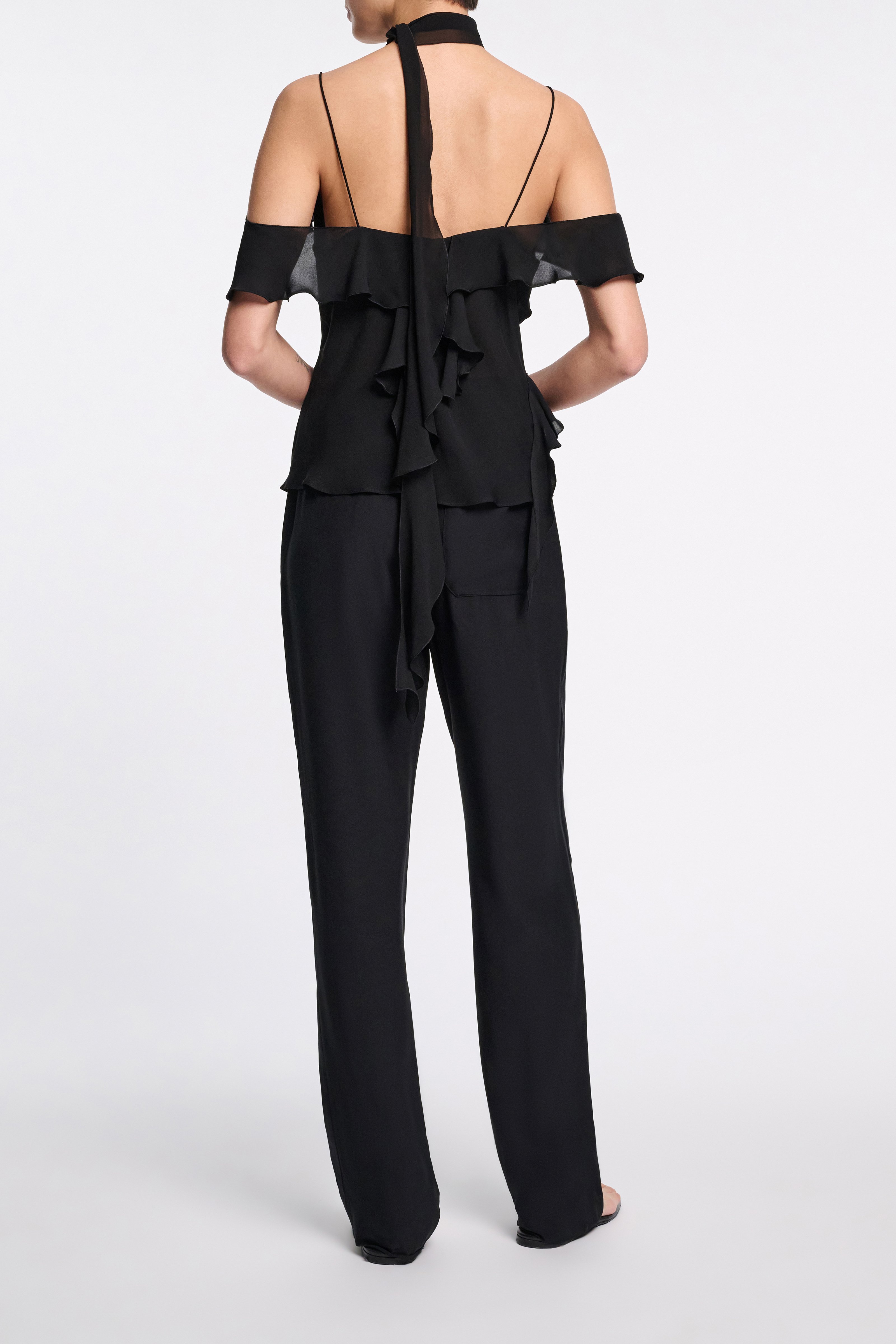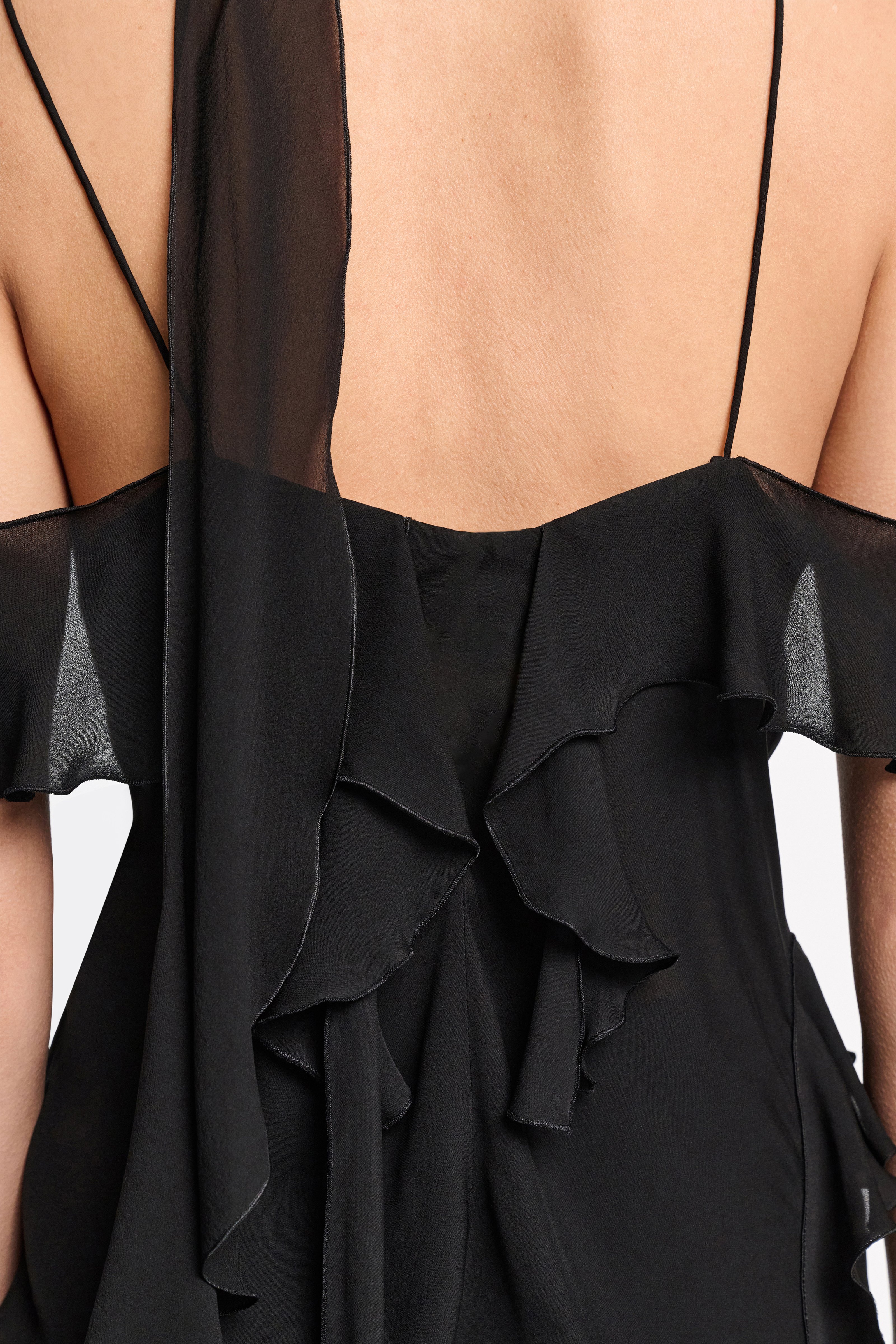 The ruffle top is made from double silk georgette and has spaghetti- and ruffle straps.