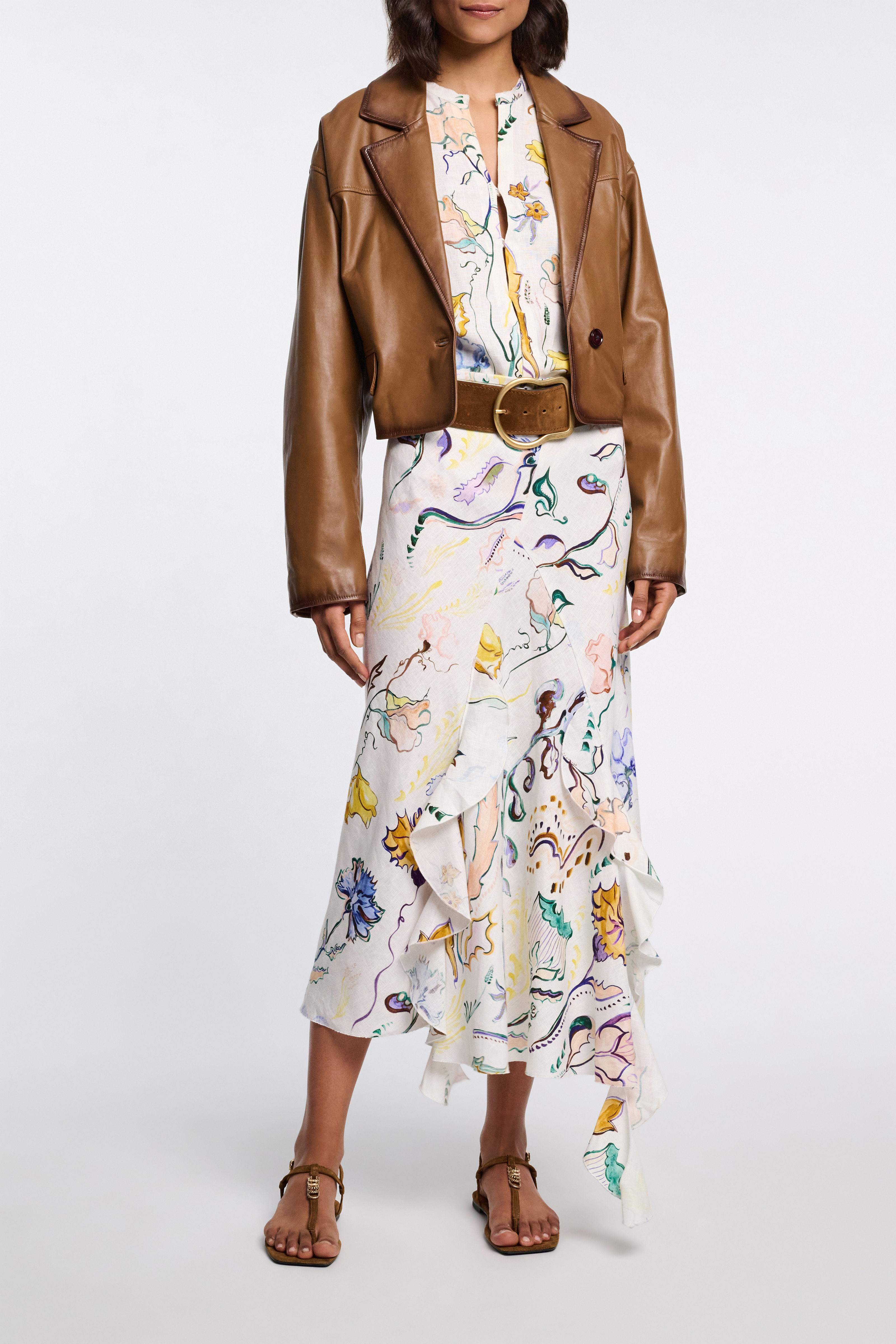 The printed linen maxi skirt has an asymmetric, bias cut and godets which create decorative flounces.
