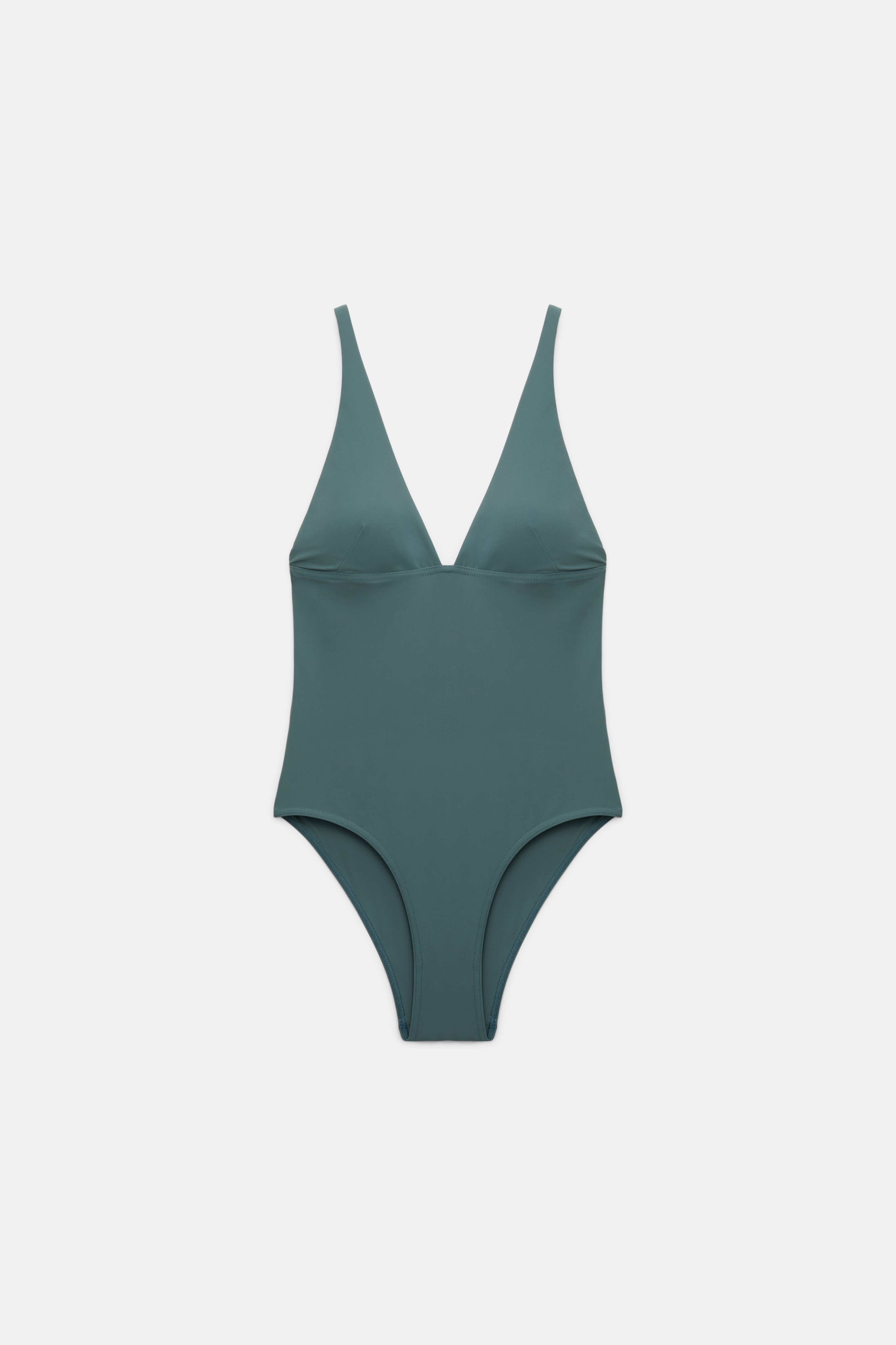 The V-neck swimsuit has adjustable straps and icy gold-tone stud detailing on the back.