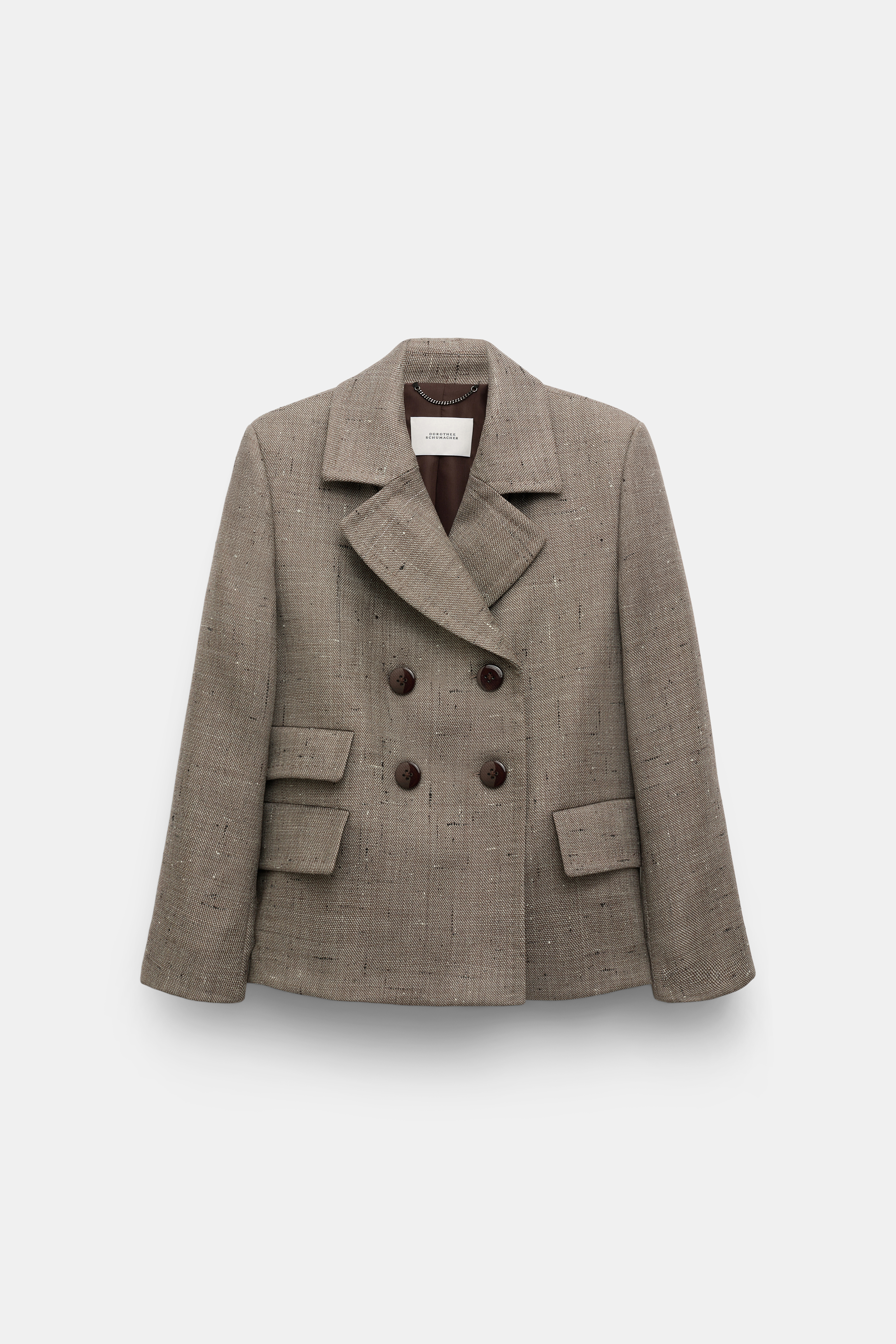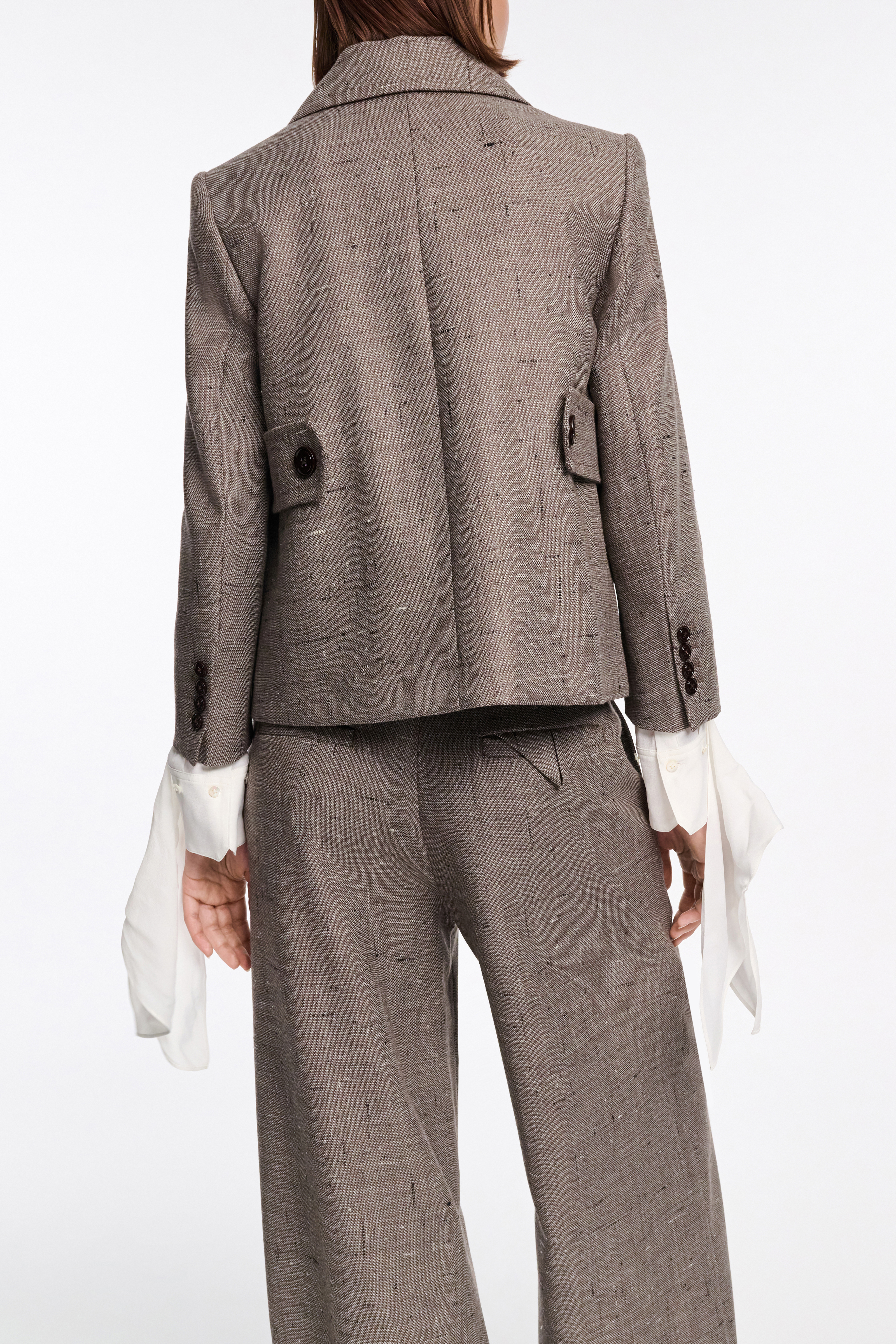 Detailed in vanilla & cacao nibs virgin wool tweed, the blazer has a boxy cut and defines our business look this season.