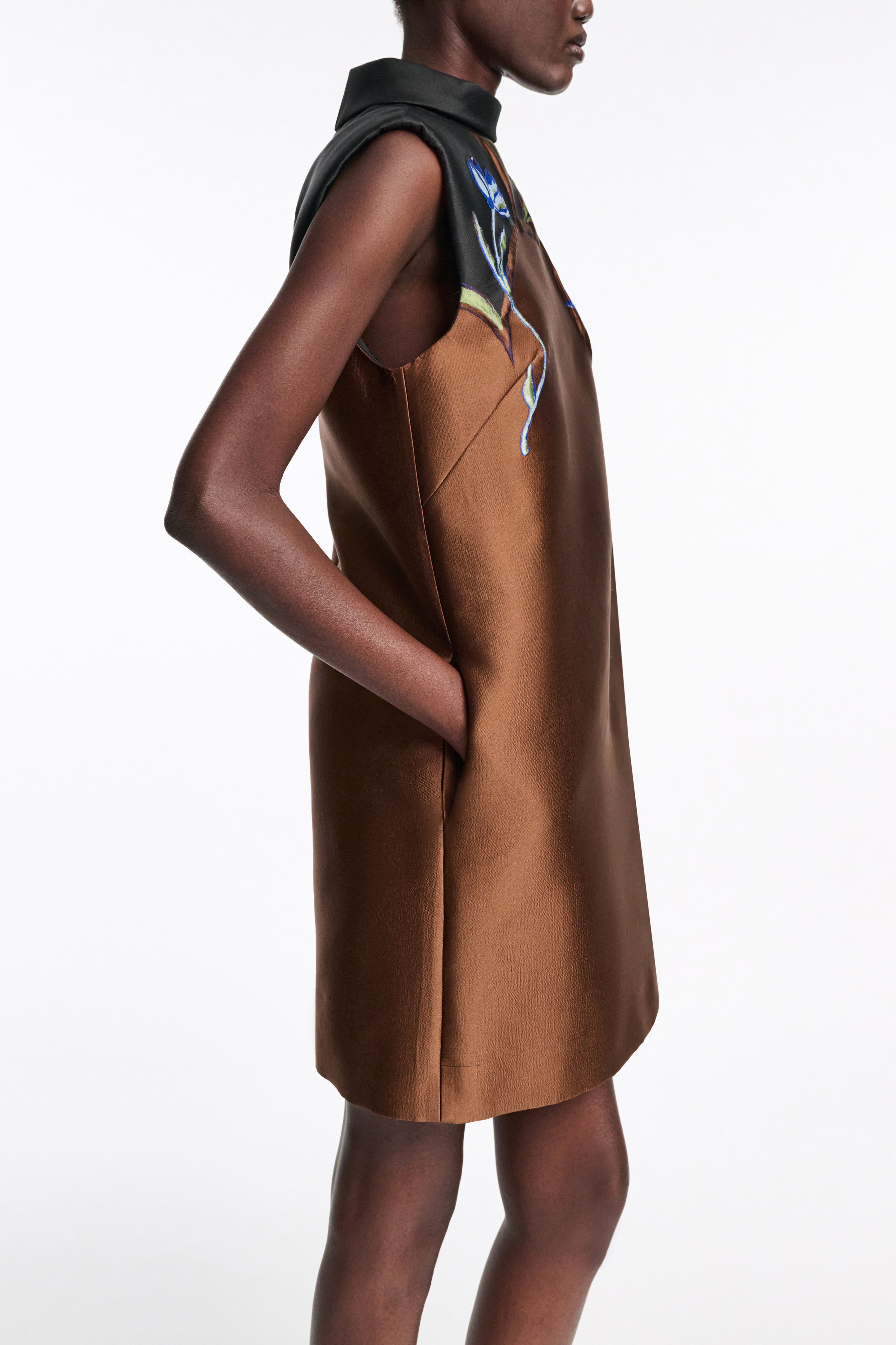 The positioned print becomes a patchwork combination on the stand collar cloque jacquard dress.