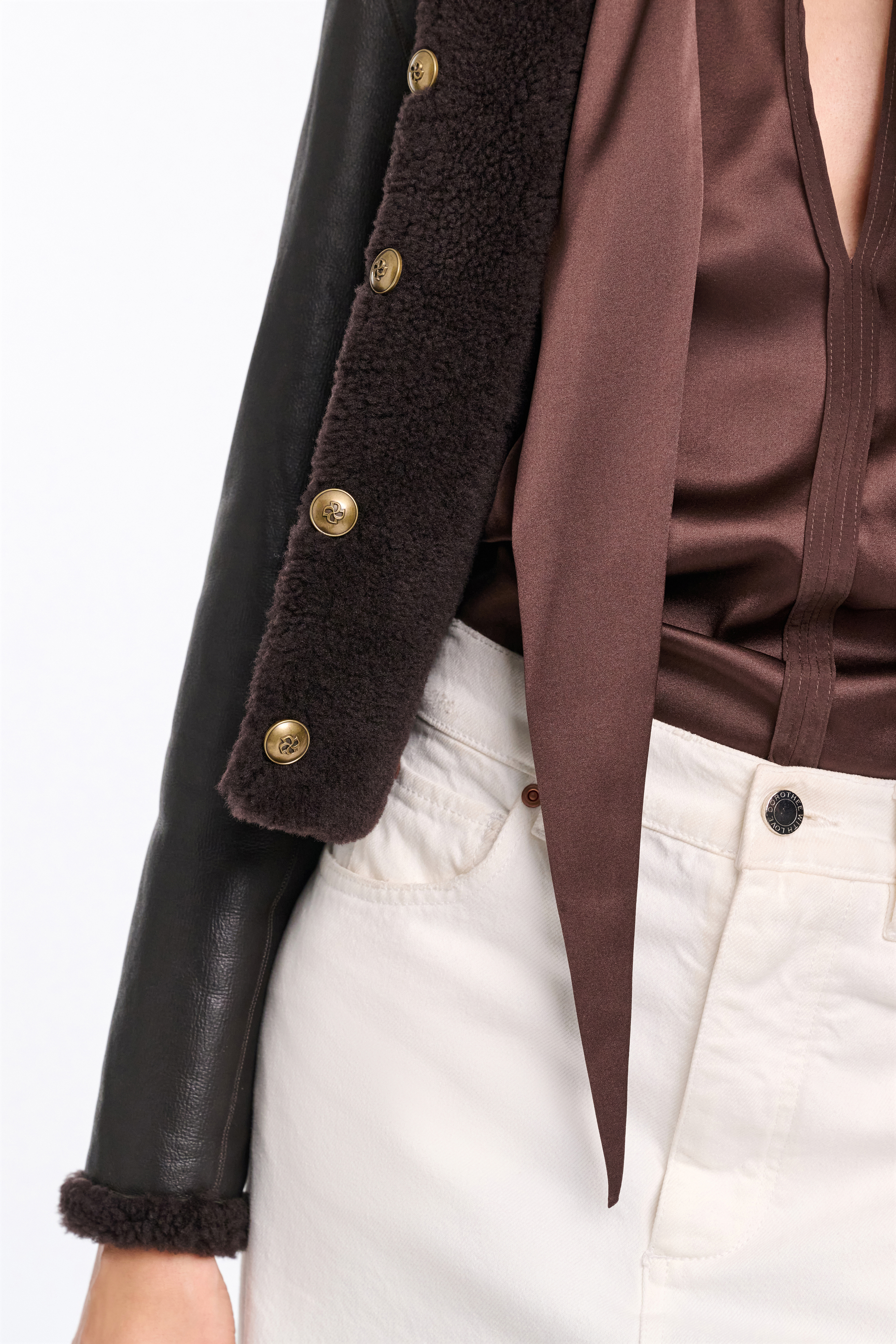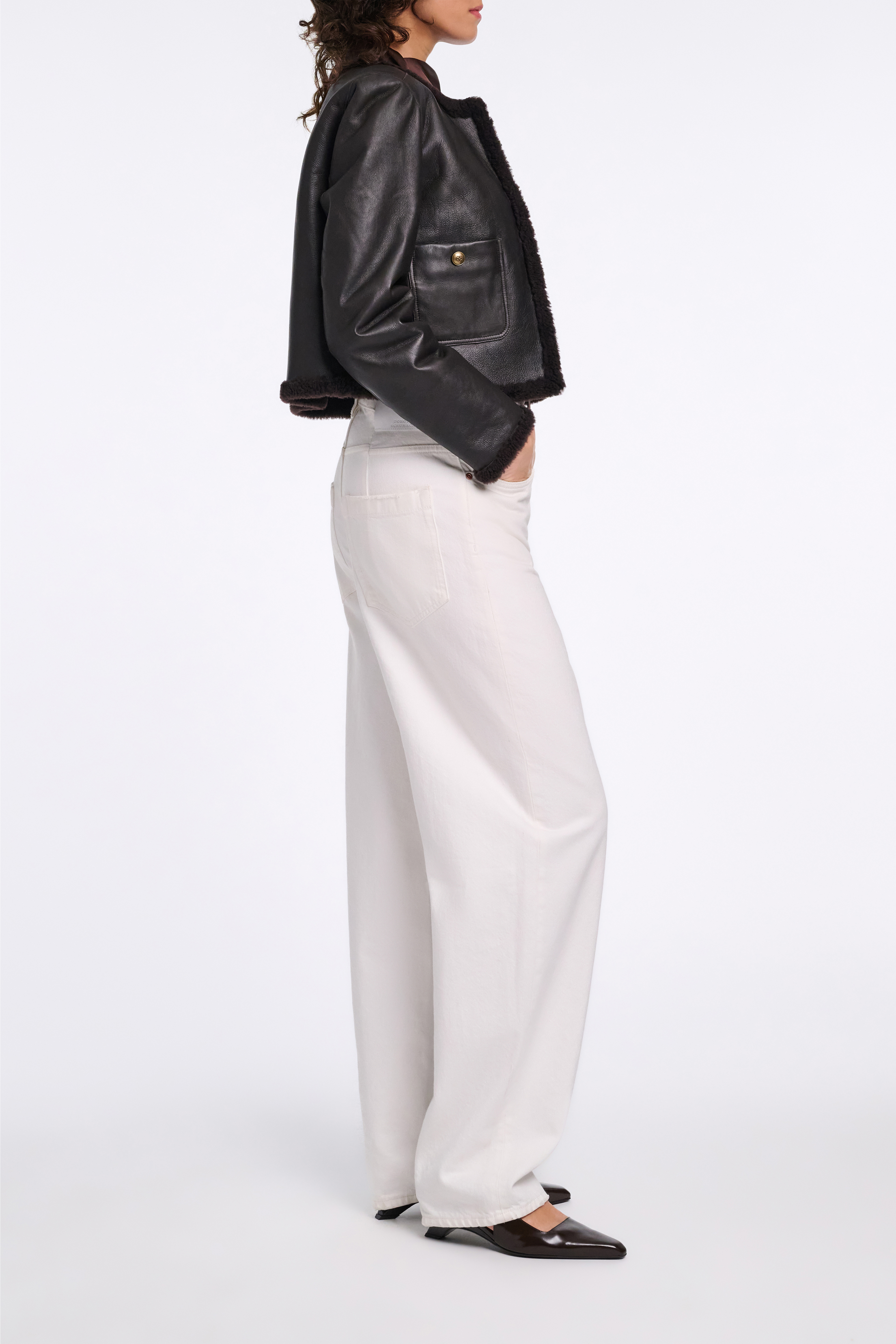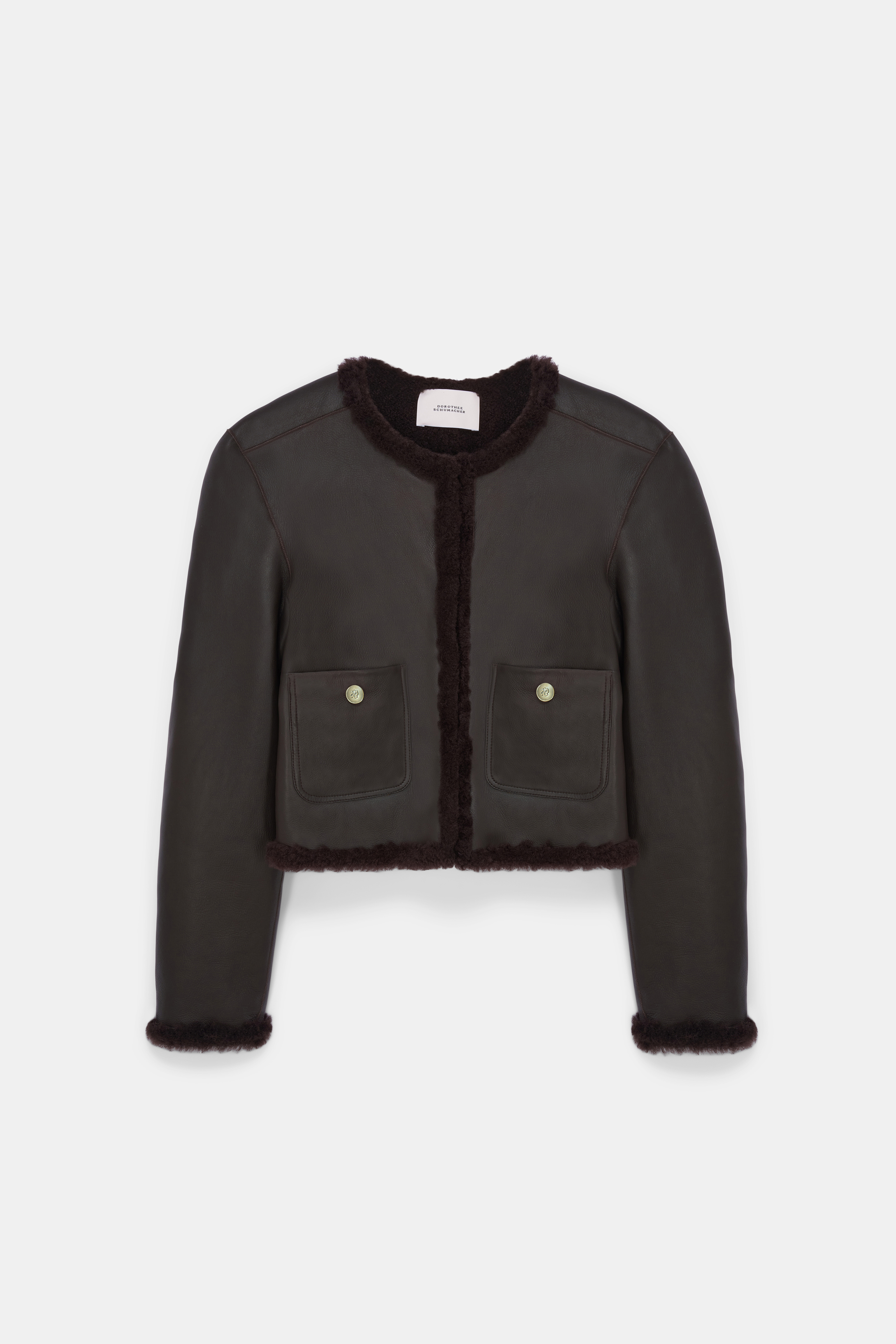 The cropped shearling jacket is reversible and features gold-tone buttons and a slight A-line shape.