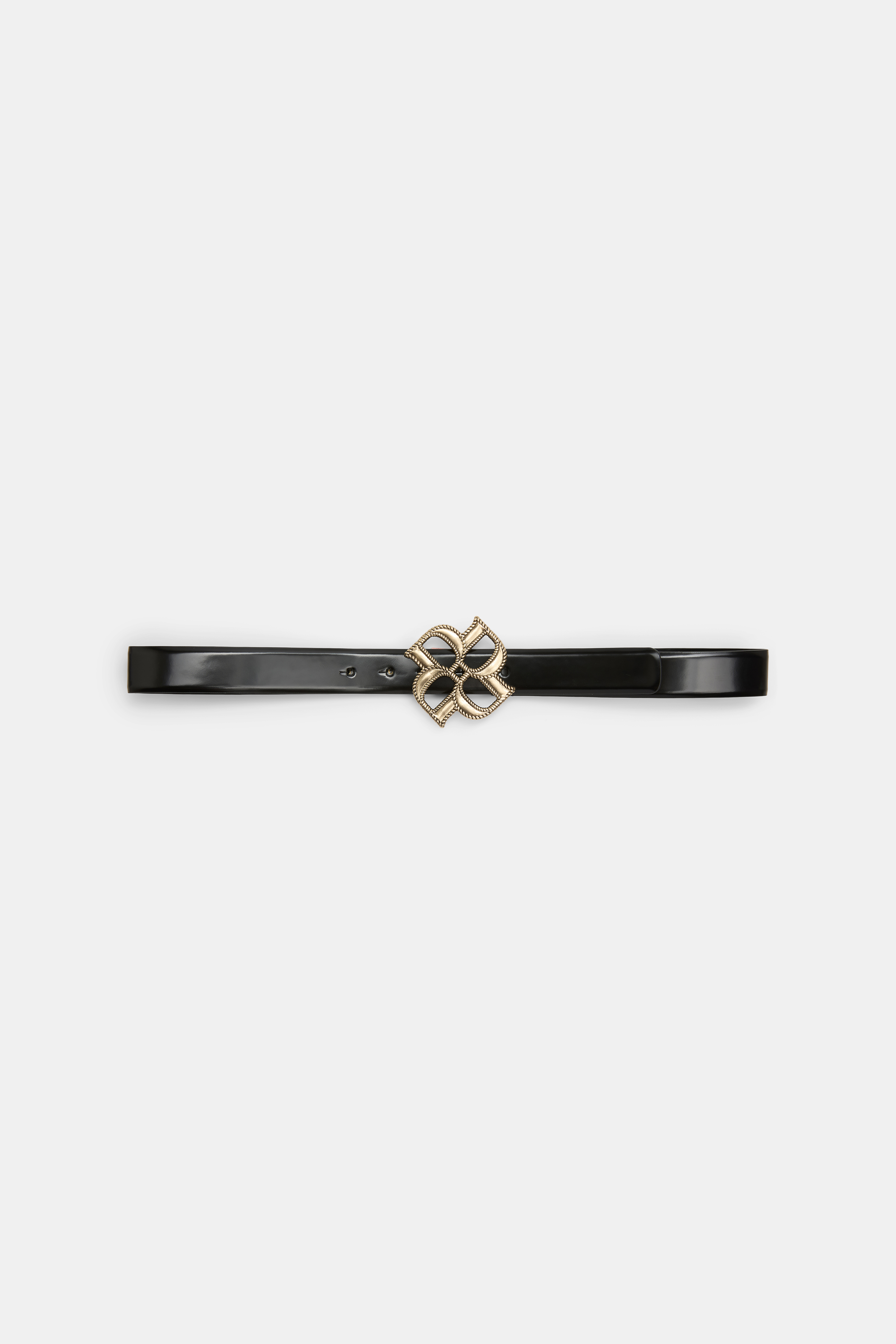 The mid-shine calfskin belt has a D-rose buckle and adjustable push stud closure.