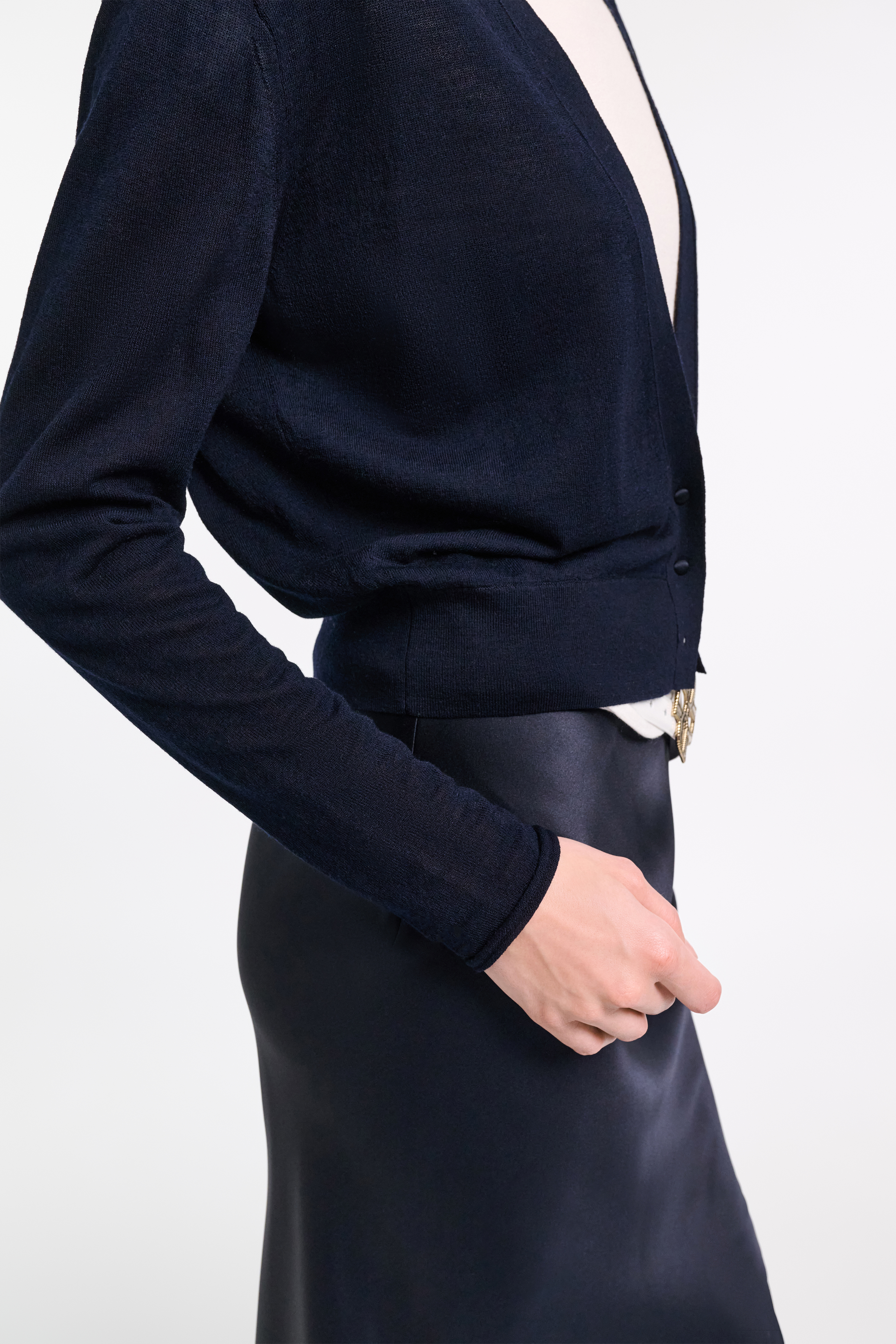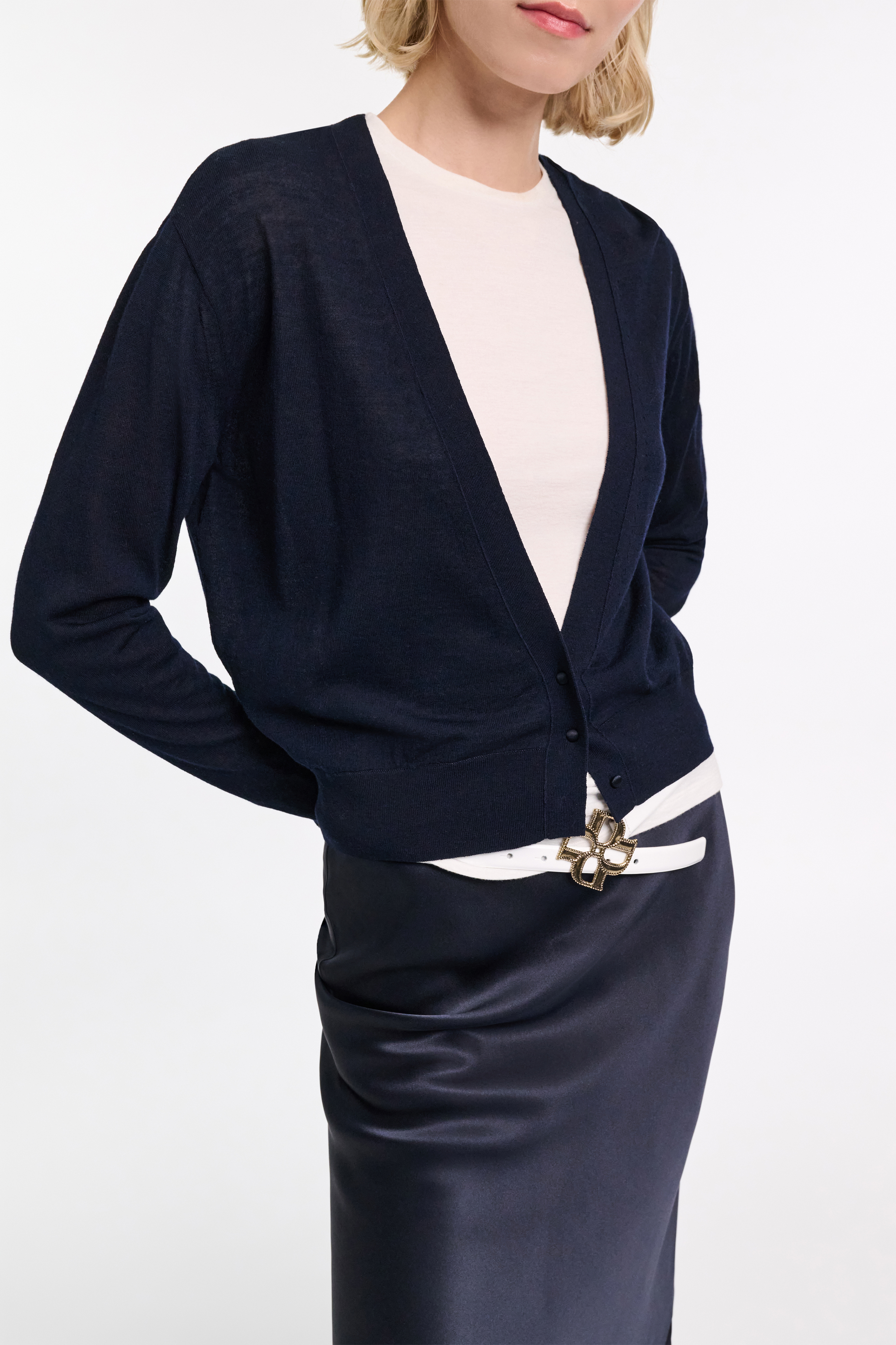 Ideal for layering, the cardigan becomes a twinset with the matching knit top.