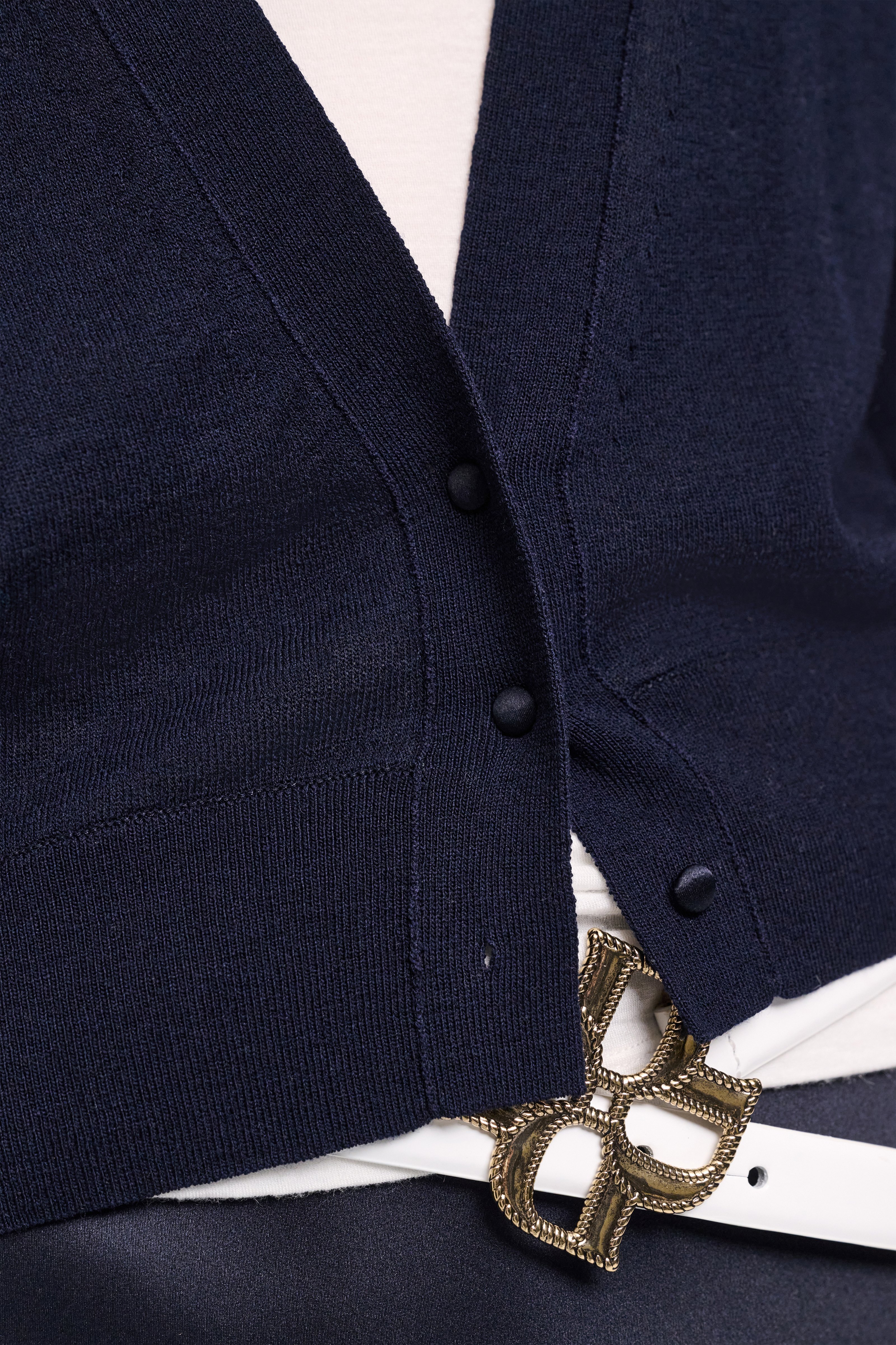 The virgin-wool-cotton cardigan has a deep V-neckline and dropped shoulders, creating a relaxed drape that tapers at the hemline.