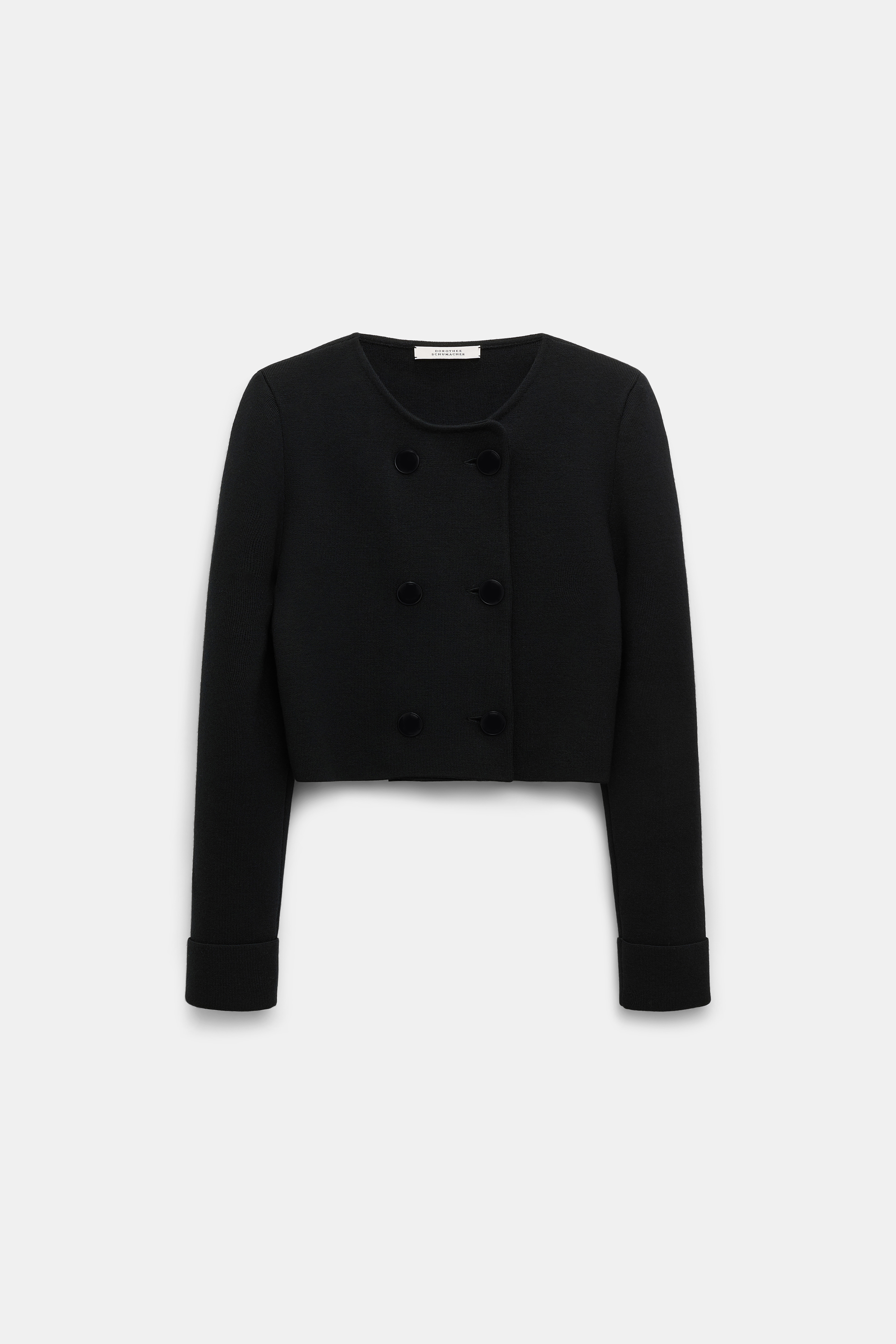 Channeling a retro-modern vibe, the knit jacket is collarless and features a double-breasted front and metal buttons.