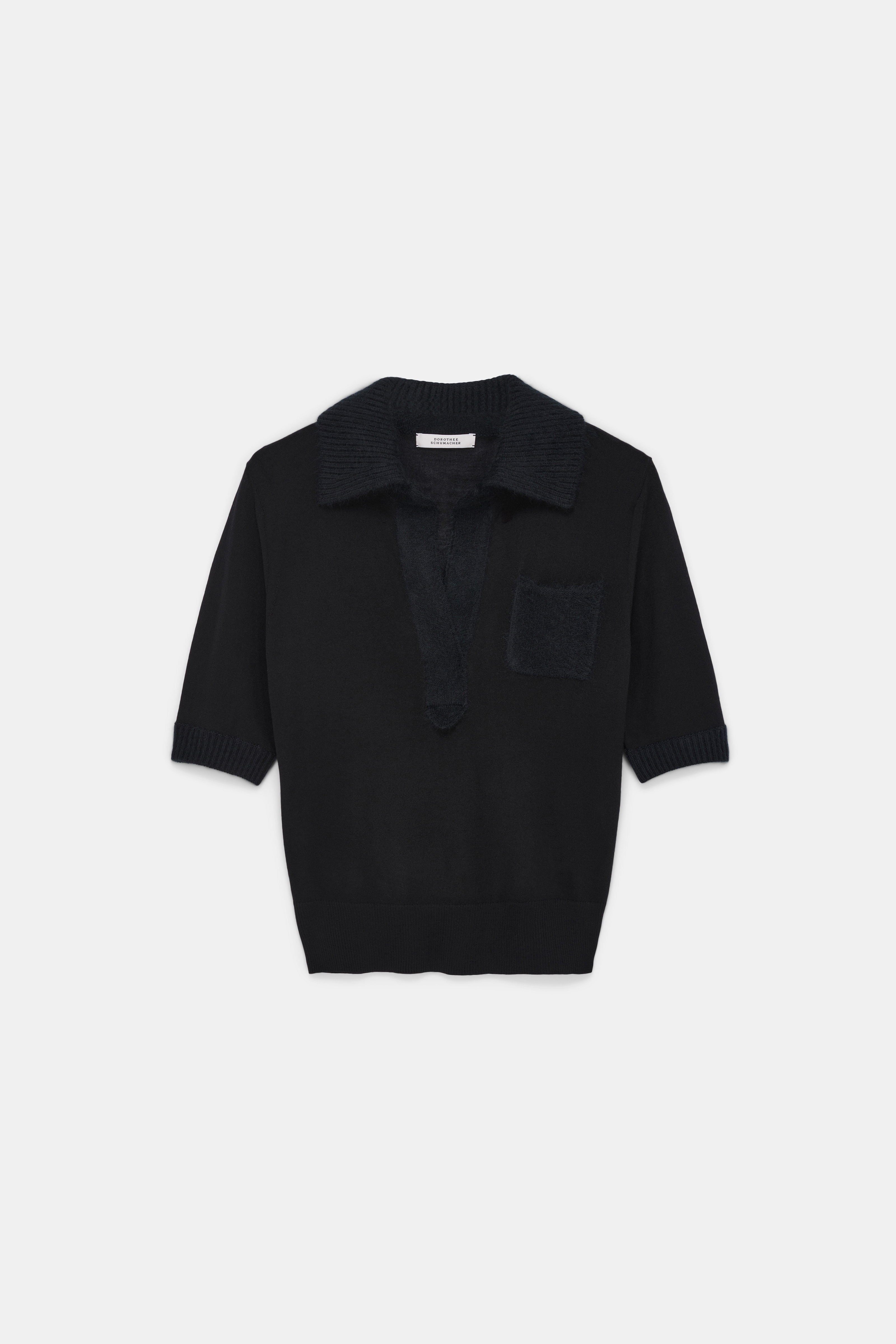The polo style top is knit in virgin Merino wool and features an open collar & detailing in our softest, fluffy wash finish Merino-cashmere mix.