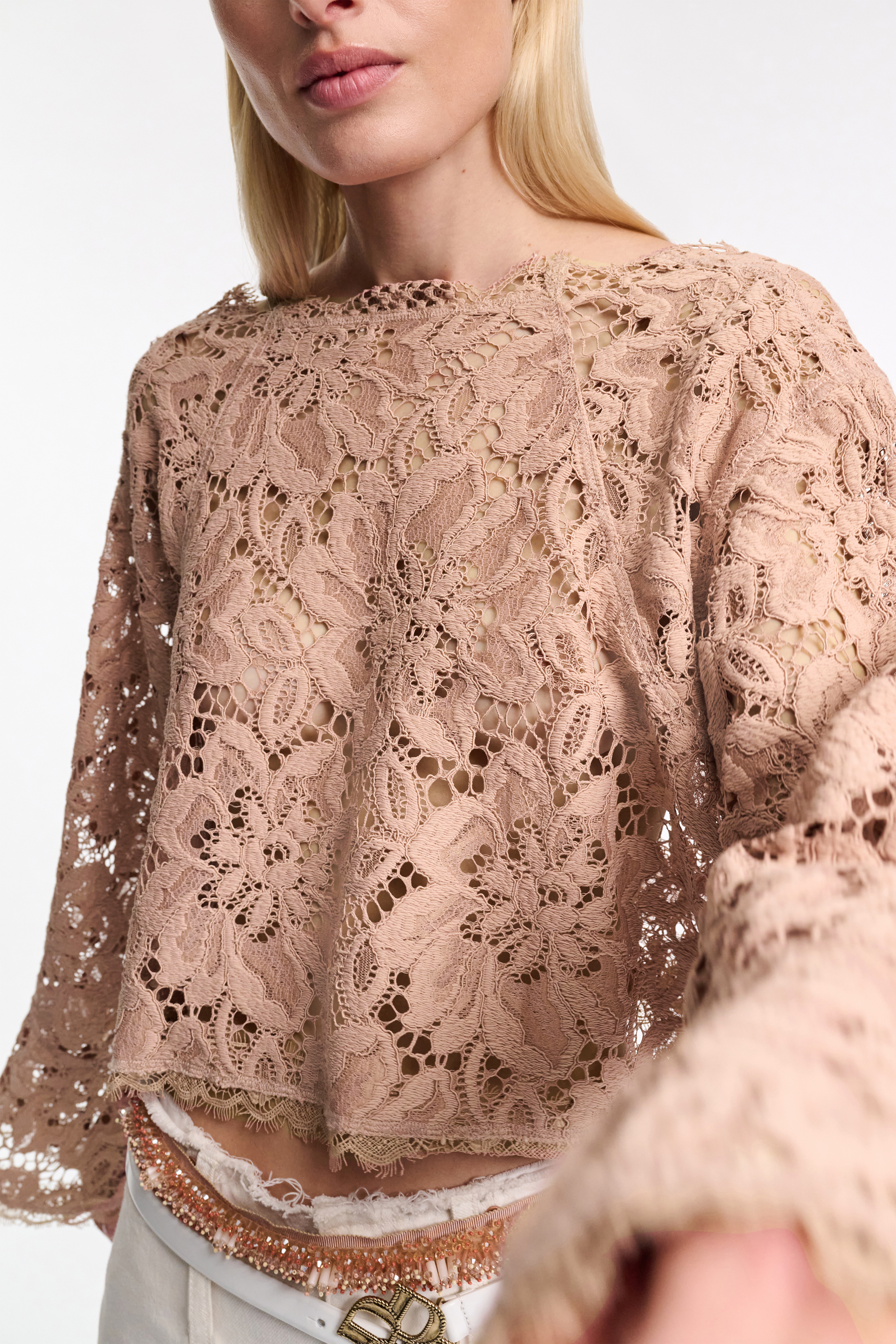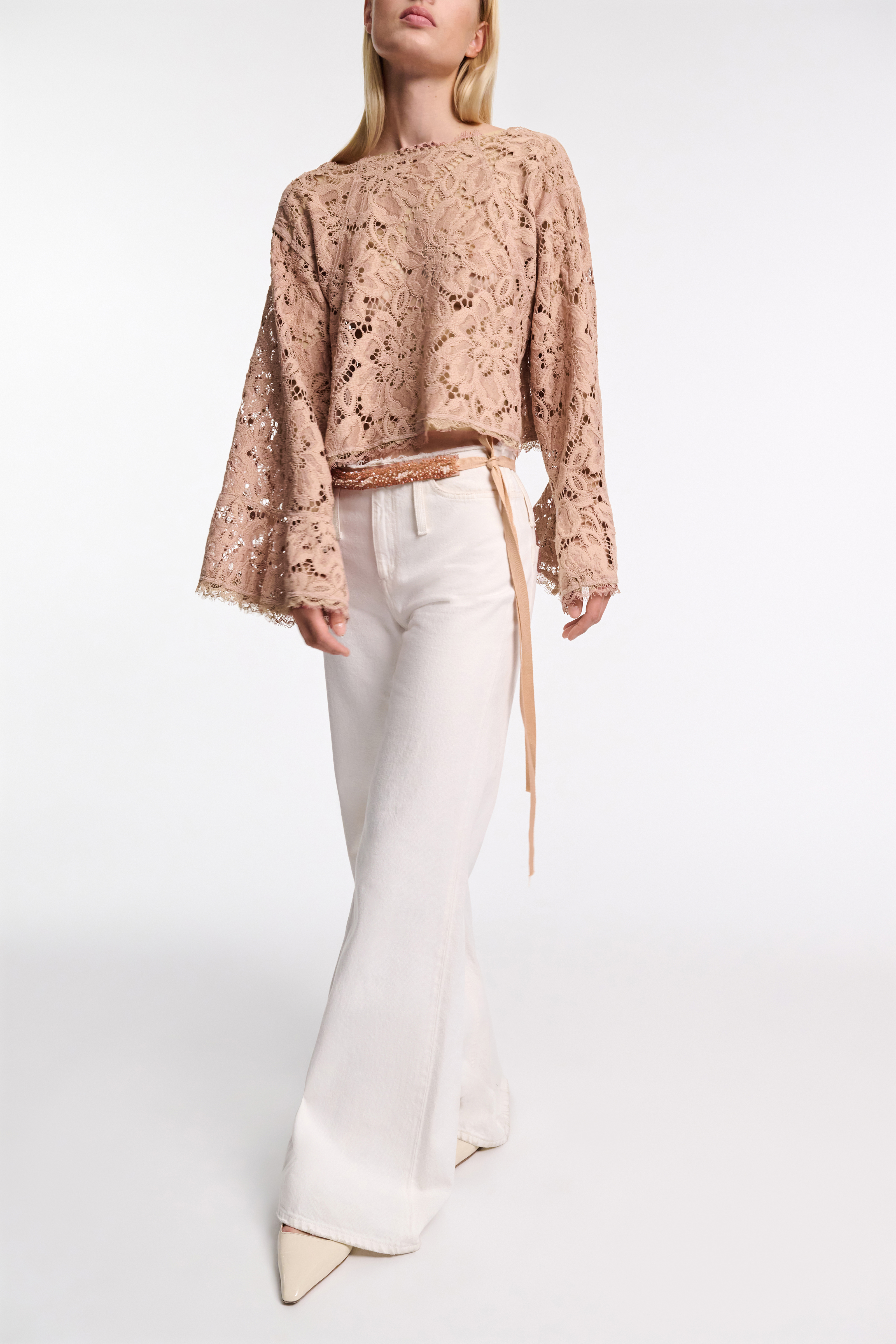 The peek-a-boo blouse is detailed in eyelash lace and has flared trumpet sleeves.