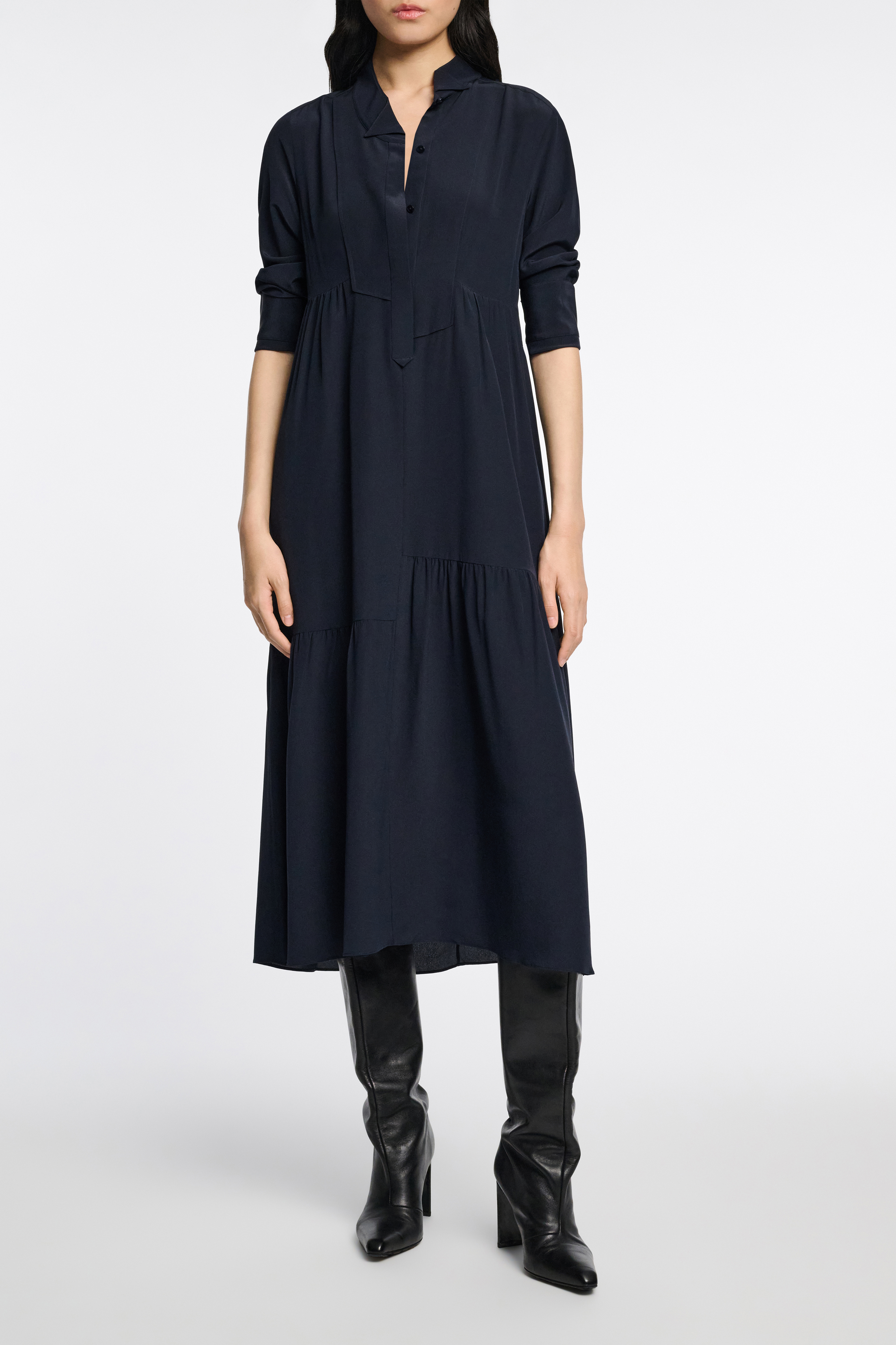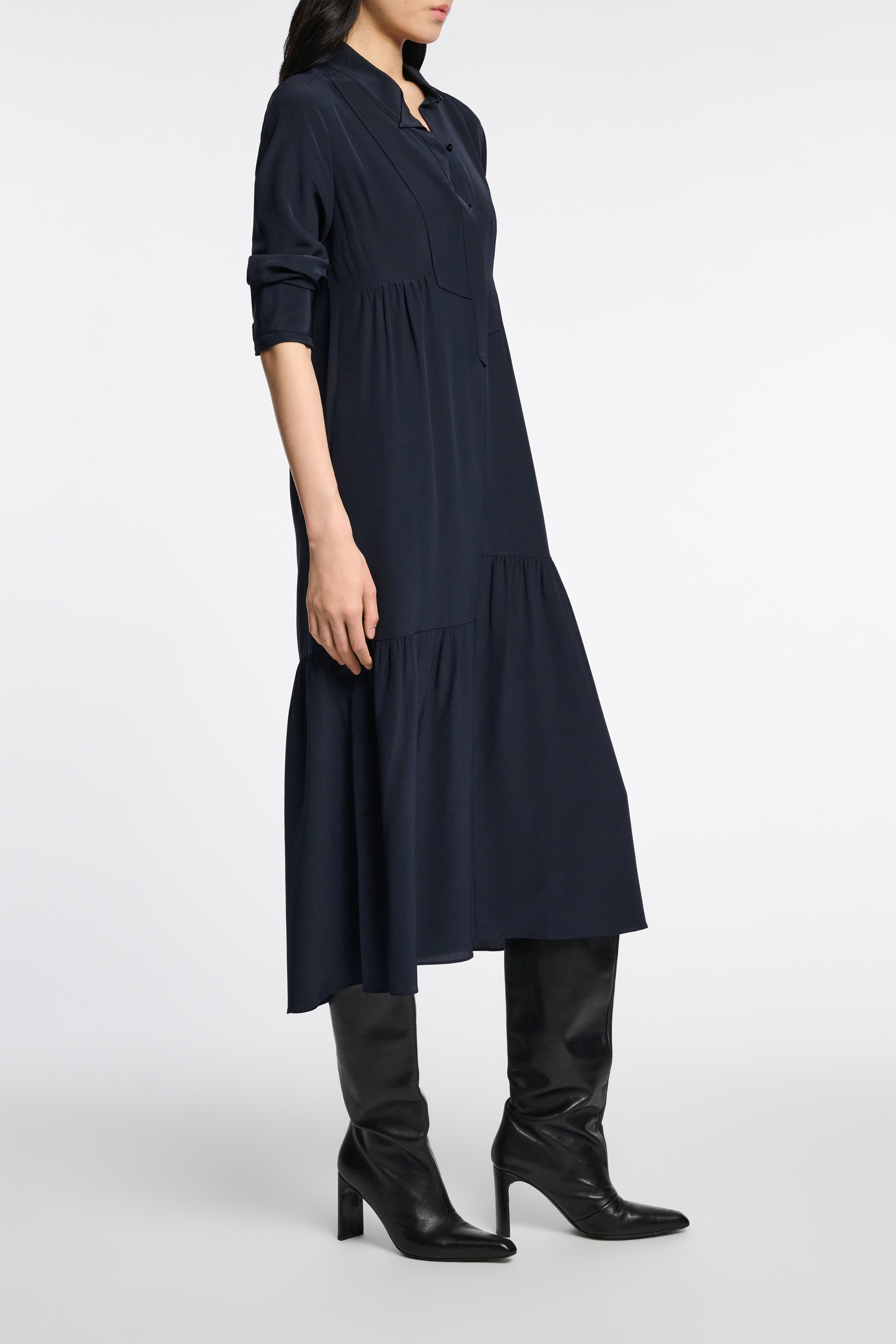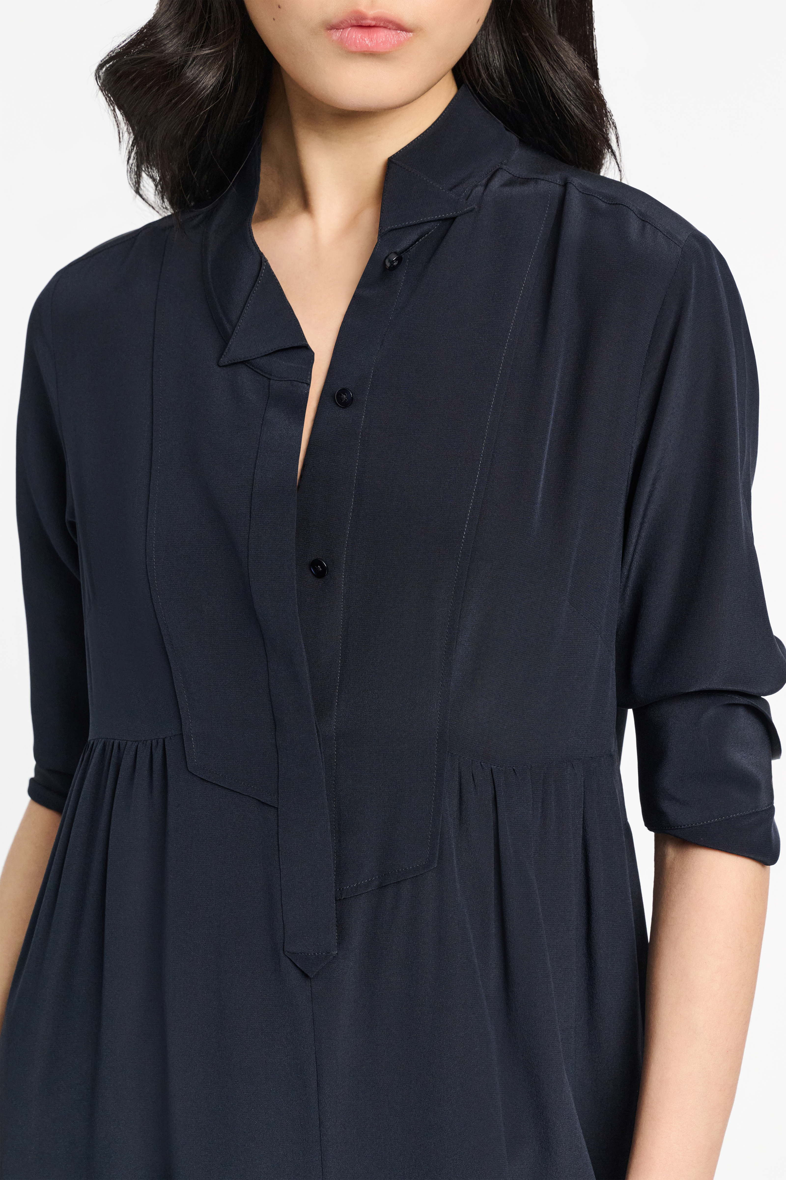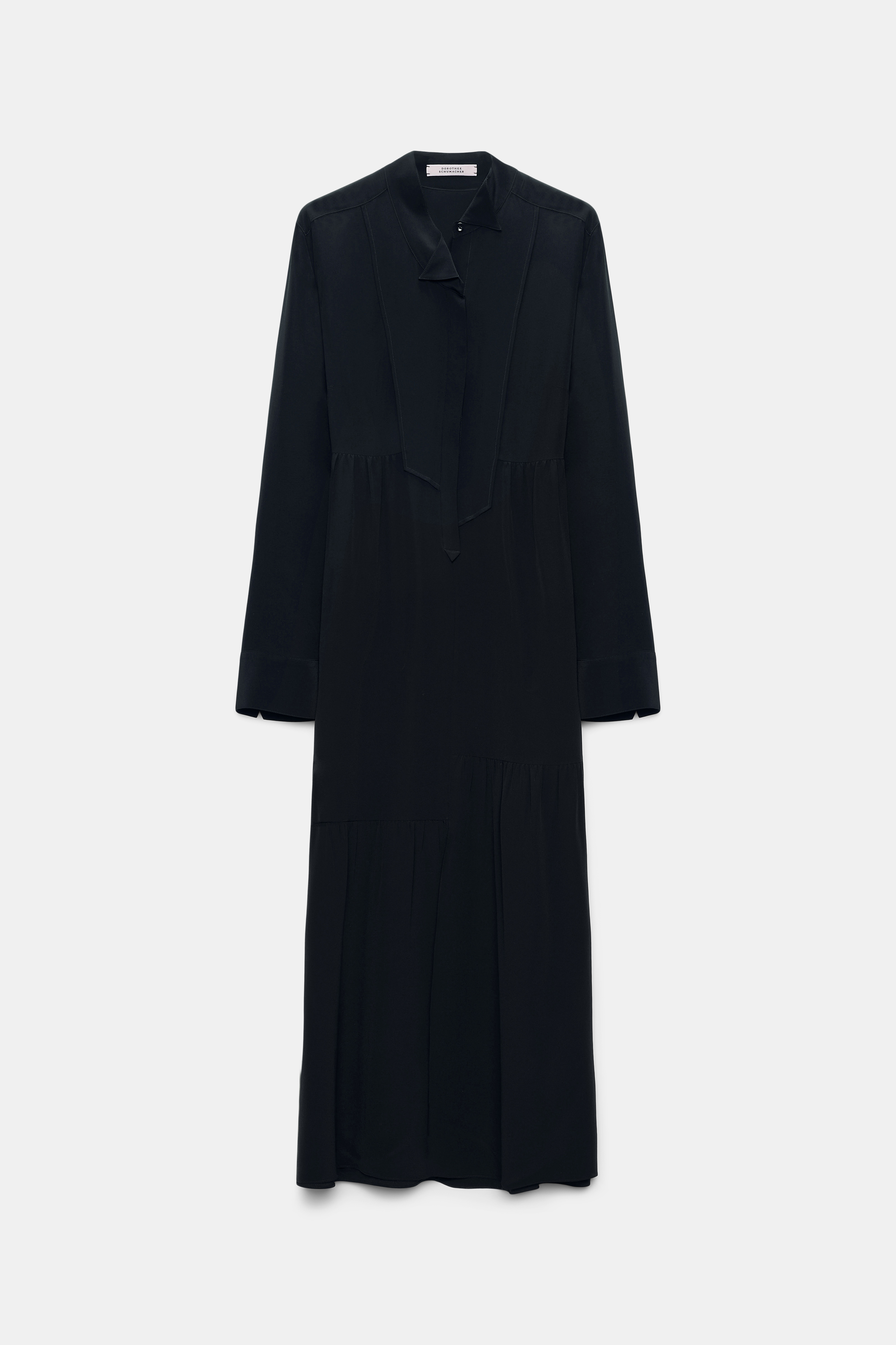 The long sleeve silk dress has an asymmetrical crêpe de chine collar and plastron.