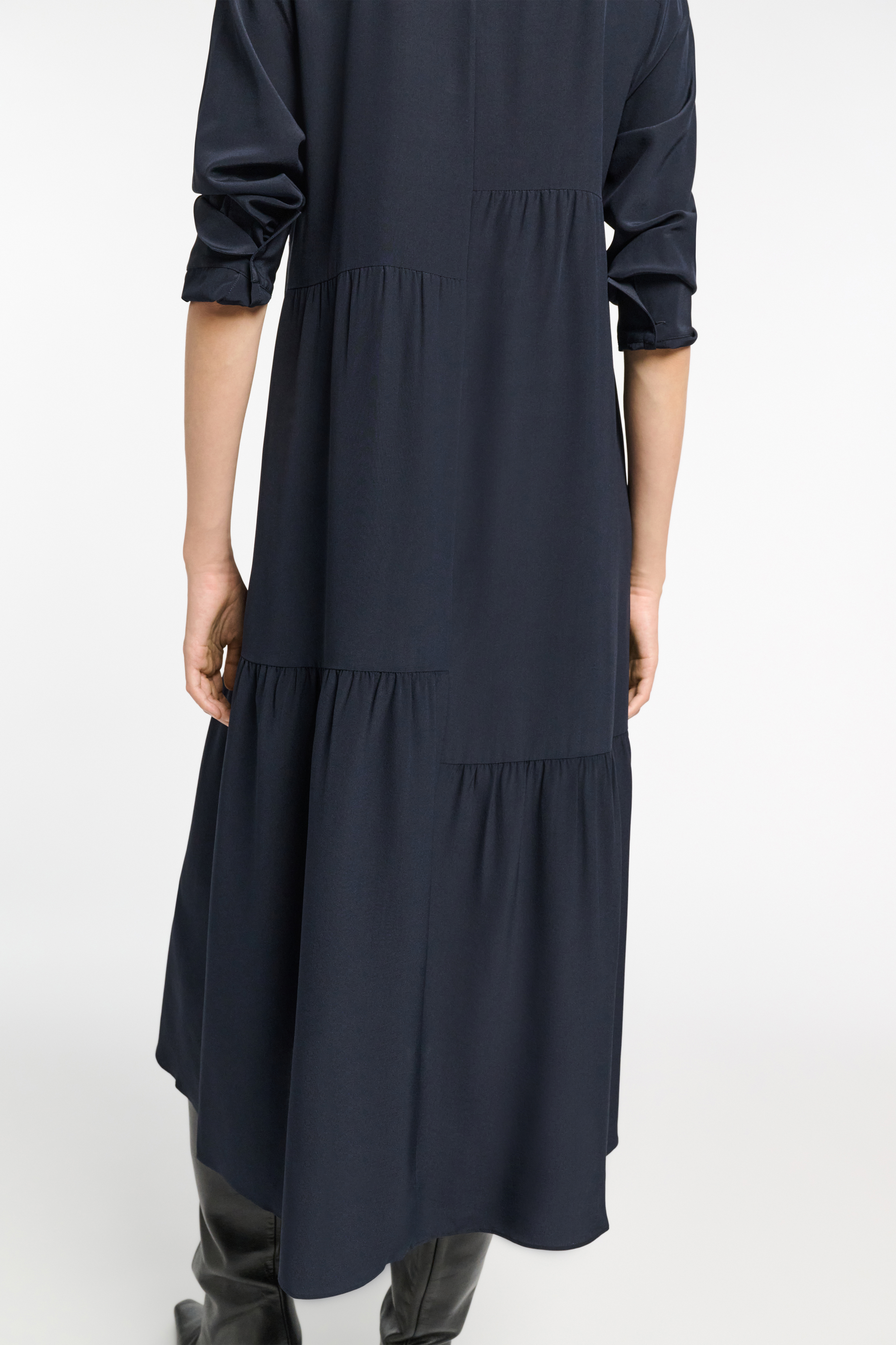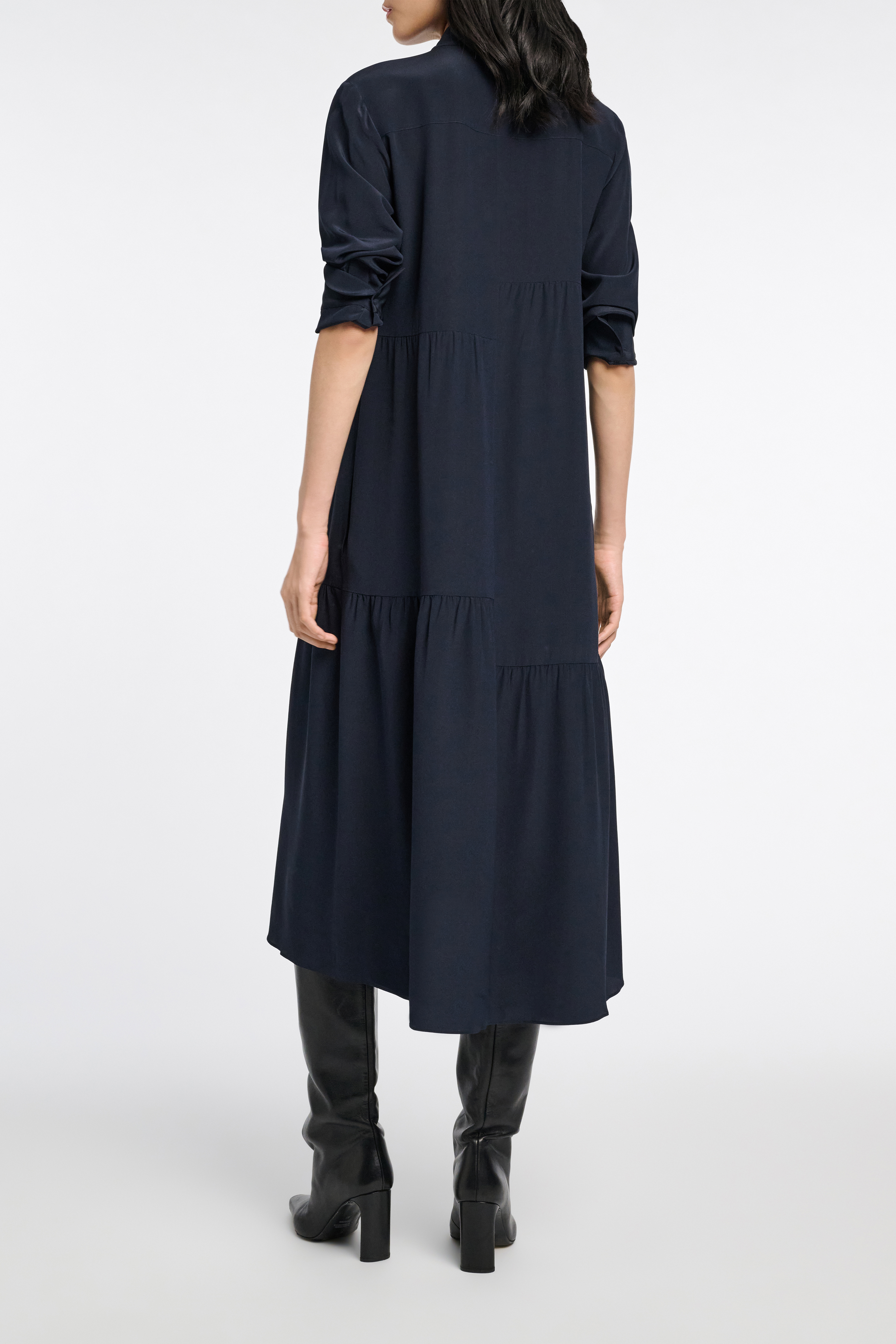 The relaxed silhouette has a hidden front button placket and tiered skirt detail lending easy volume to the hem.