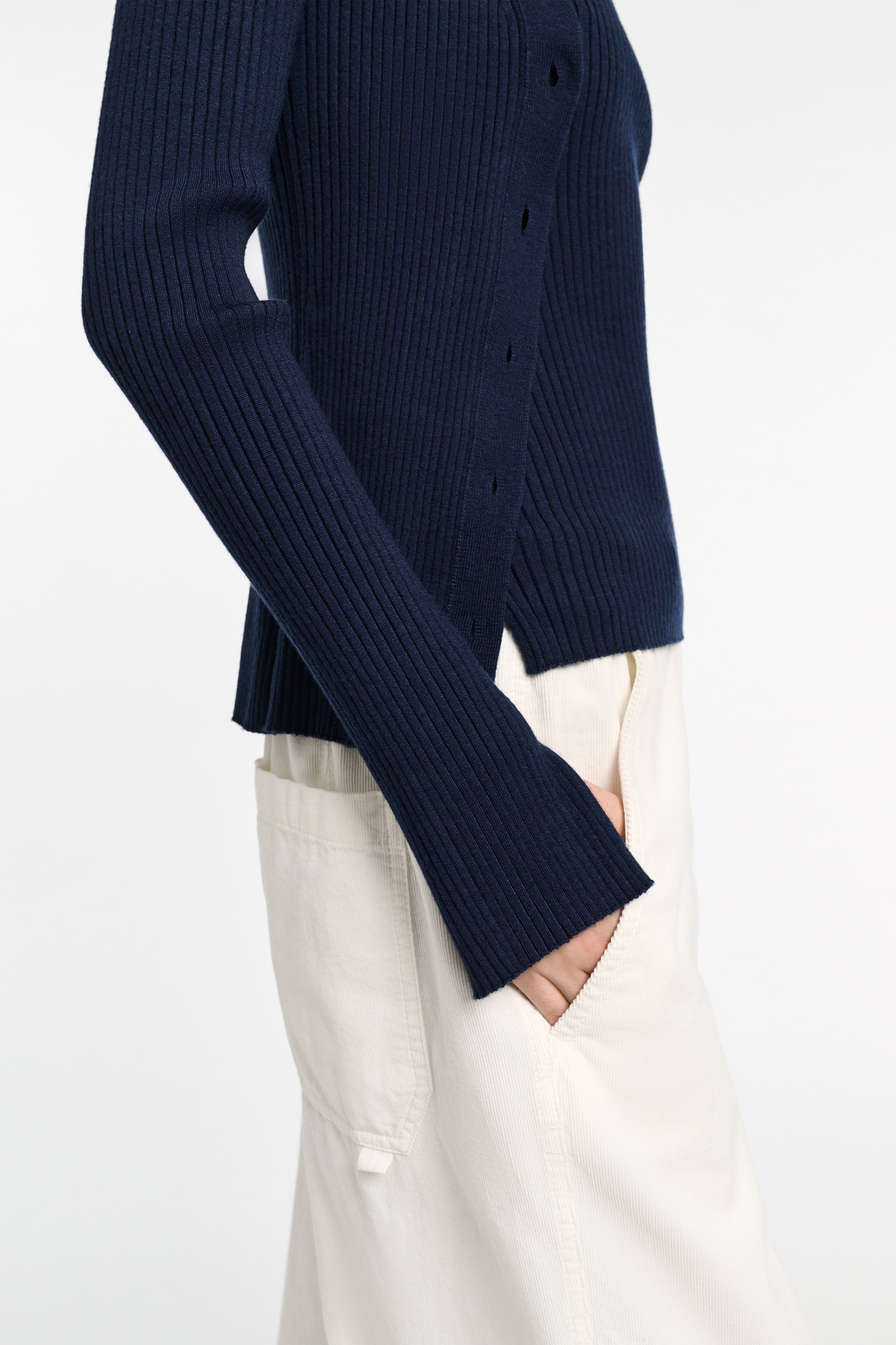 The V-neck cardigan is made from a stretchy ribbed wool-silk blend.