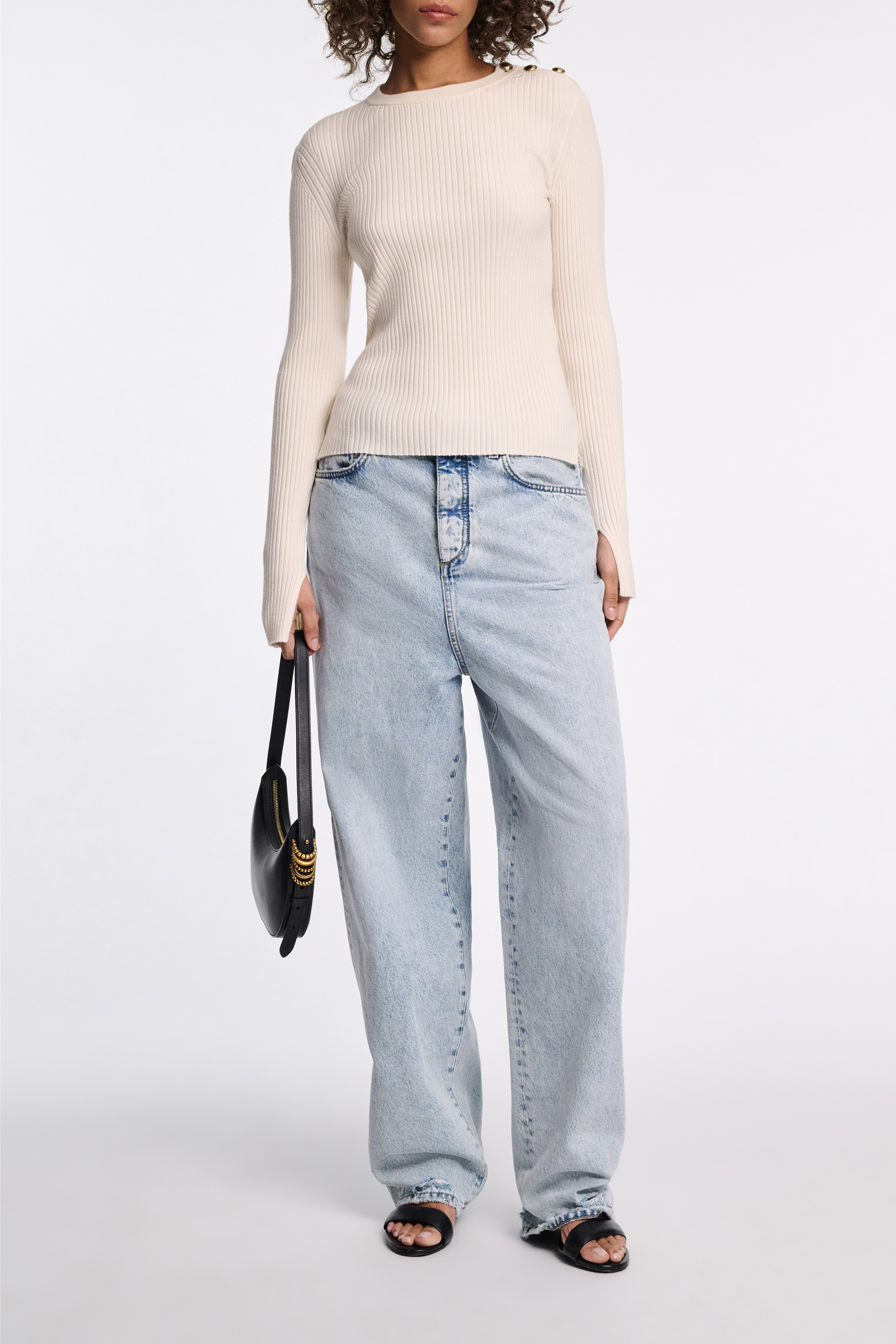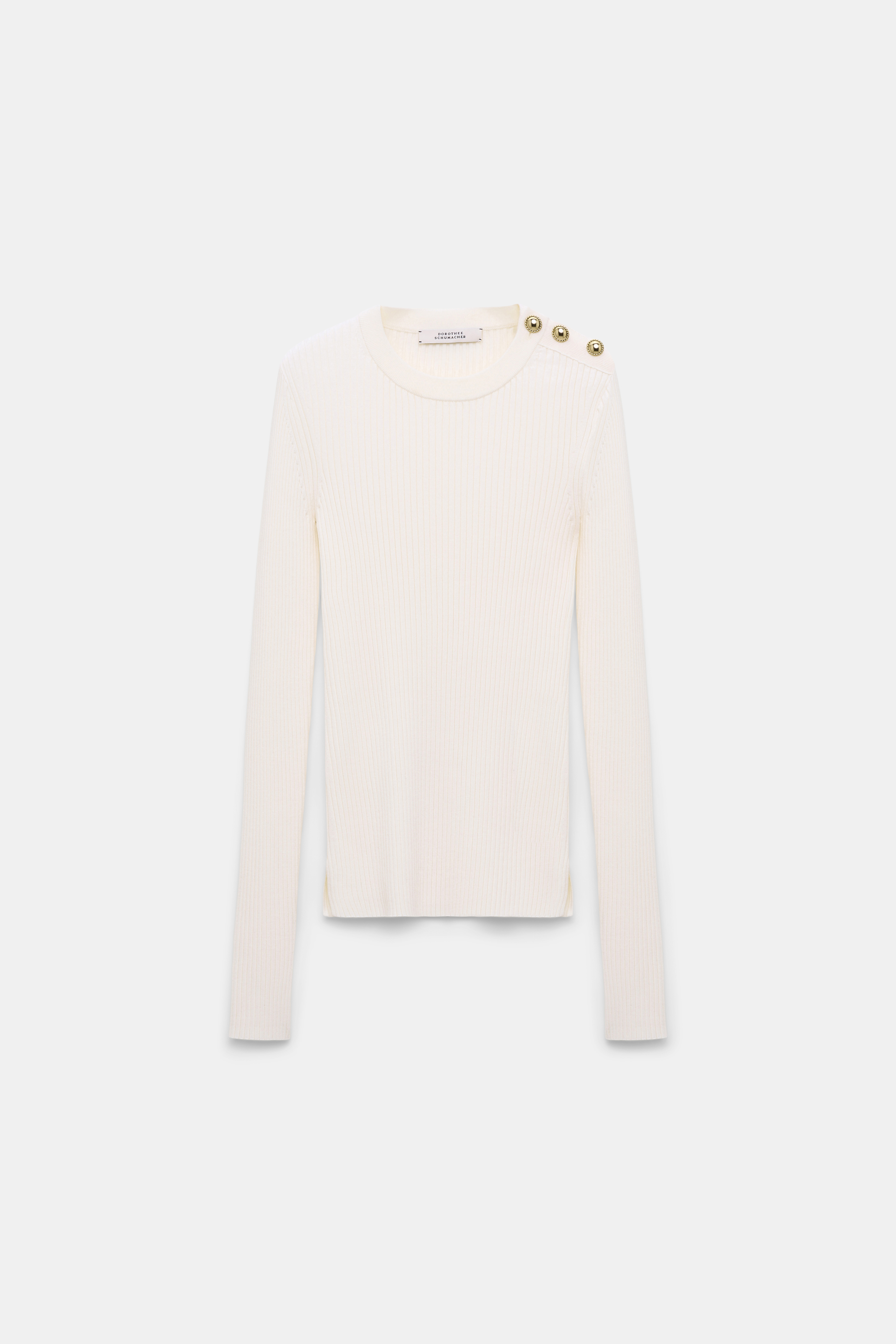 The round neck pullover is made from a stretchy ribbed wool-silk blend and has gold-tone buttons on one shoulder.
