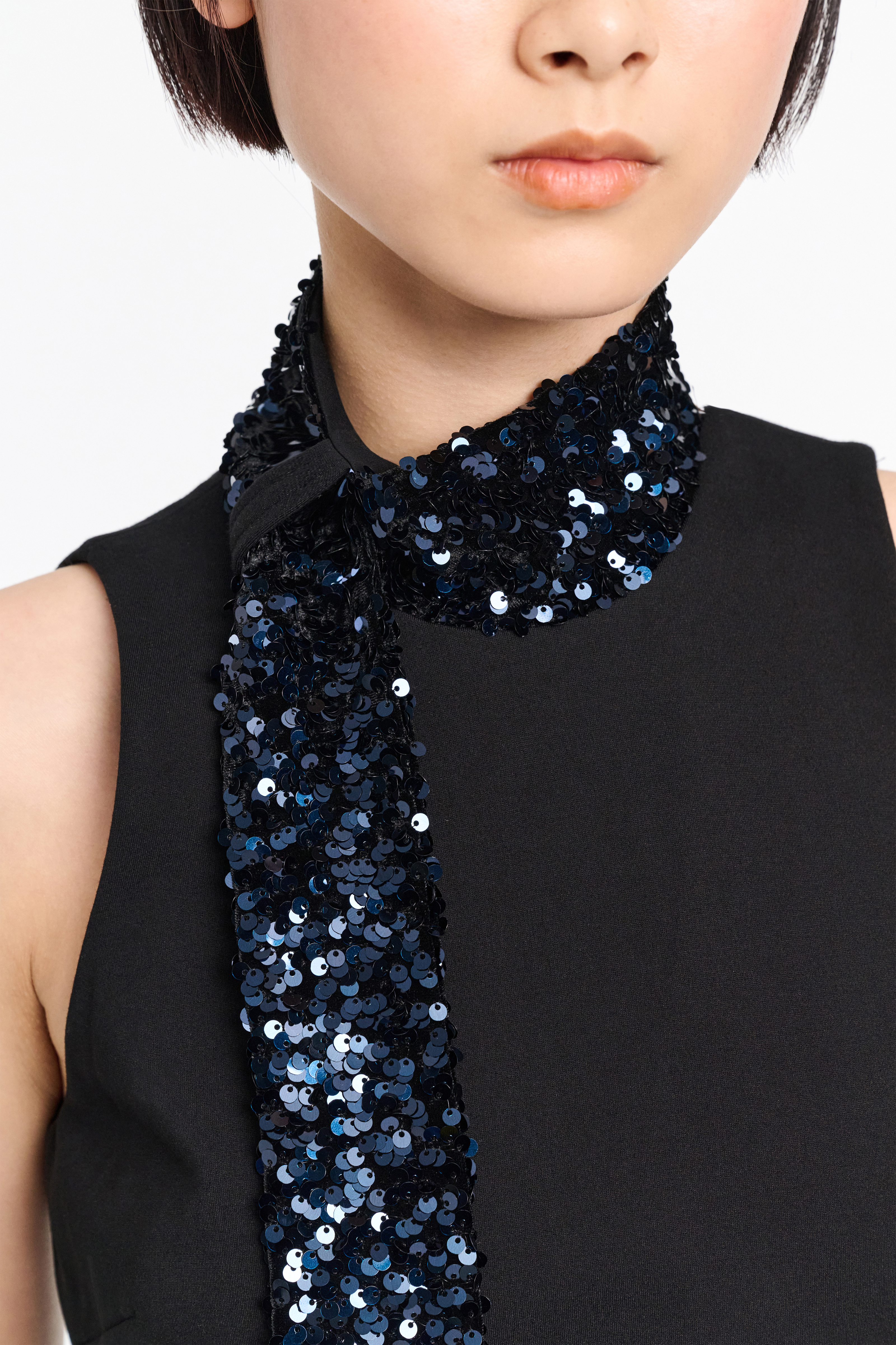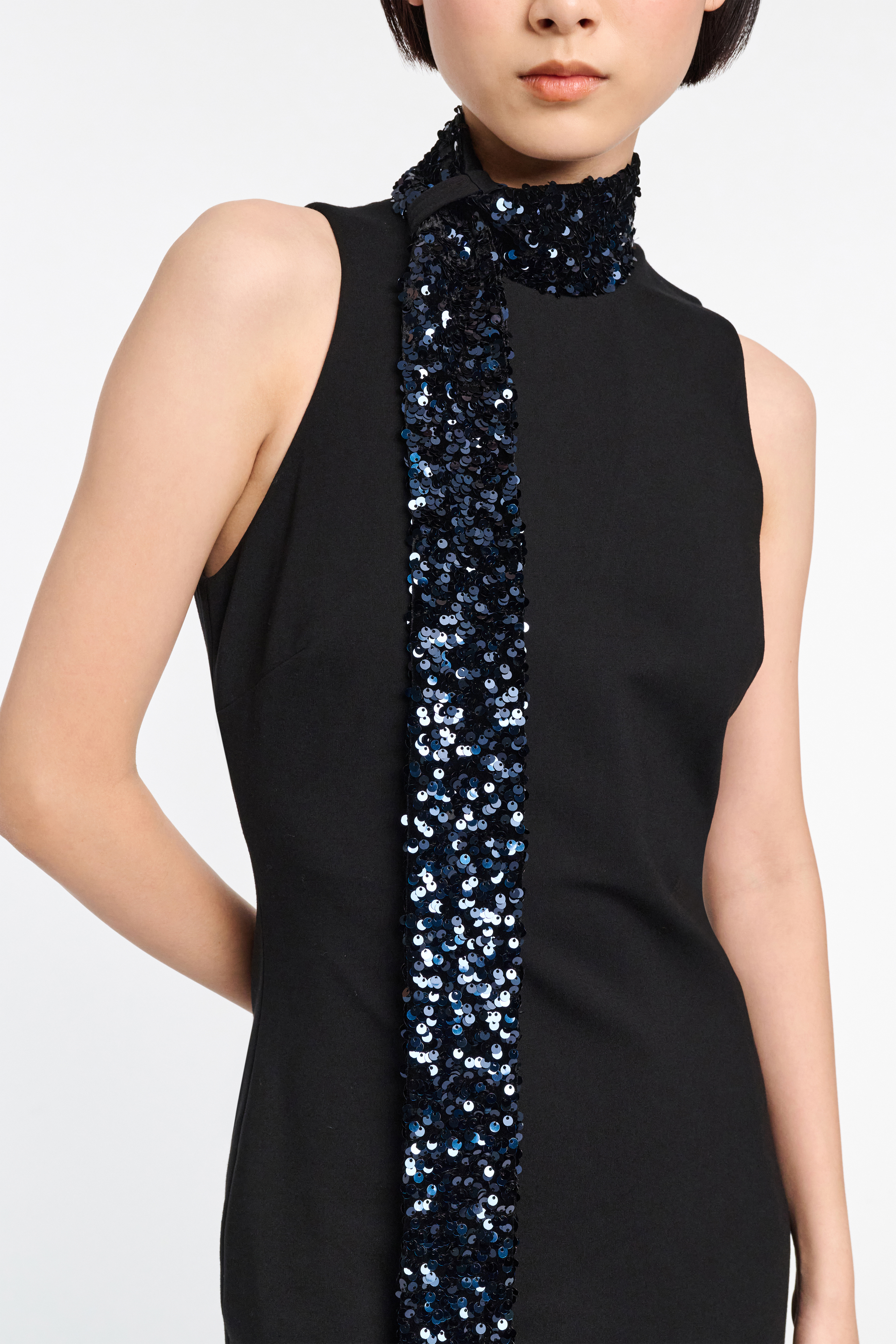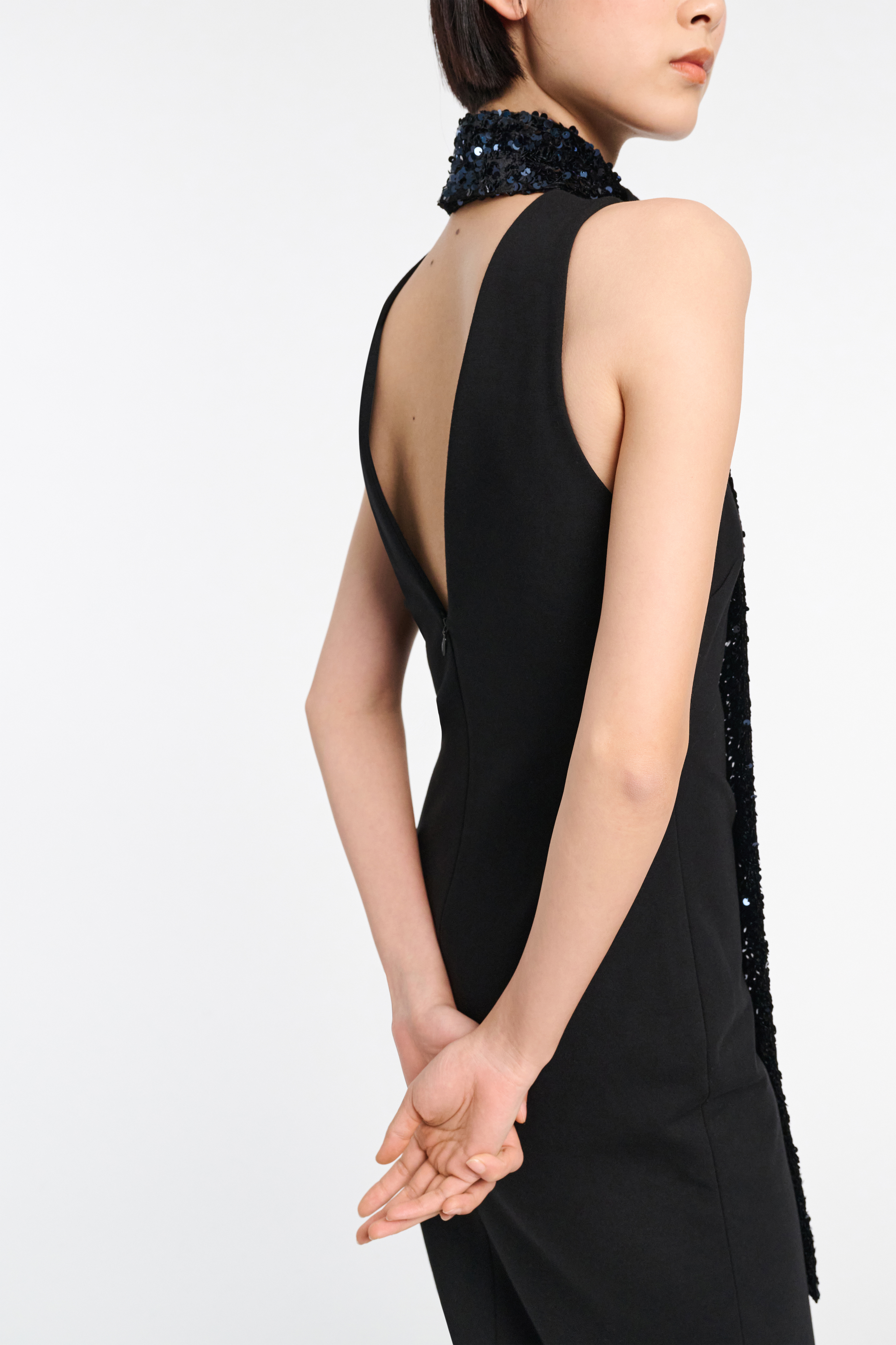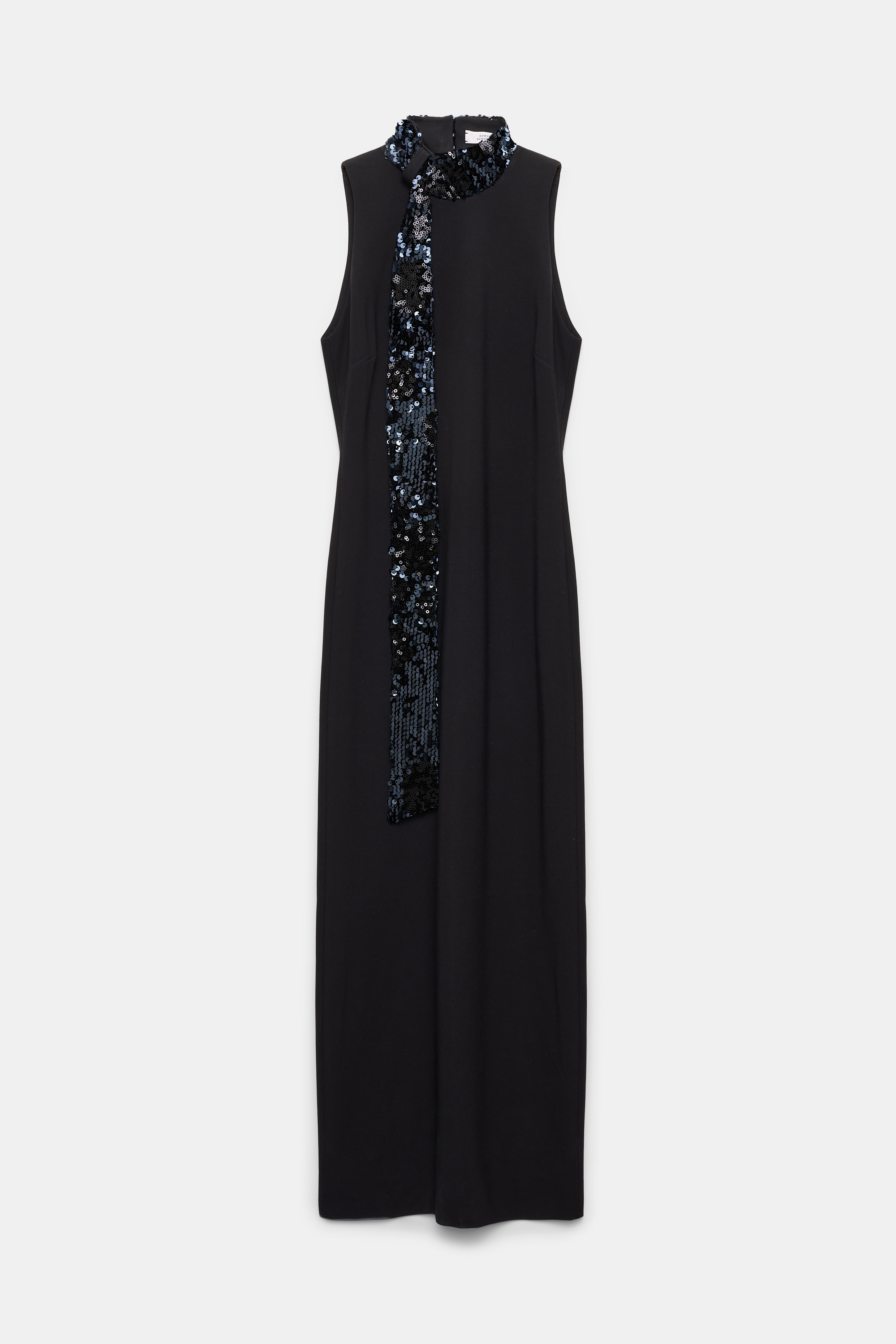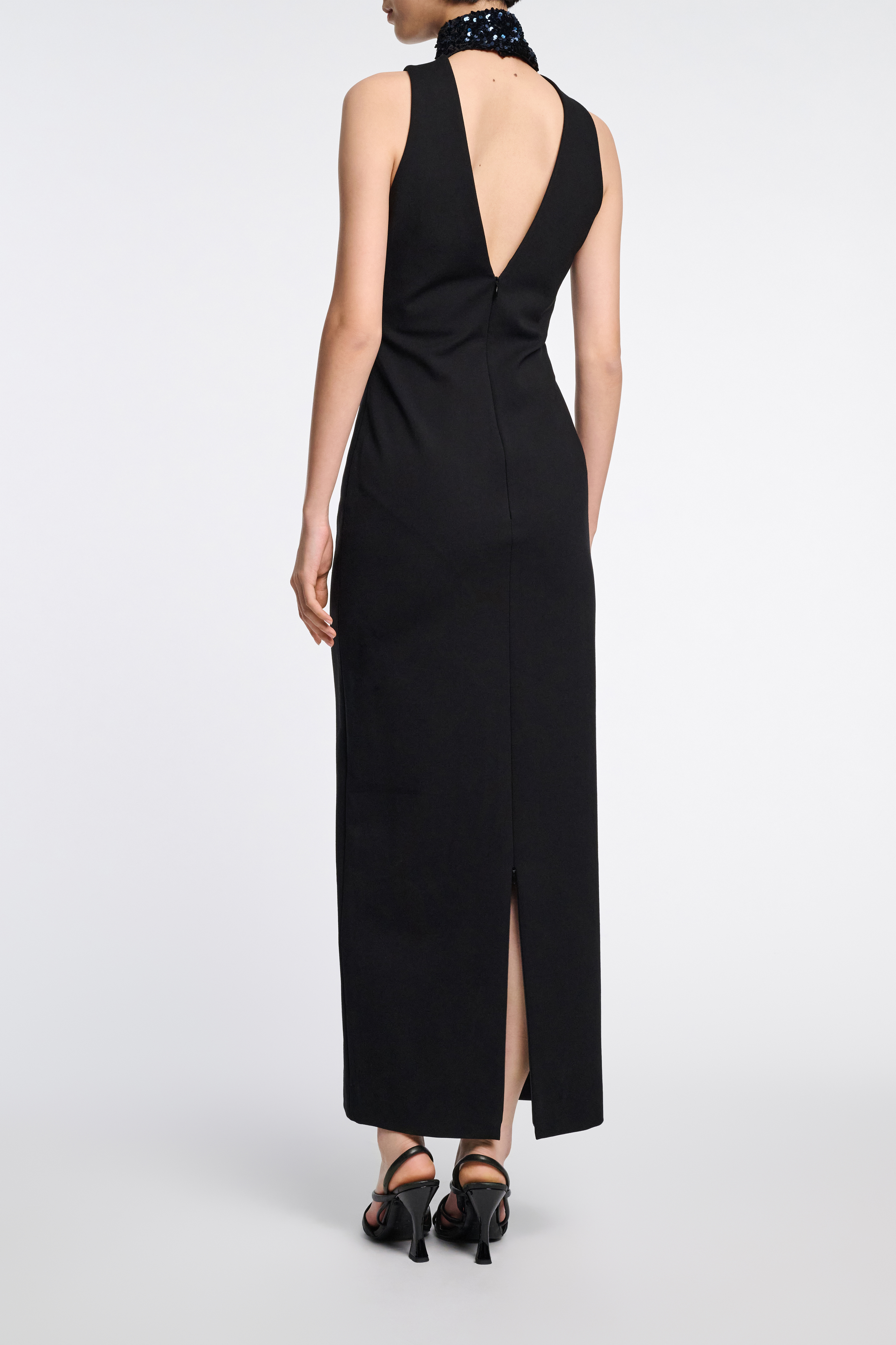 The sleeveless dress is crafted in Punto Milano and has a floor-grazing length.