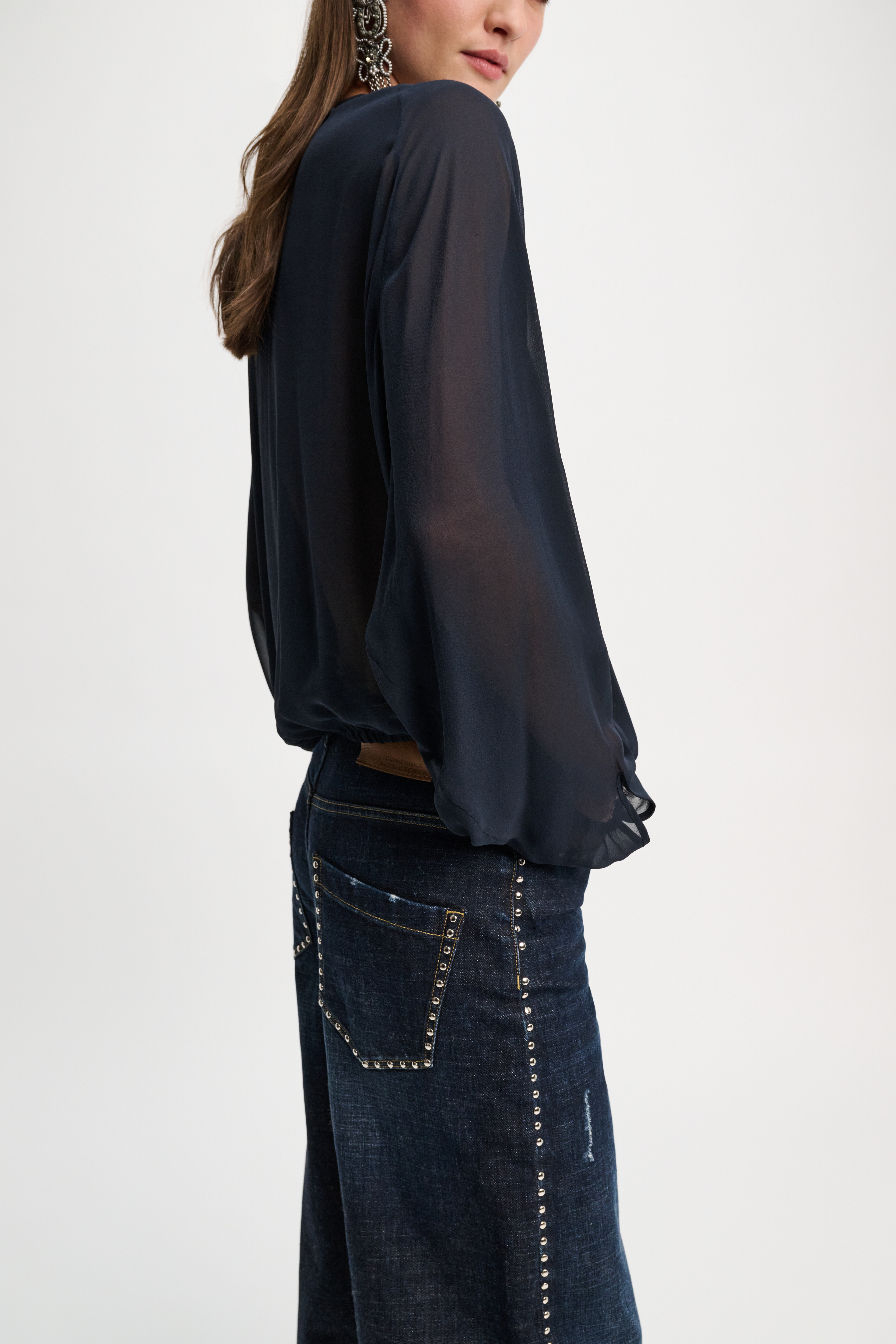 The silk georgette blouse has a Western-inspired plastron and wide batwing sleeves.
