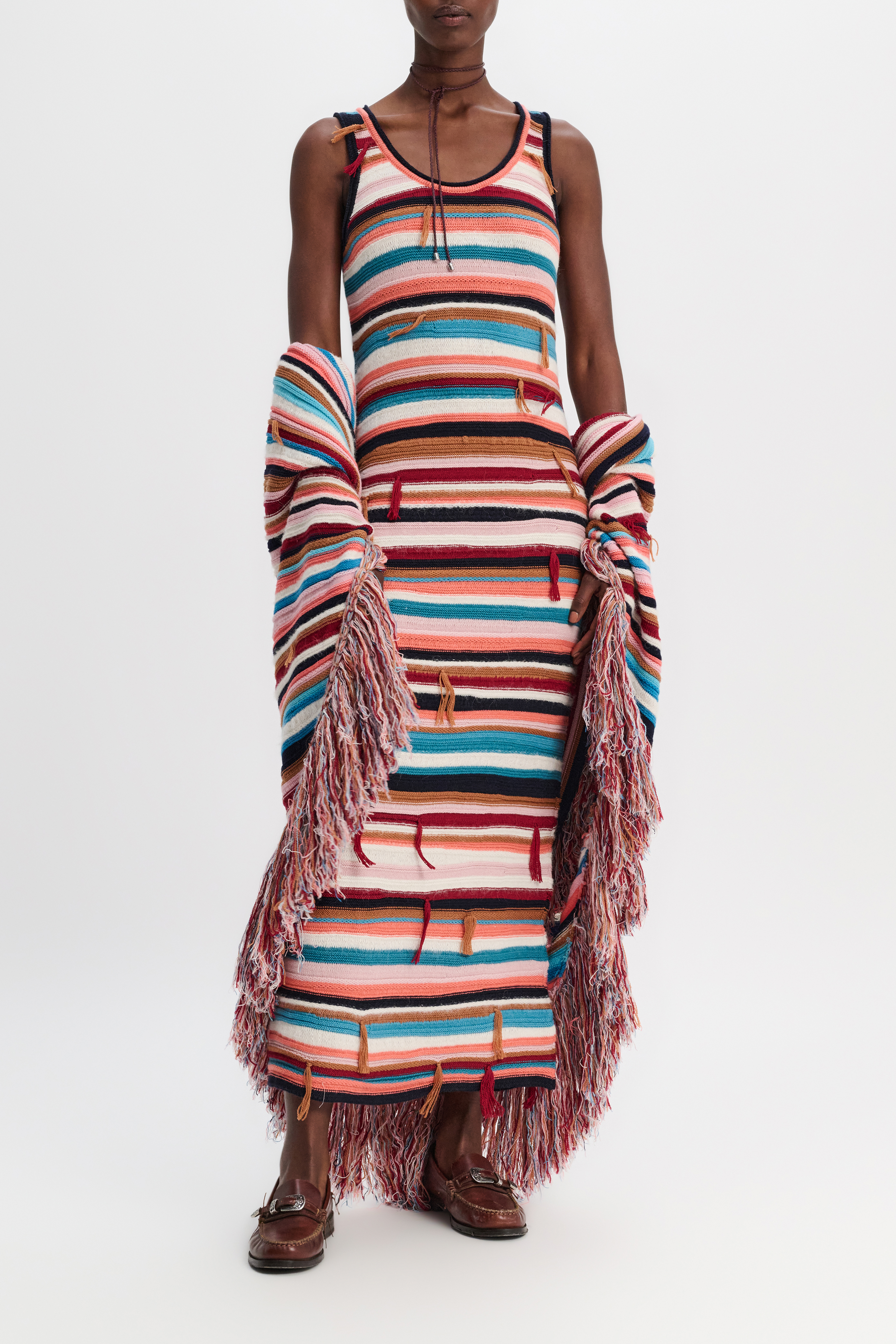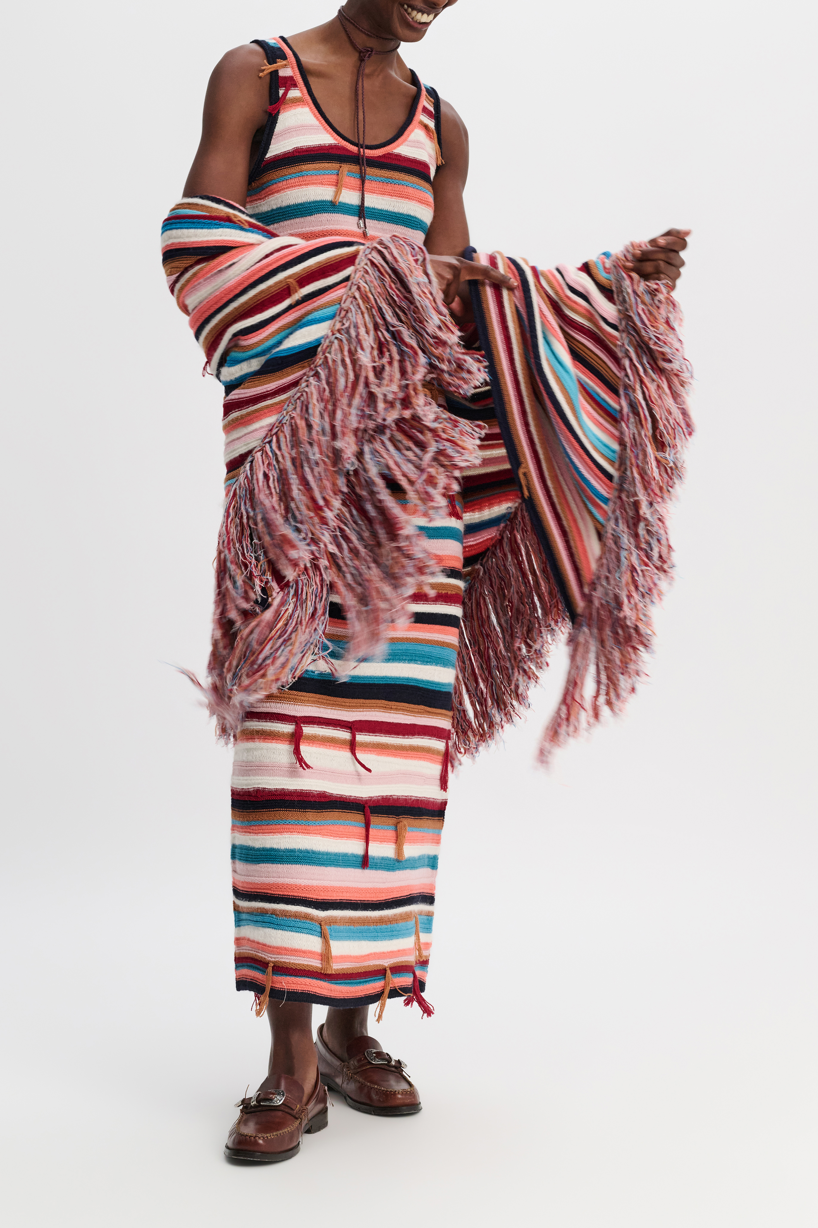The poncho has XL fringe trim and minimalistic fringing throughout, which underlines the tactile effect of the striping.