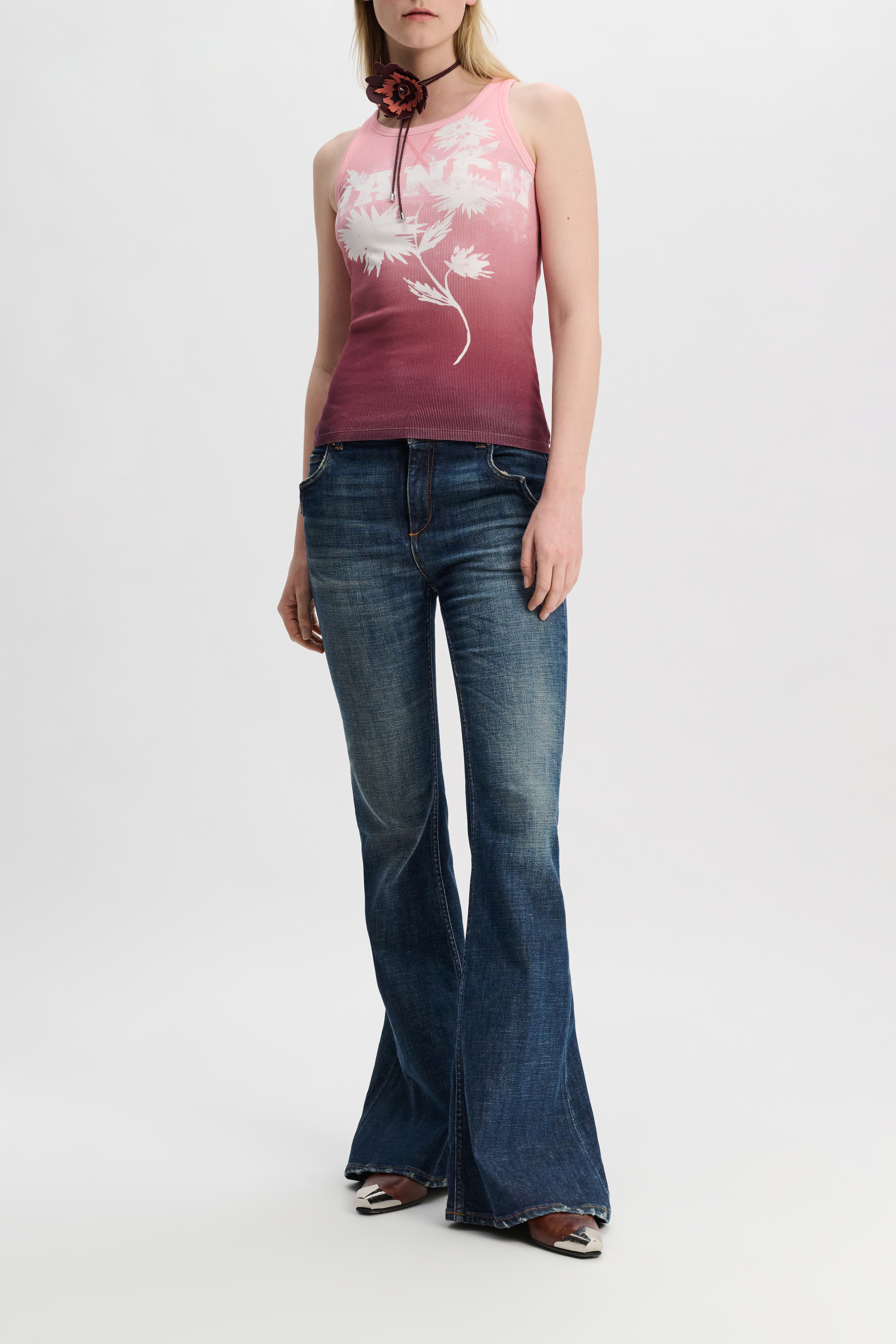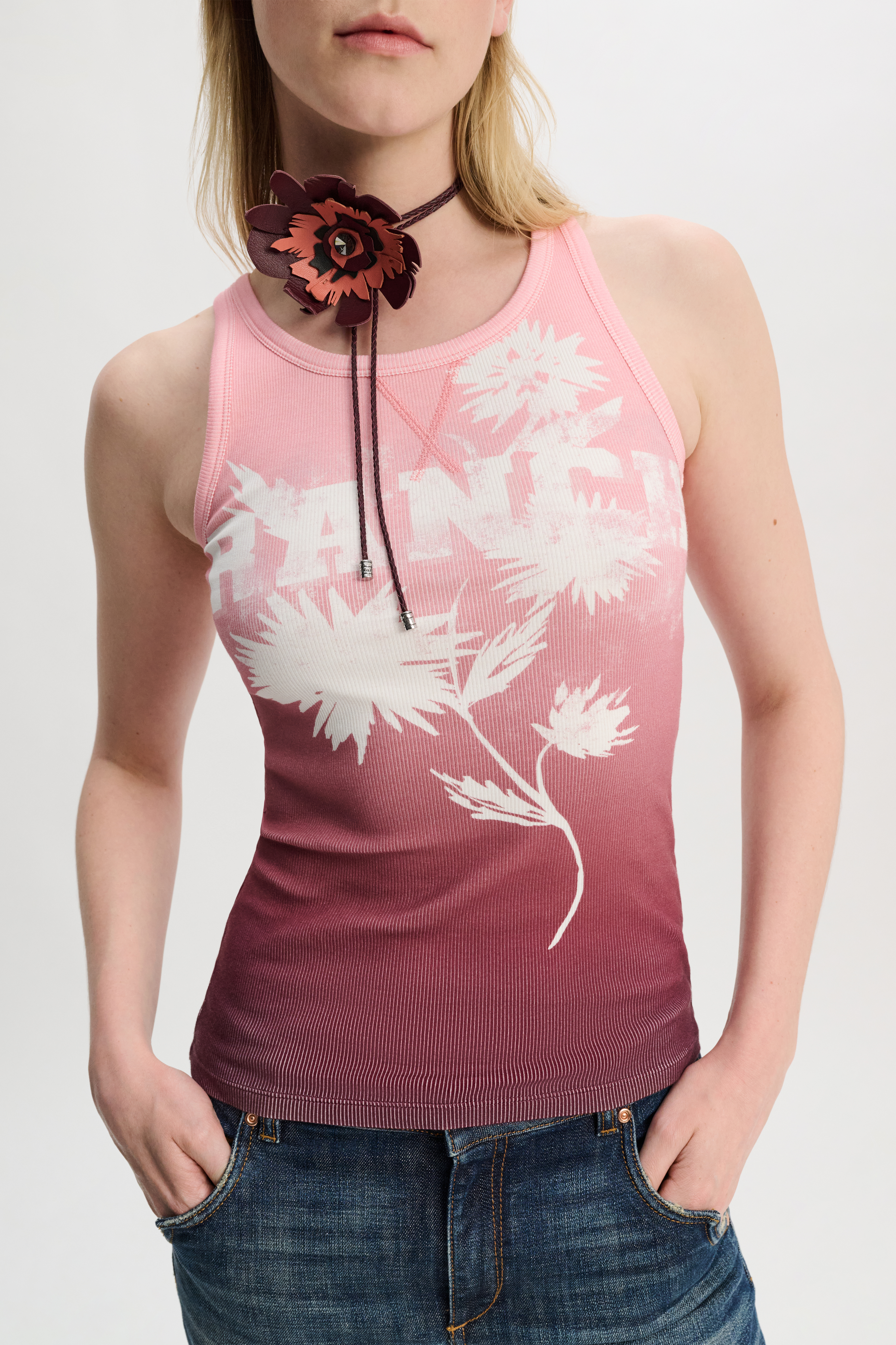 The color fade cotton tank top is covered with flowers and a lettered "RANCH" print.