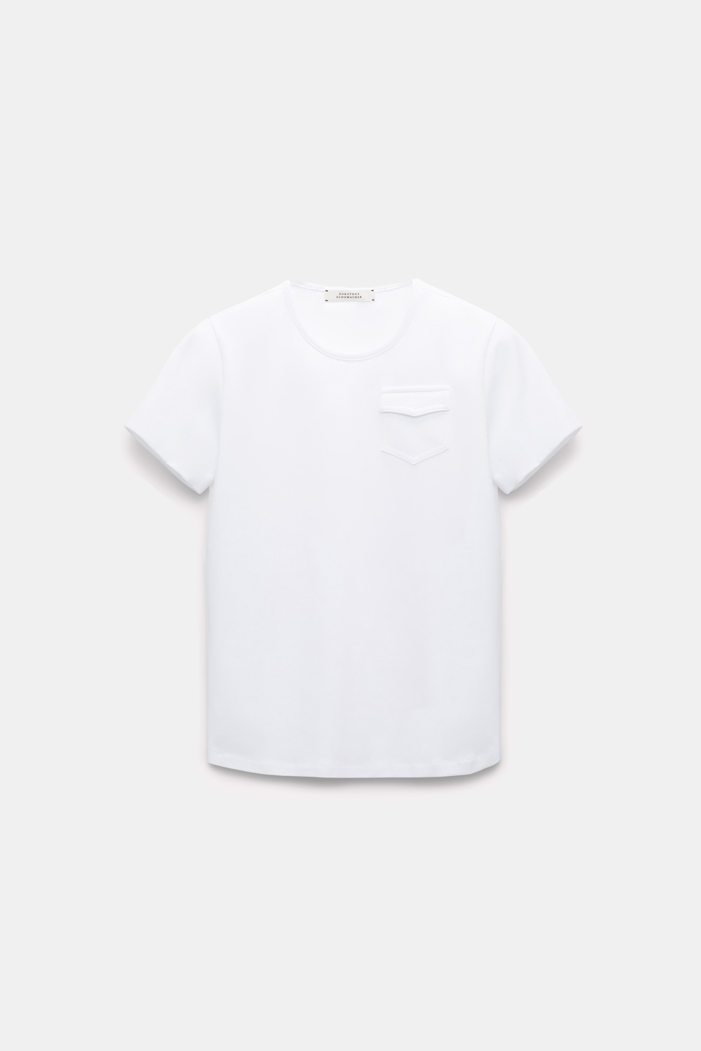 The stretch cotton style has a round neckline and pointed mini flap pocket.