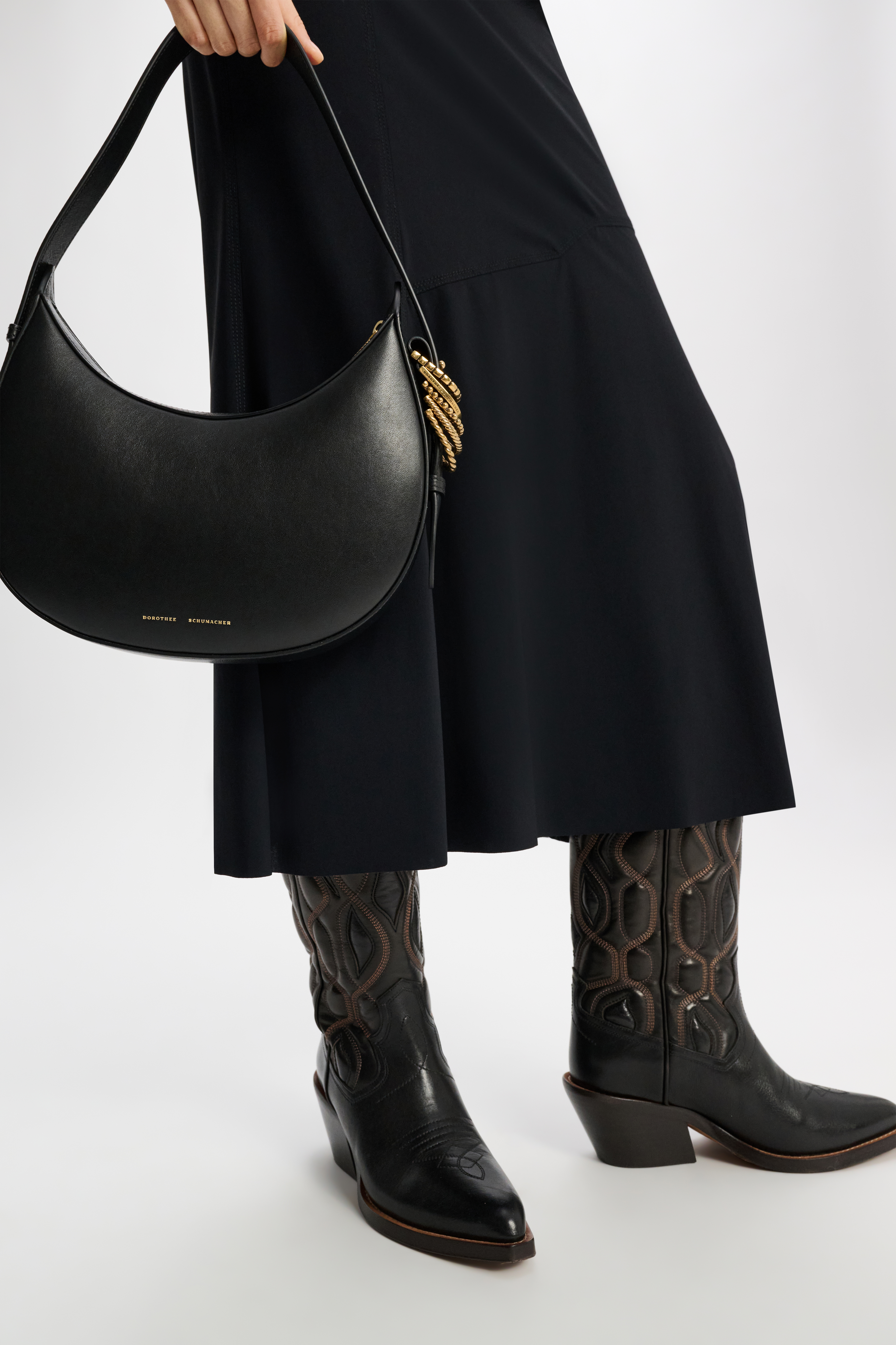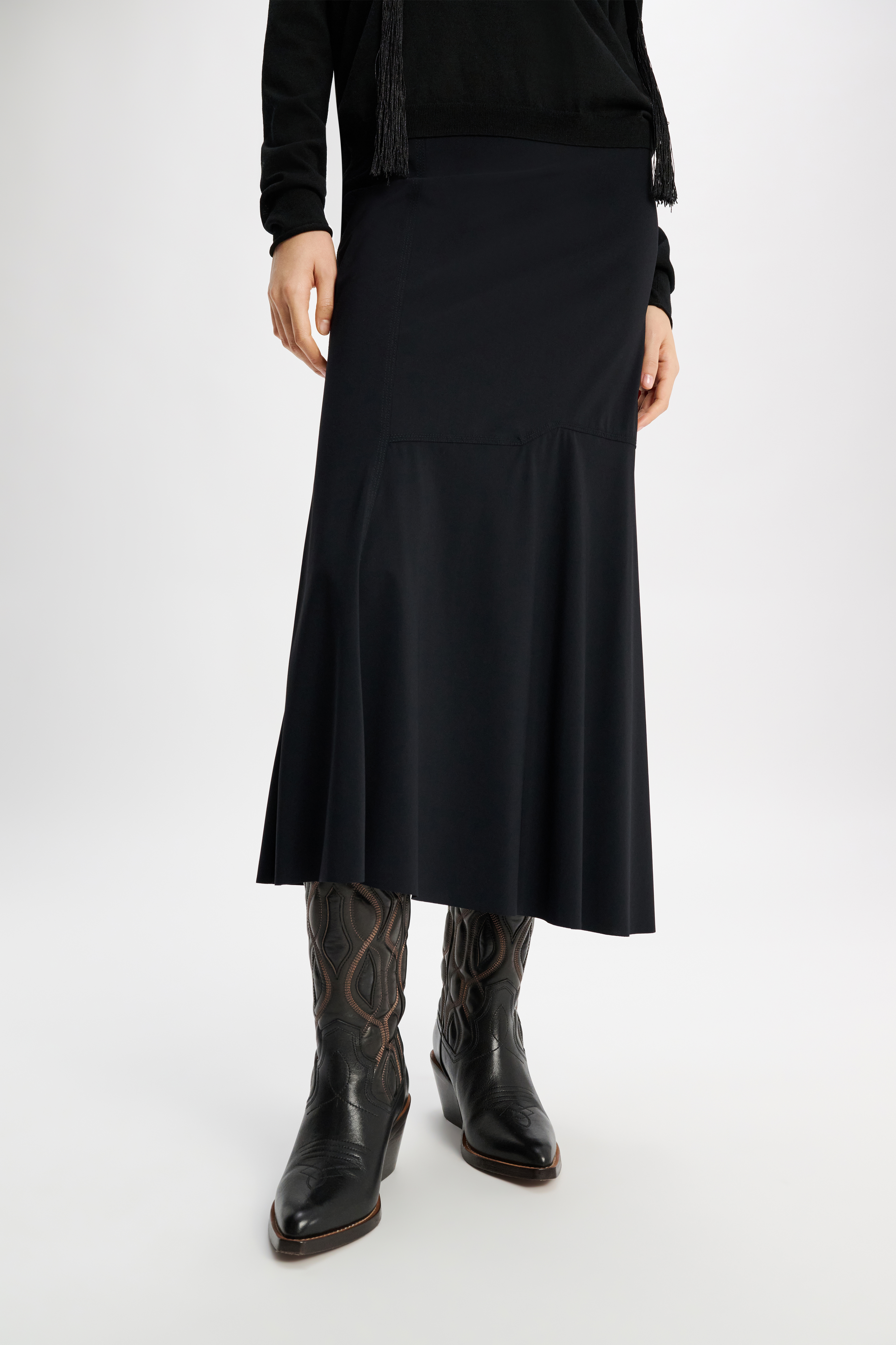 The midi style has an elastic waistline and falls softly into an asymmetric drape.