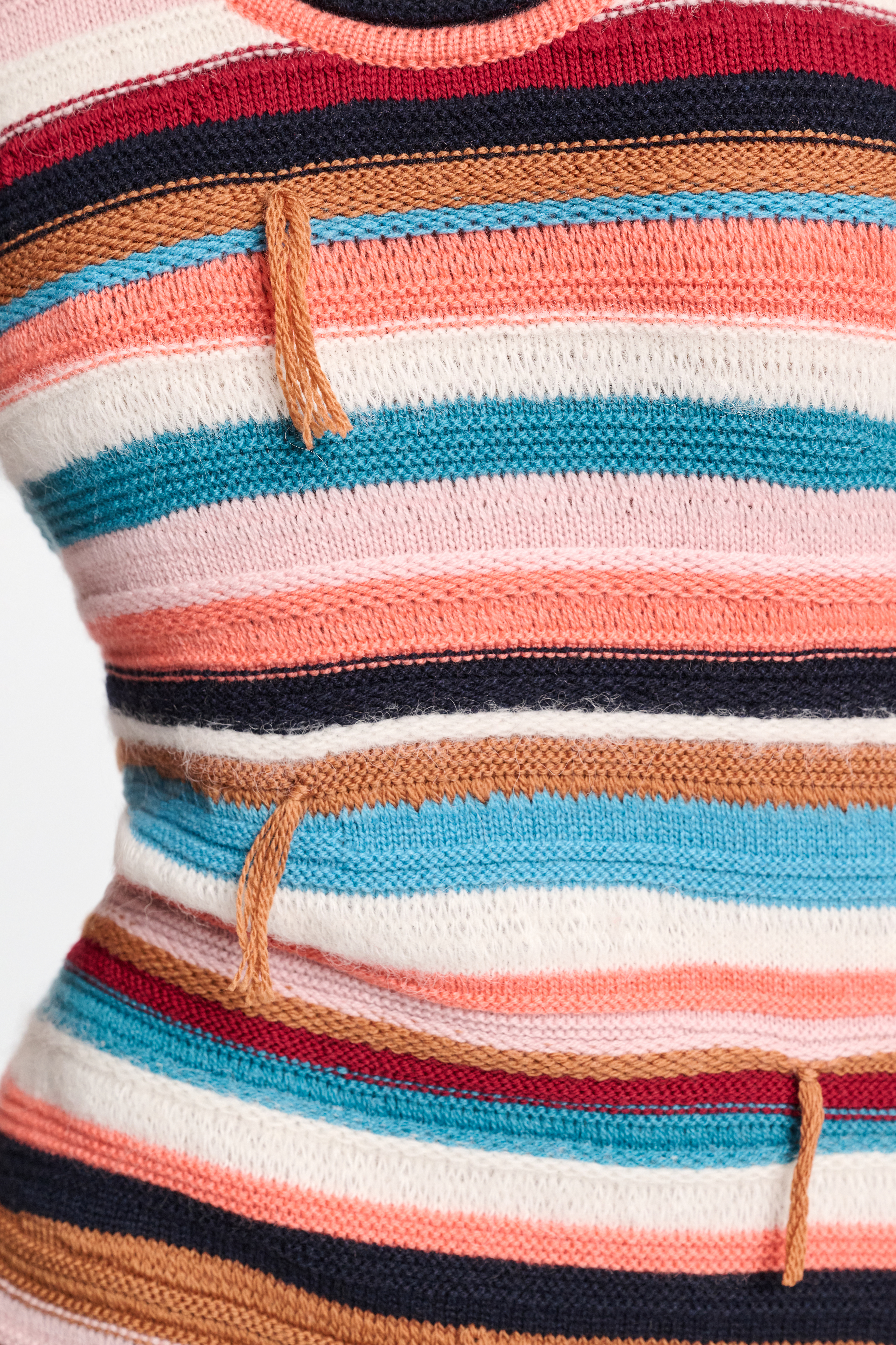The dress has a pretty scoop neckline and minimalistic fringing, which underlines the tactile effect of the mixed texture striping.