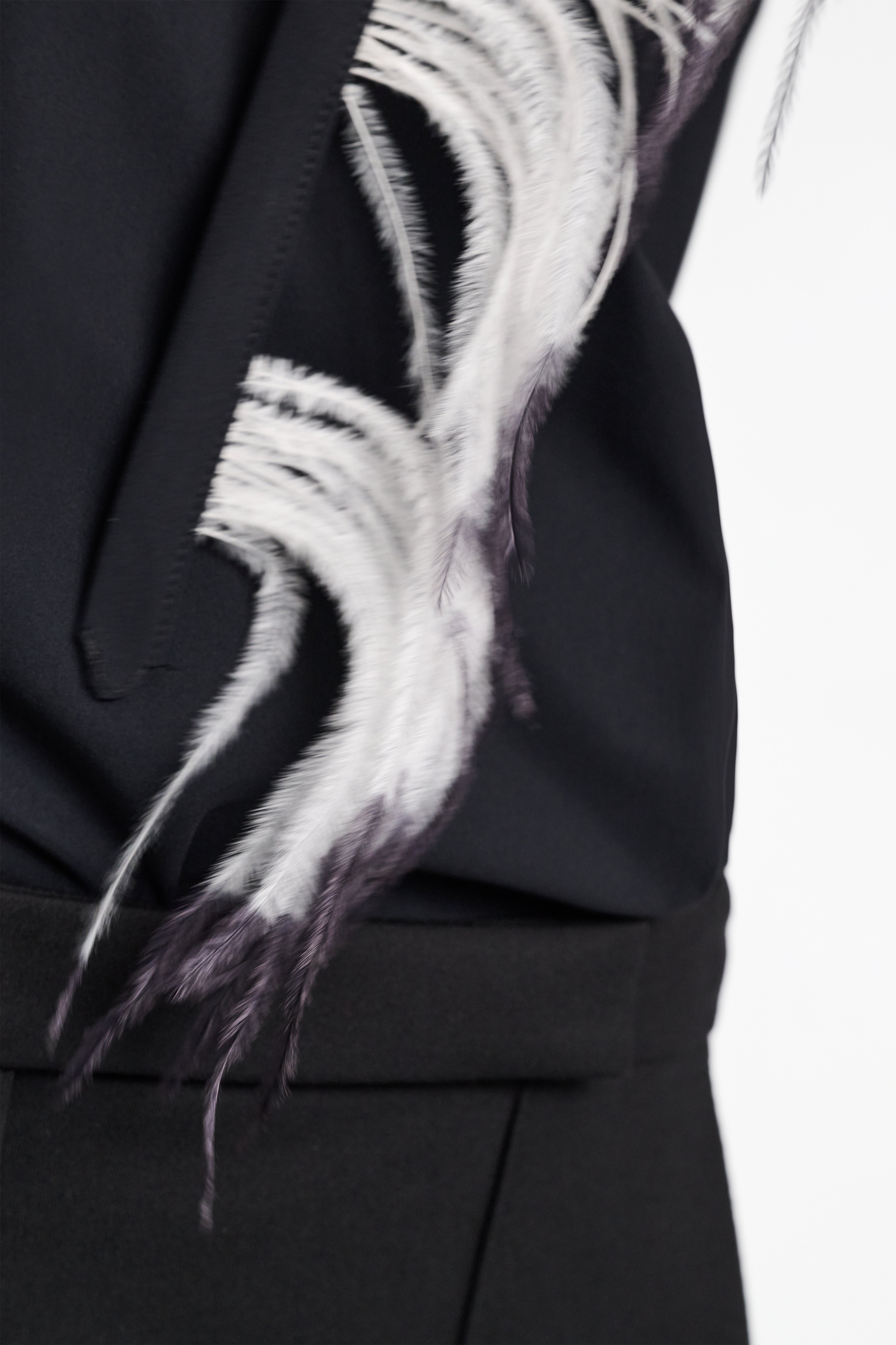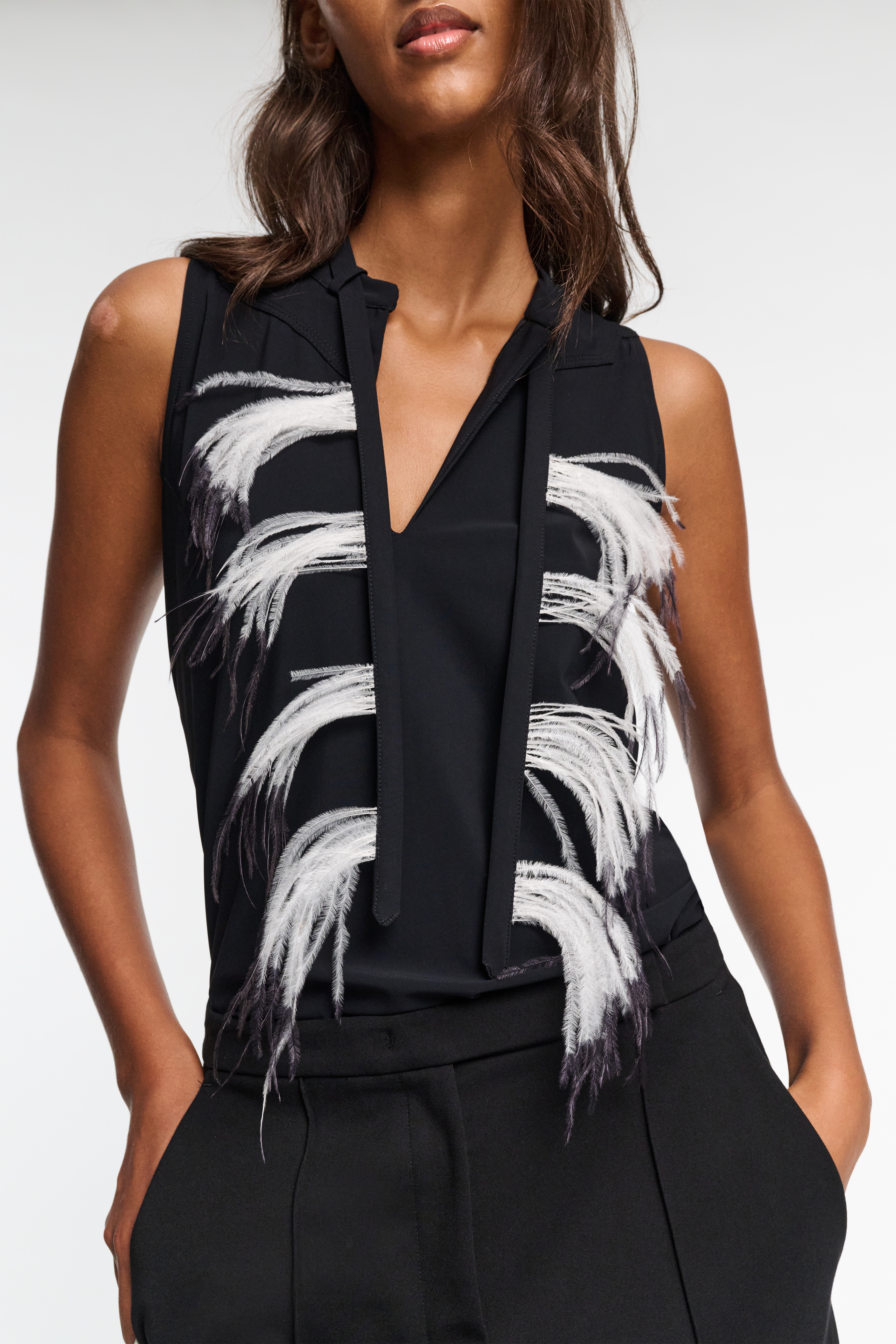 The sleeveless top has a silk paneled front and a removable feather tie, which drapes around the collar.