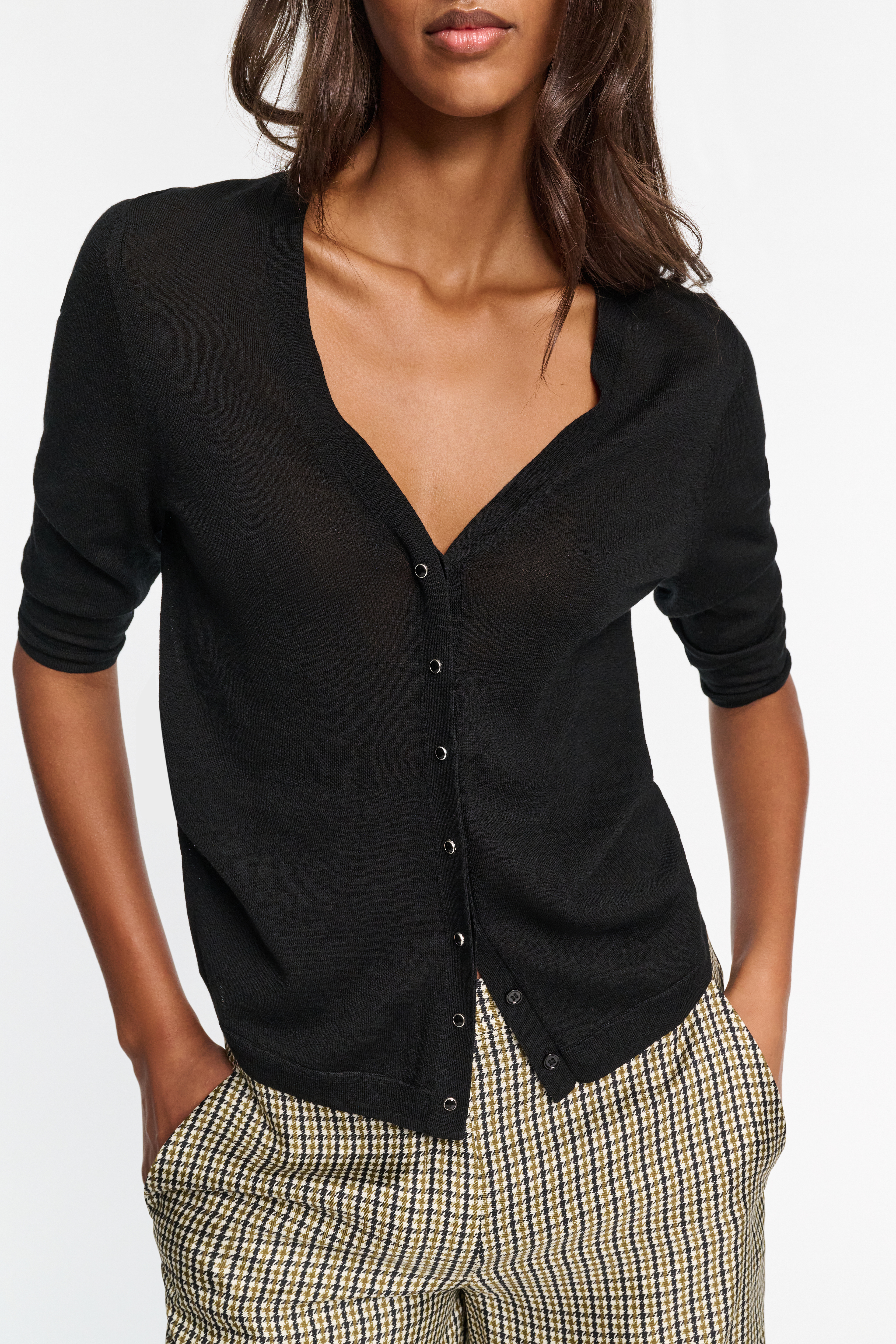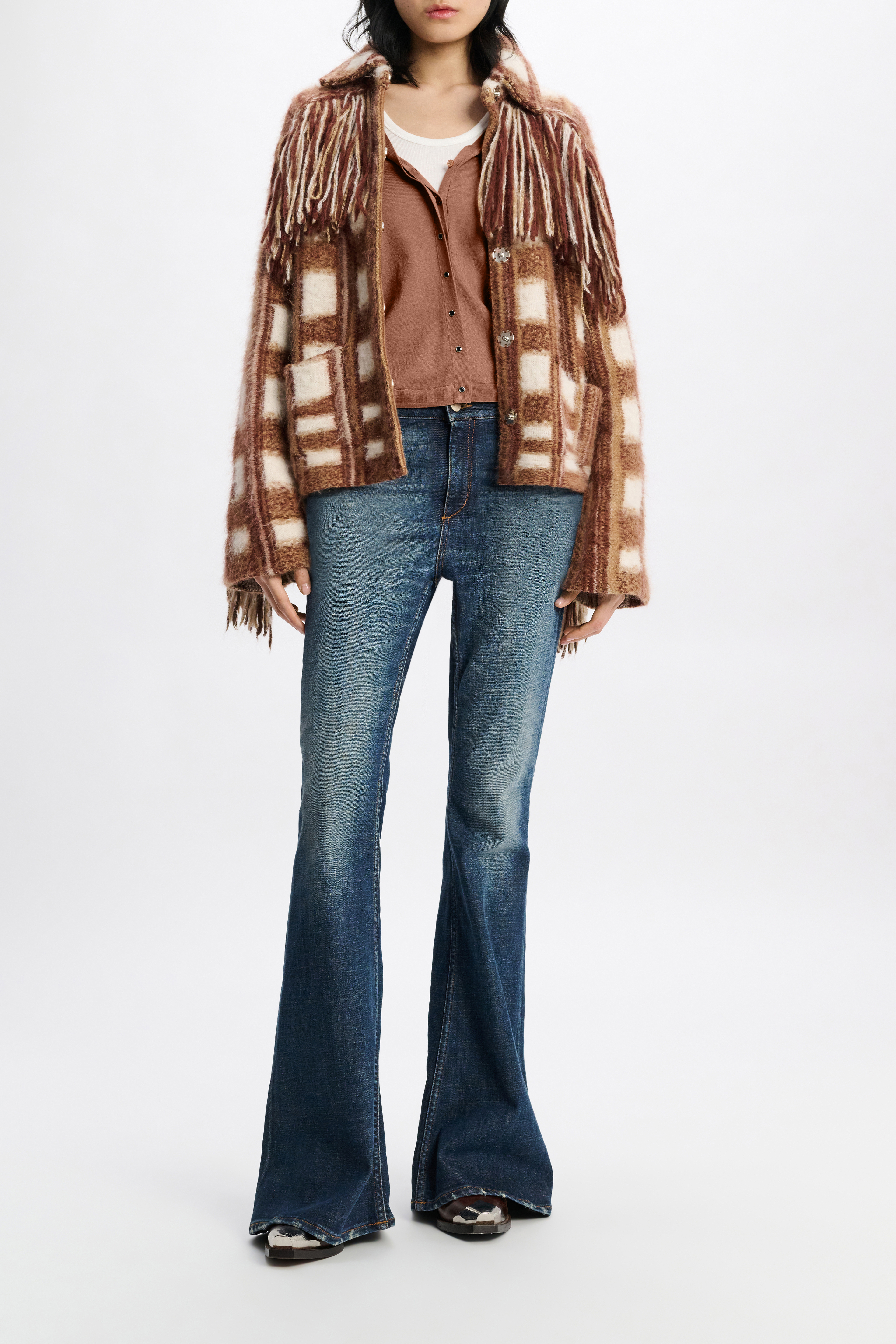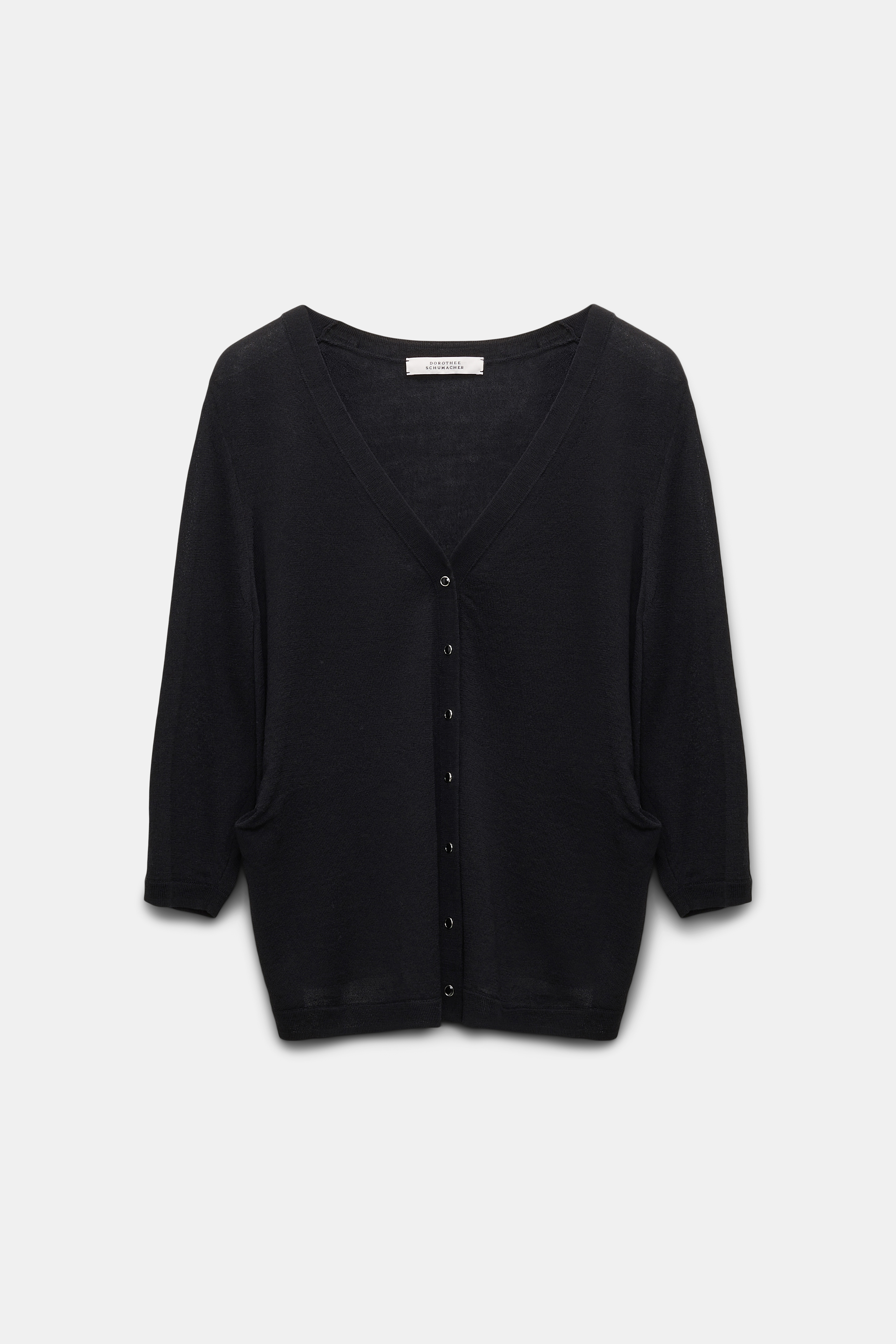 The silhouette is fitted at the hips and loosely fitted on the body, the back is cut noticeably shorter than the front.