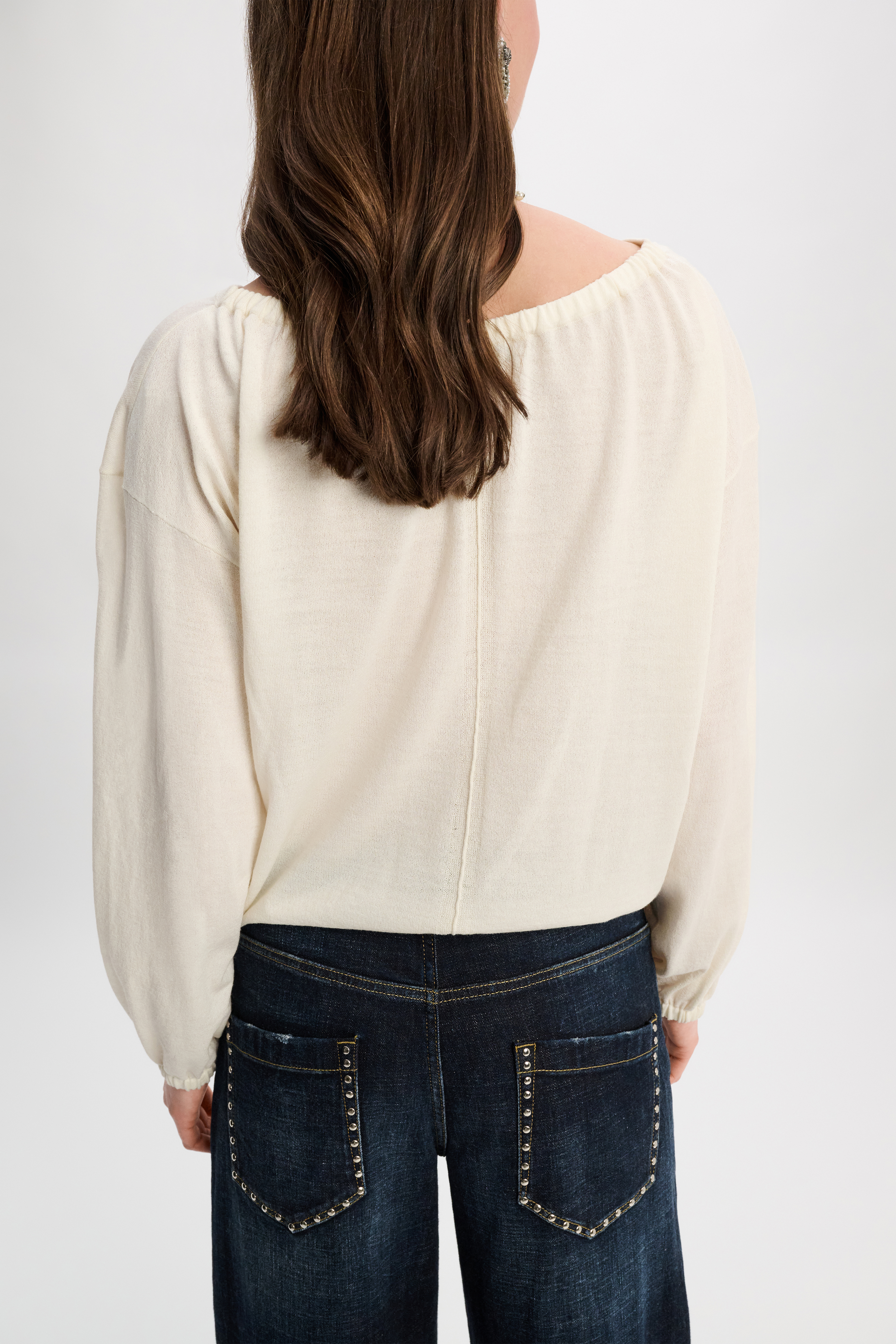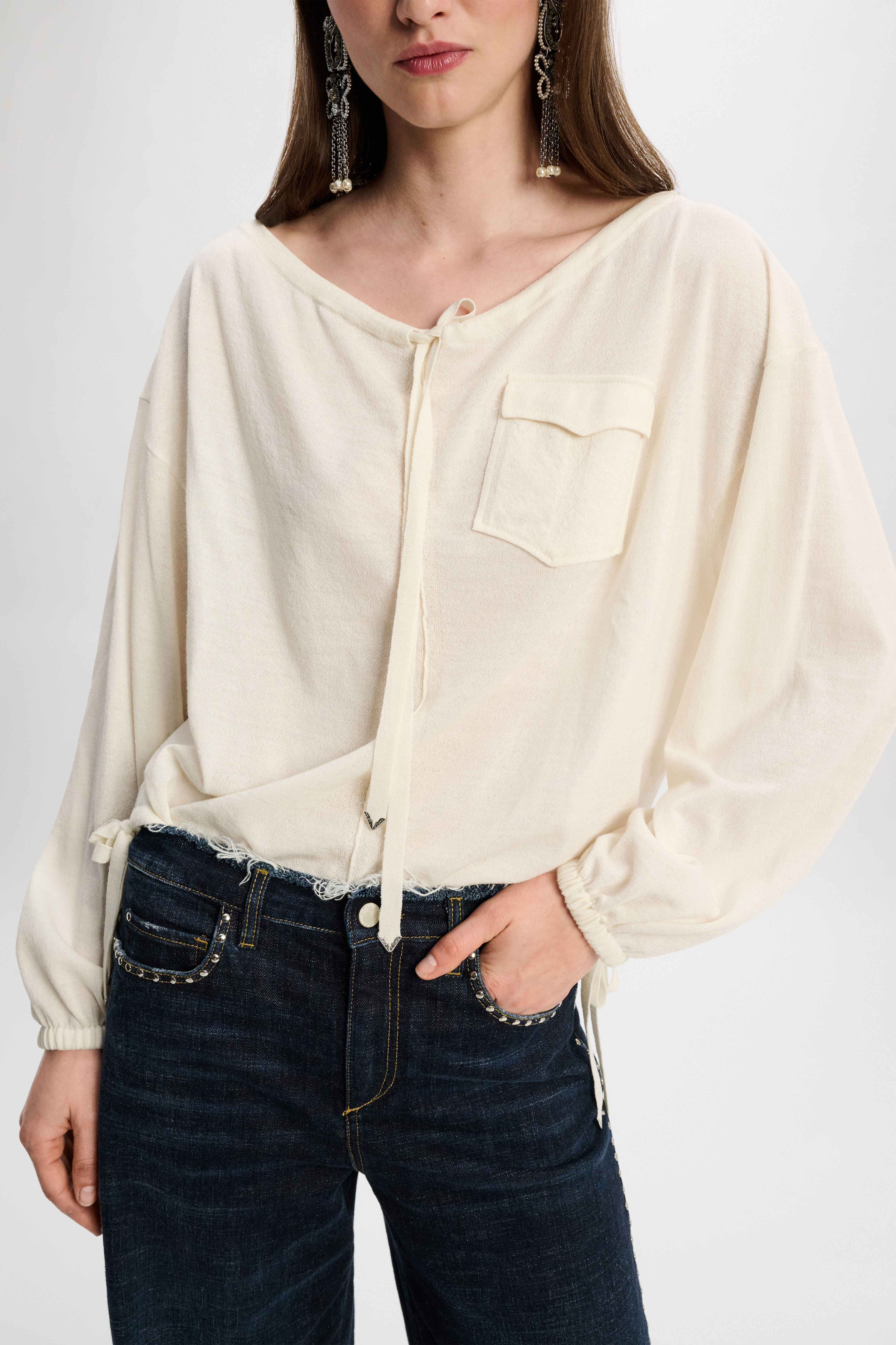 The pullover has a Western-inspired pocket and gathered cuffs - which create blousy volume in the sleeves.