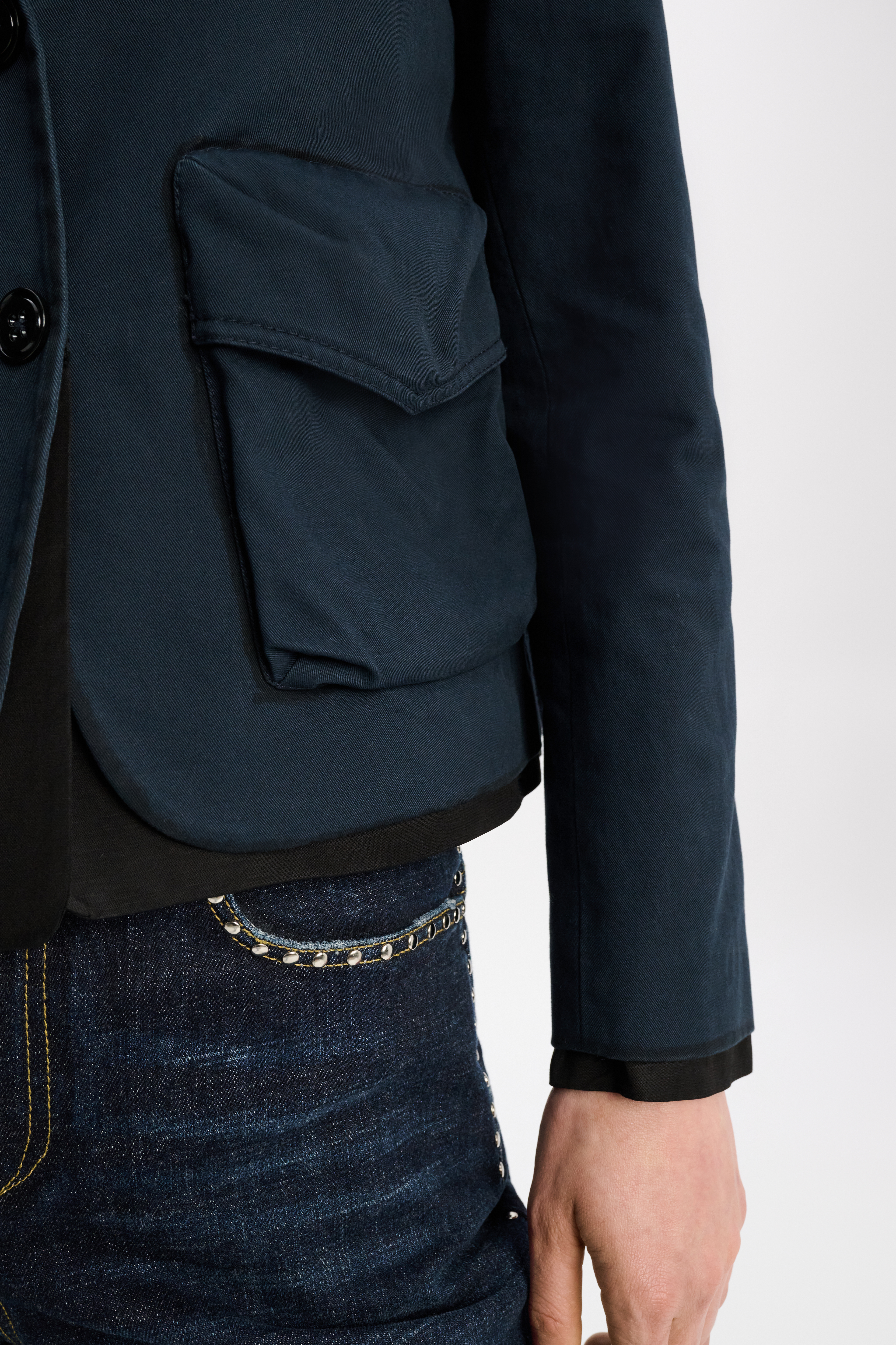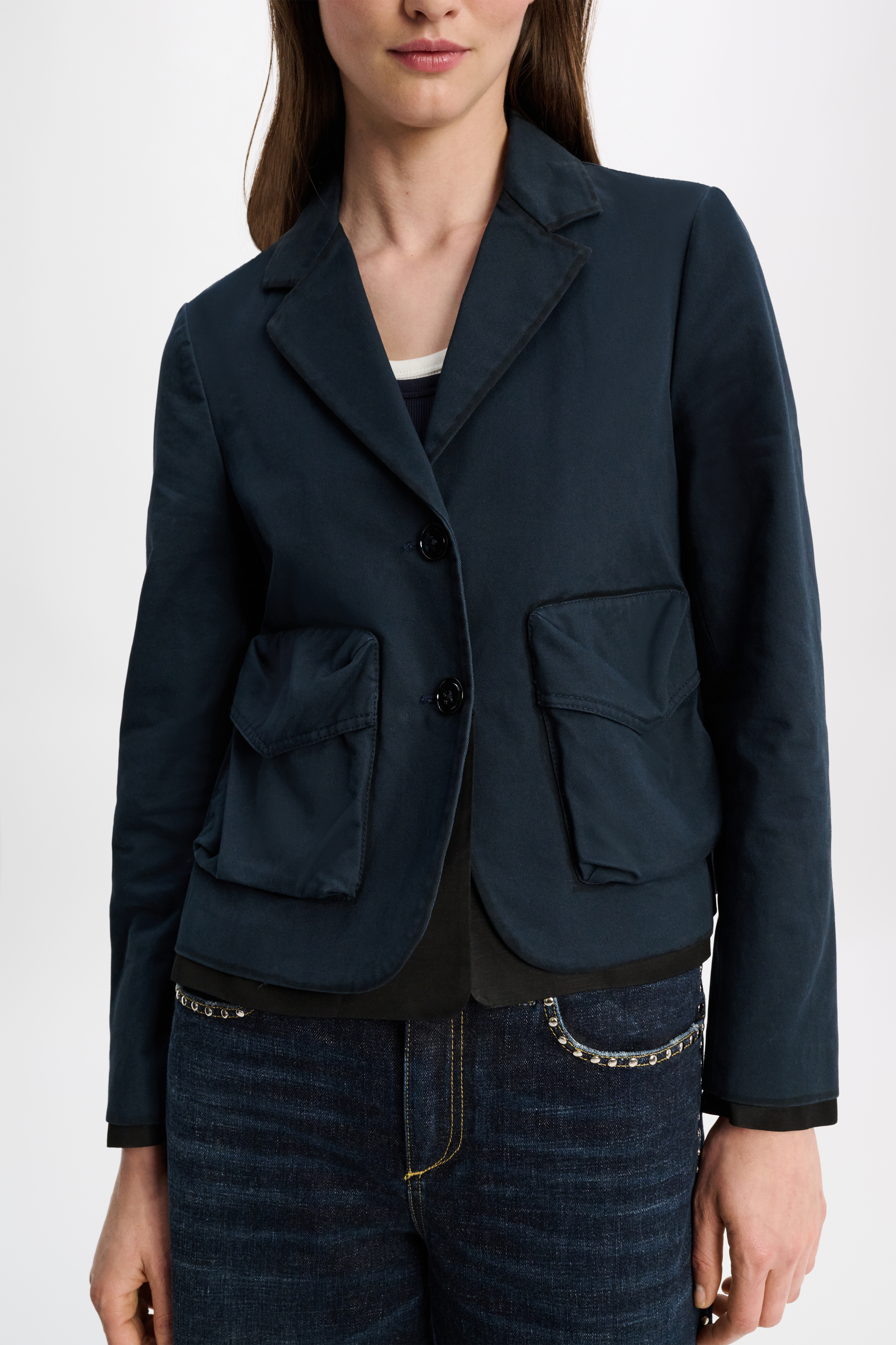 The cropped cotton blazer has tonal painted edges and bellowed flap pockets.