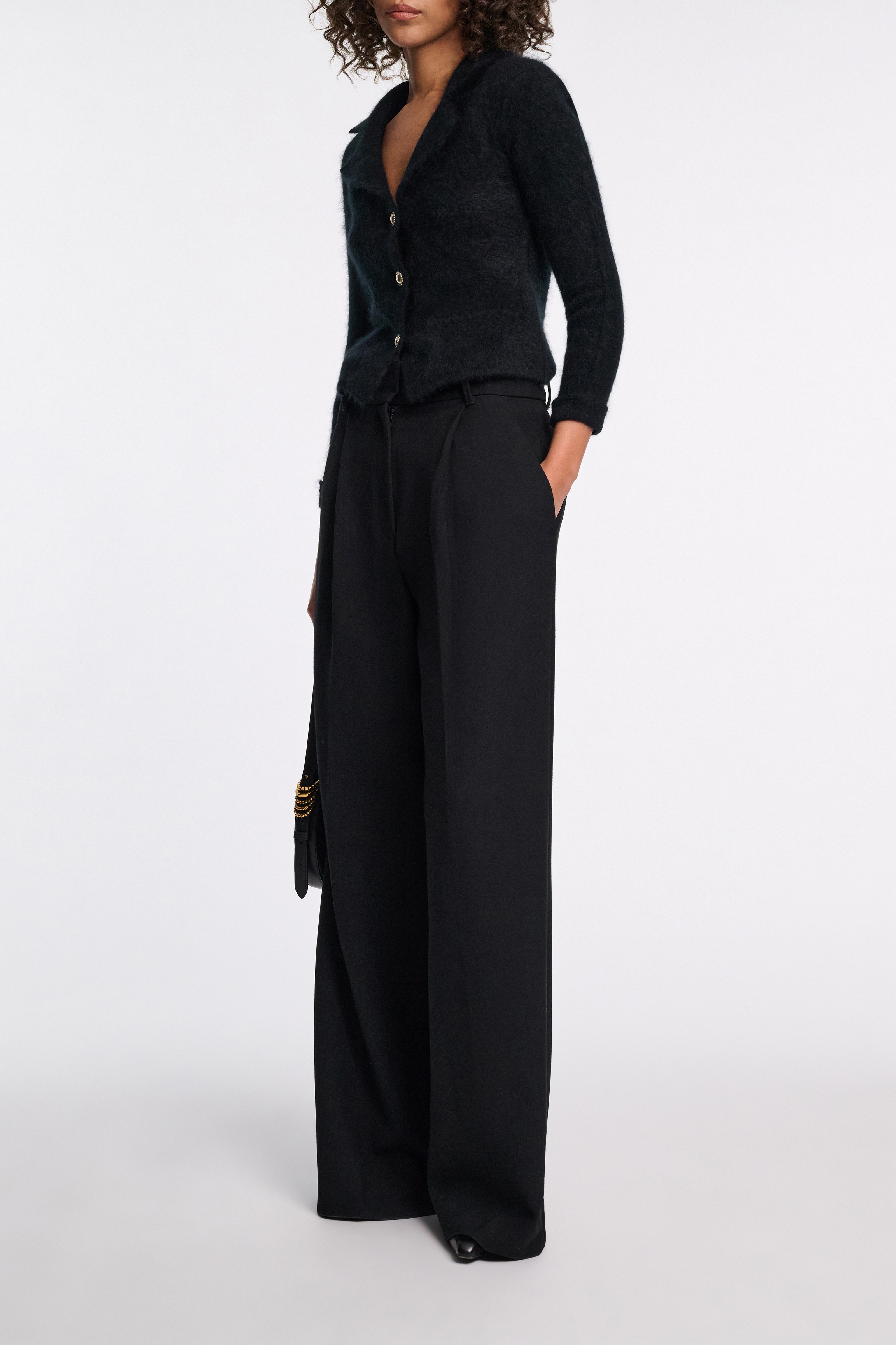 The cropped style has gold-tone buttons and shoulder pads.