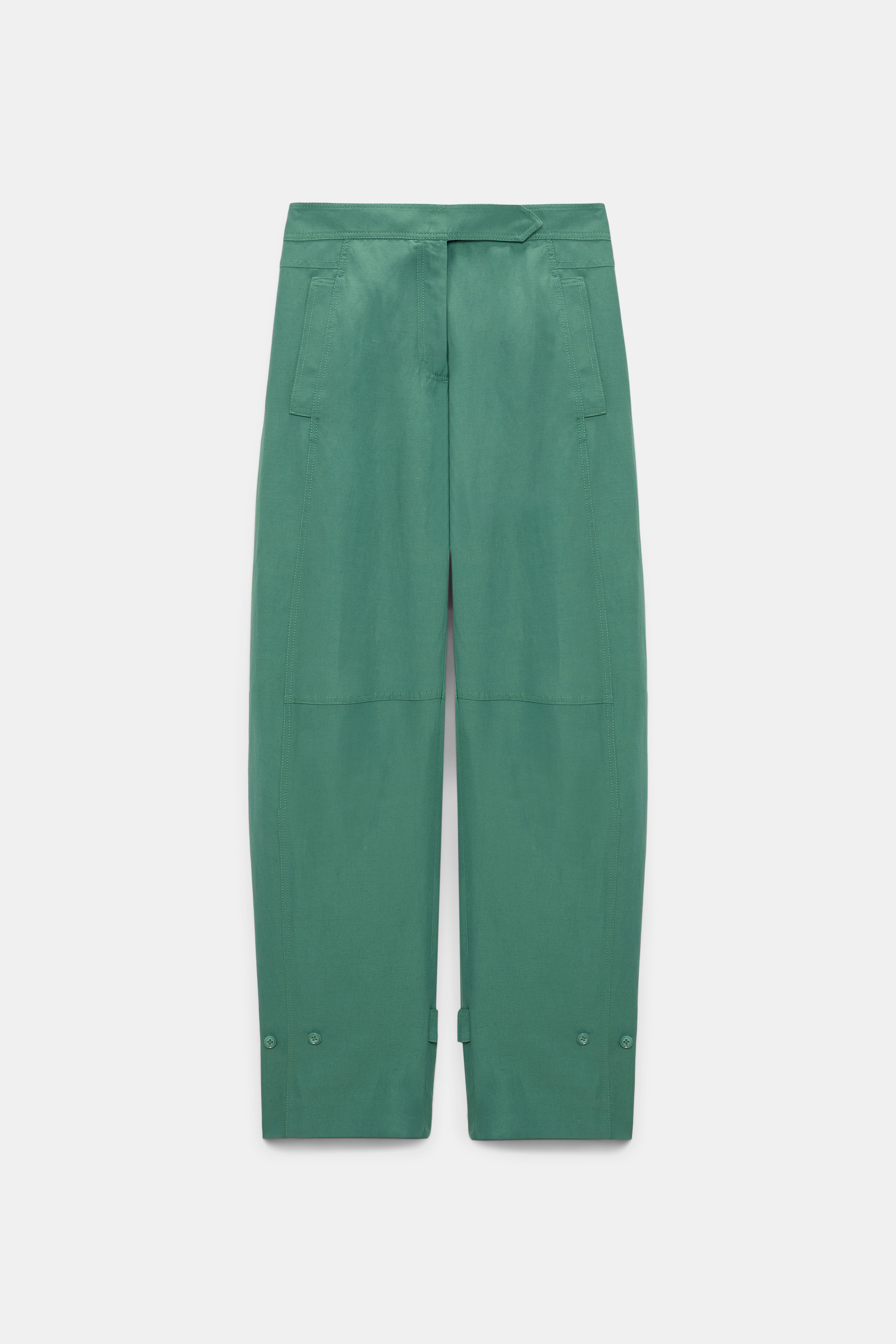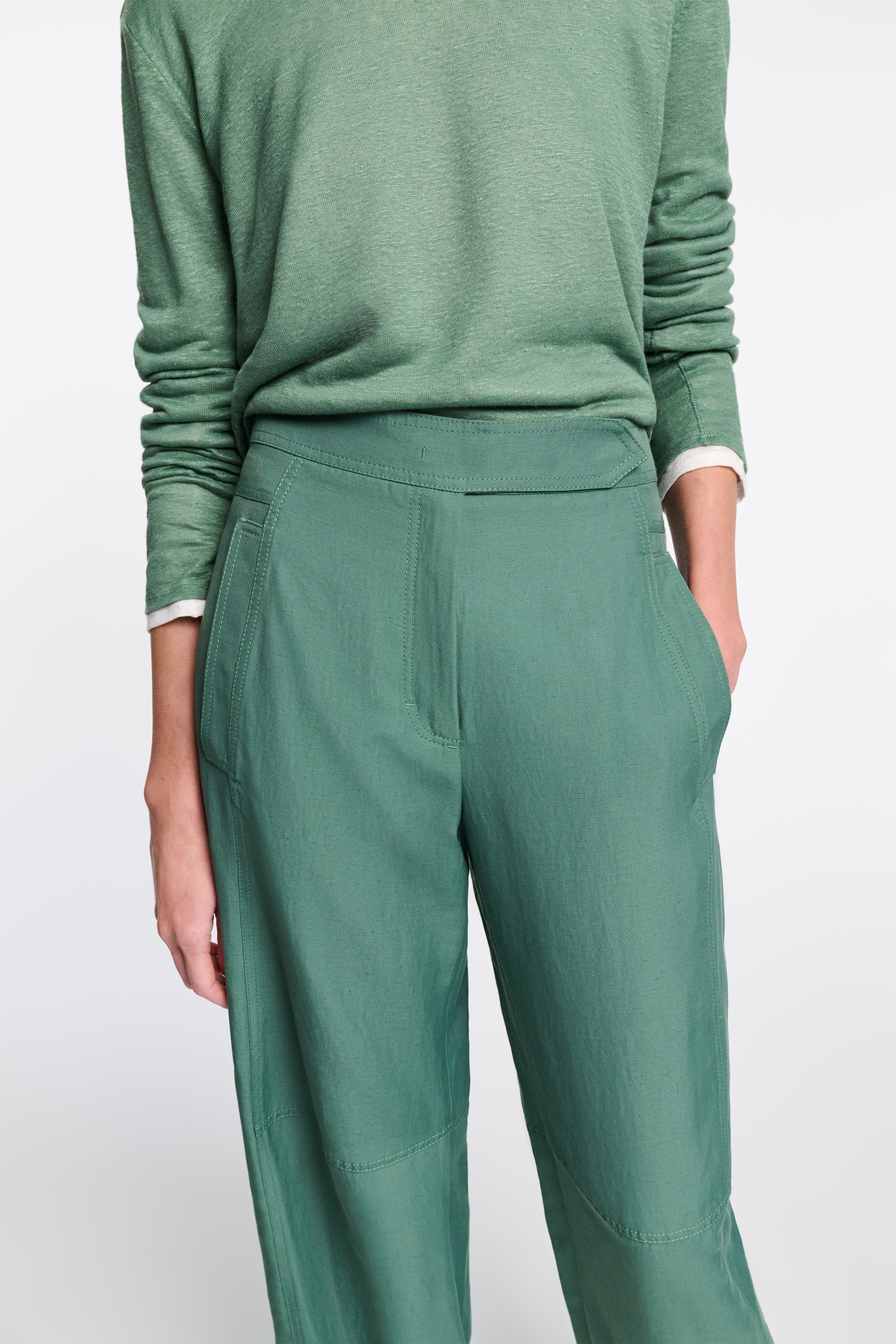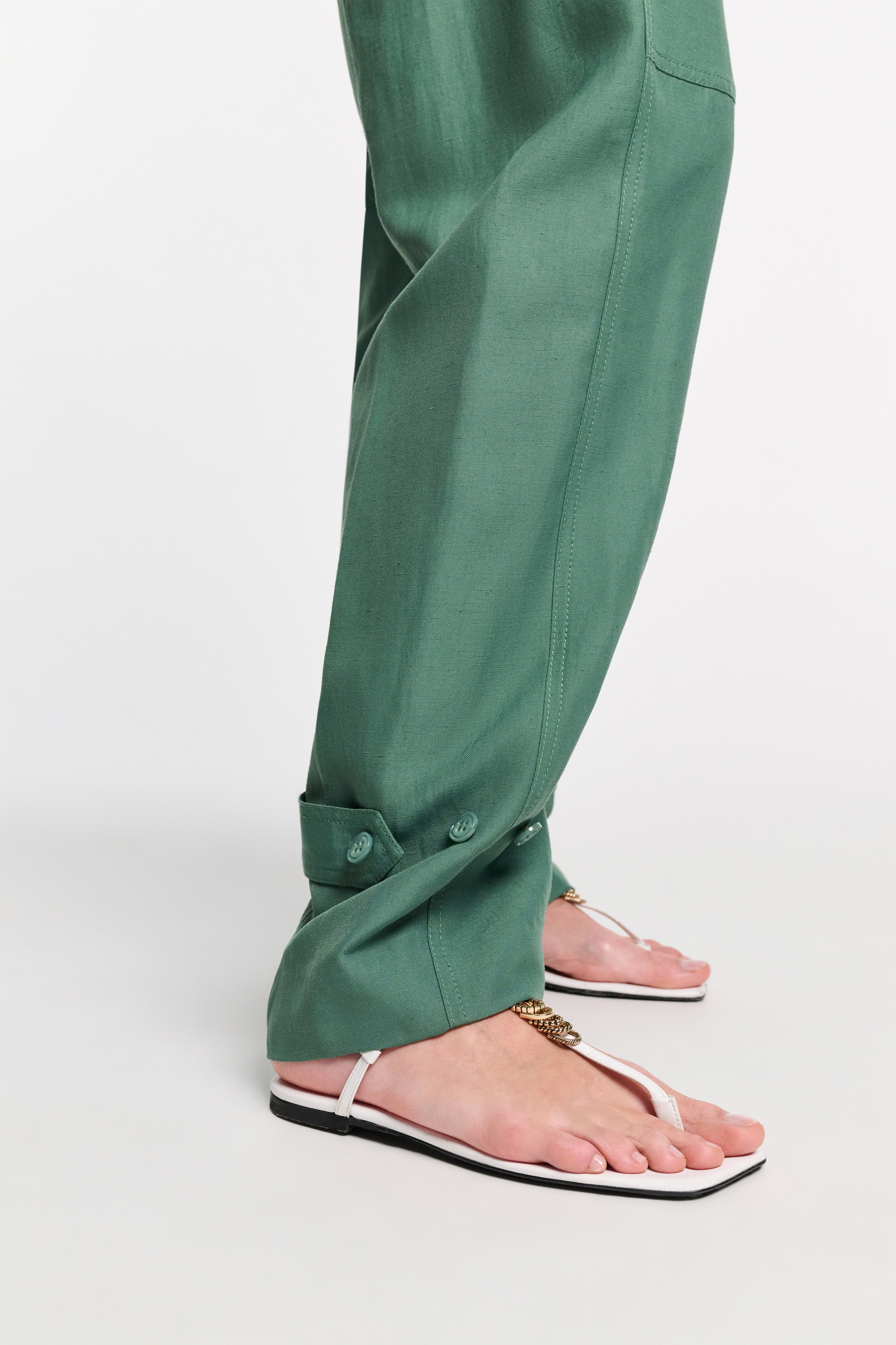 The O-leg pants are made from technical linen and have buttoned tabs at the ankles for multiple ways to style.